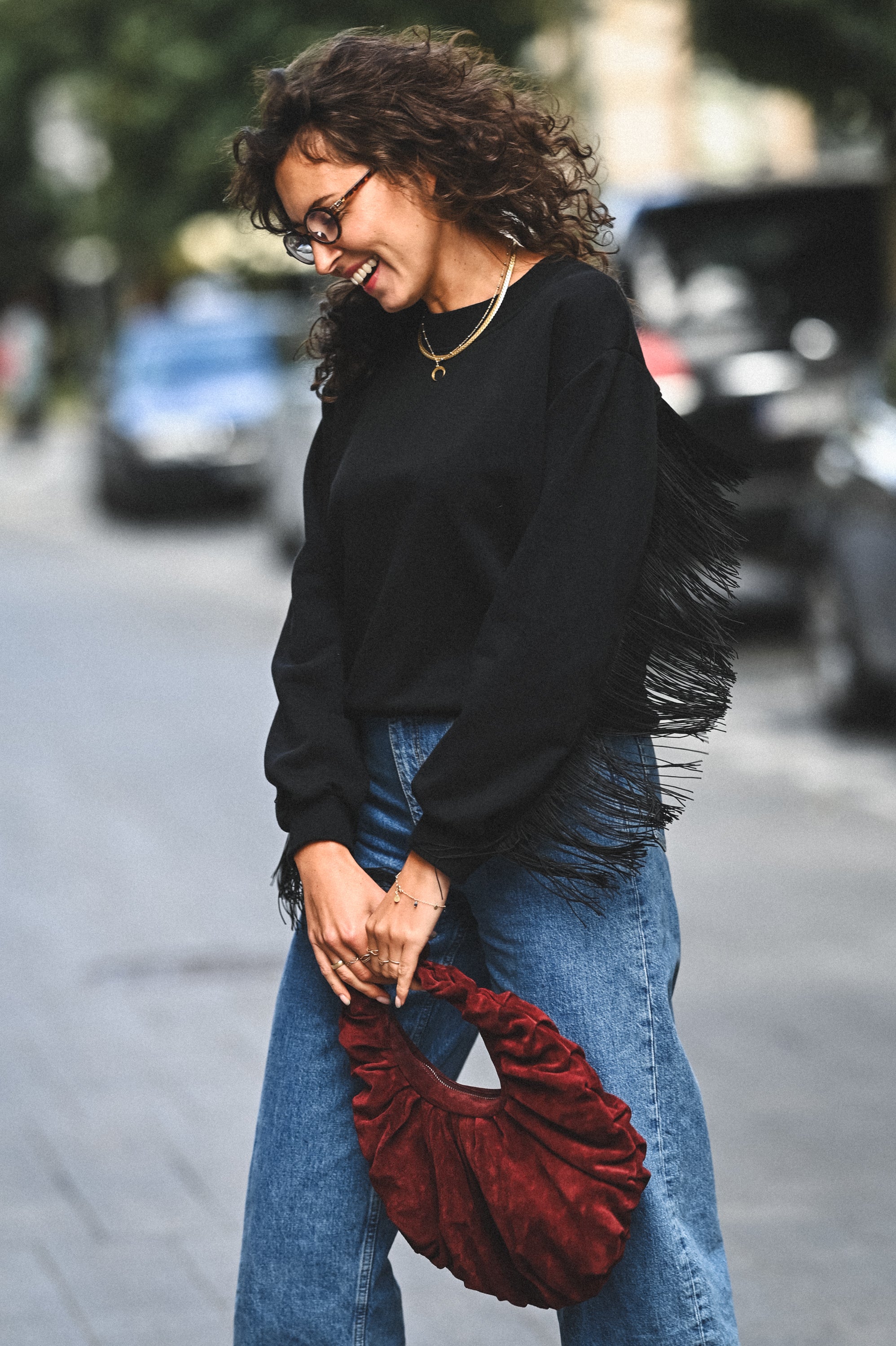 Ta bluza charakteryzuje się prostym, lekko oversizowym krojem, który zapewnia komfort i swobodę ruchów. Jej wyjątkowy design wzbogacają 1,5 metra profesjonalnych frędzli tanecznych wykonanych z wiskozy, które delikatnie opadają na plecy i rękawy, tworząc efektowny, dynamiczny detal. Bluza jest starannie wykończona ściągaczem, co dodaje jej sportowego charakteru i dba o wygodę noszenia. Idealna na co dzień, jak i do bardziej kreatywnych stylizacji, łącząca wyjątkowy styl z luzem.