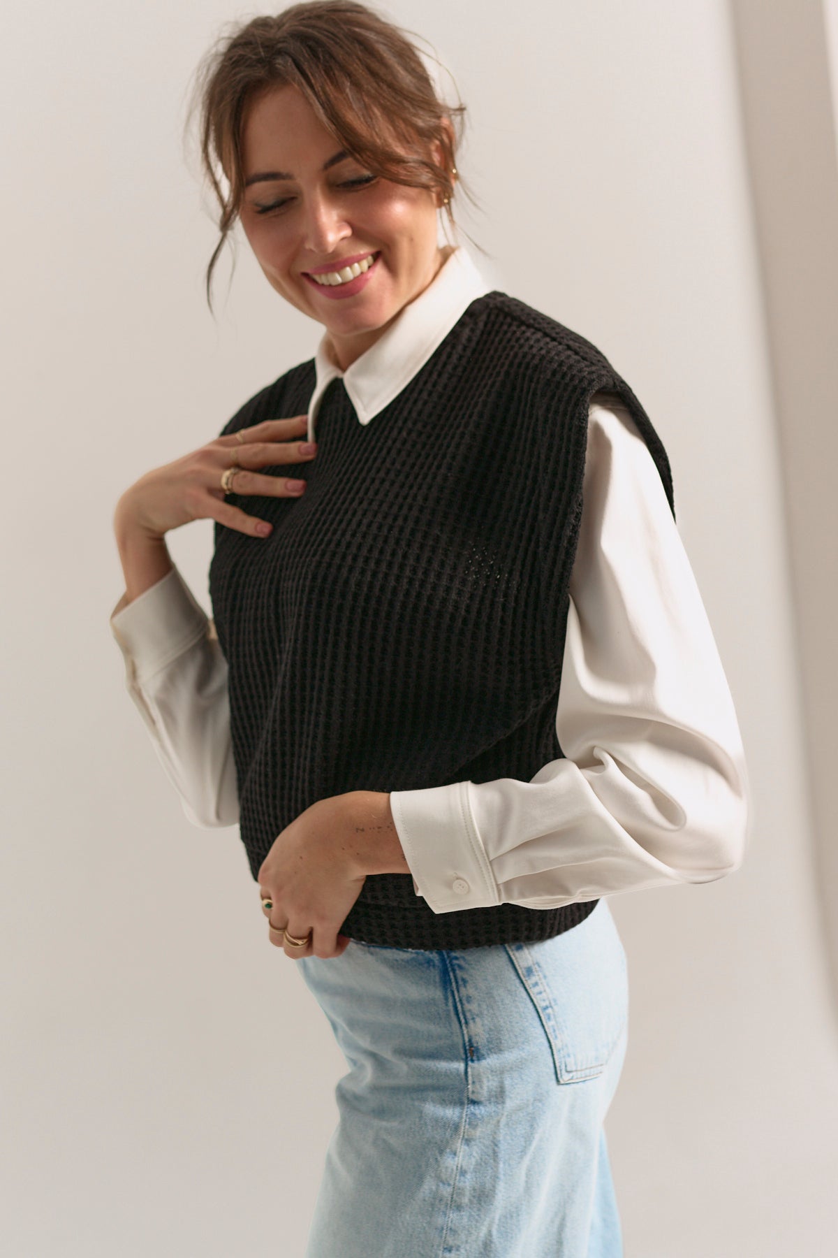 Dzianinowa kamizelka o krótszym, pudełkowym kroju, która świetnie układa się na sylwetce i dodaje stylizacjom nowoczesnego charakteru.