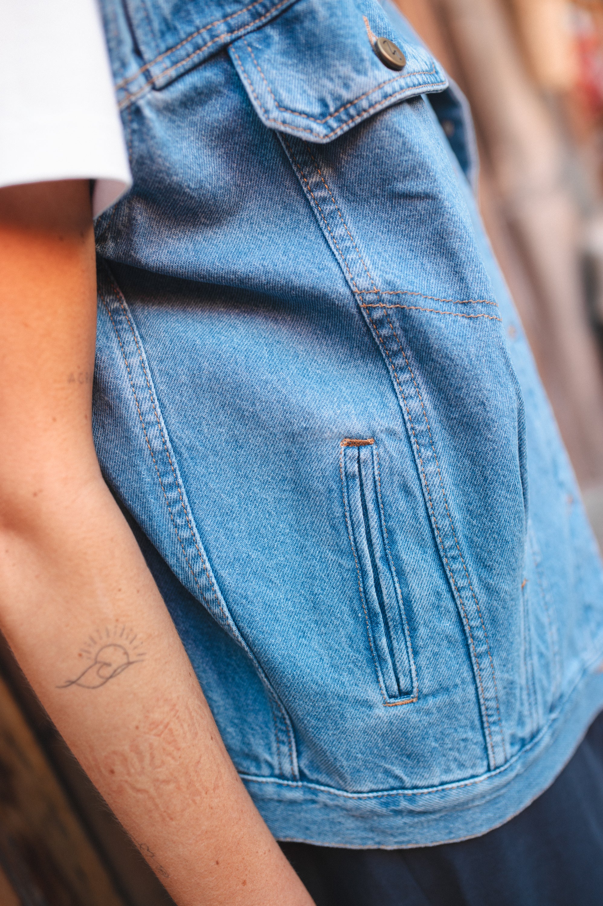 Kamizelka jeansowa w luźnym, lekko oversizowym kroju to must-have w każdej szafie. Zapinana na guziki, idealnie łączy klasyczny styl z nowoczesnym luzem. Z przodu znajdują się dwie funkcjonalne kieszenie, które dodają jej charakteru i praktyczności. Klasyczny kołnierzyk w połączeniu z wyrazistymi przeszyciami nadaje całości wyjątkowego, casualowego charakteru. To doskonały wybór na wiosenne i letnie dni, świetnie komponujący się zarówno z t-shirtami, jak i zwiewnymi sukienkami.