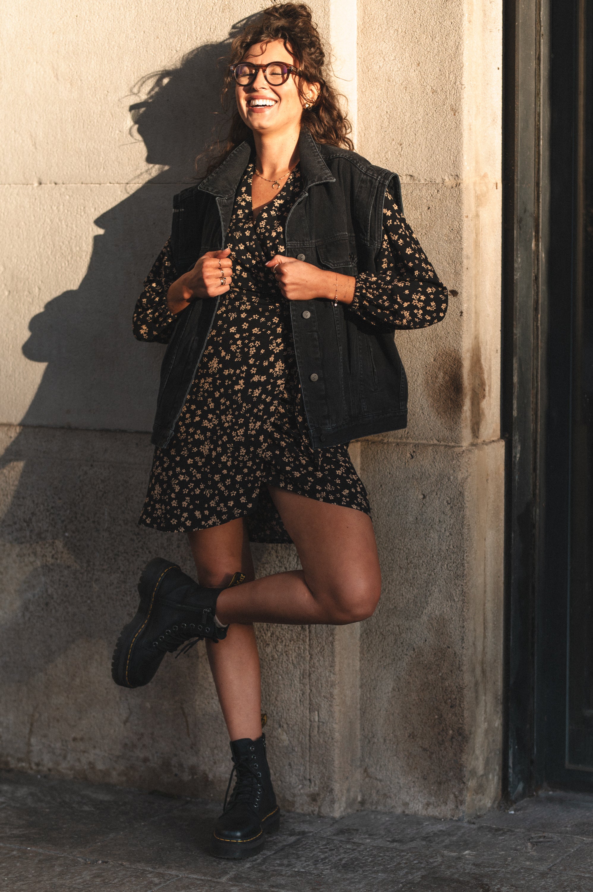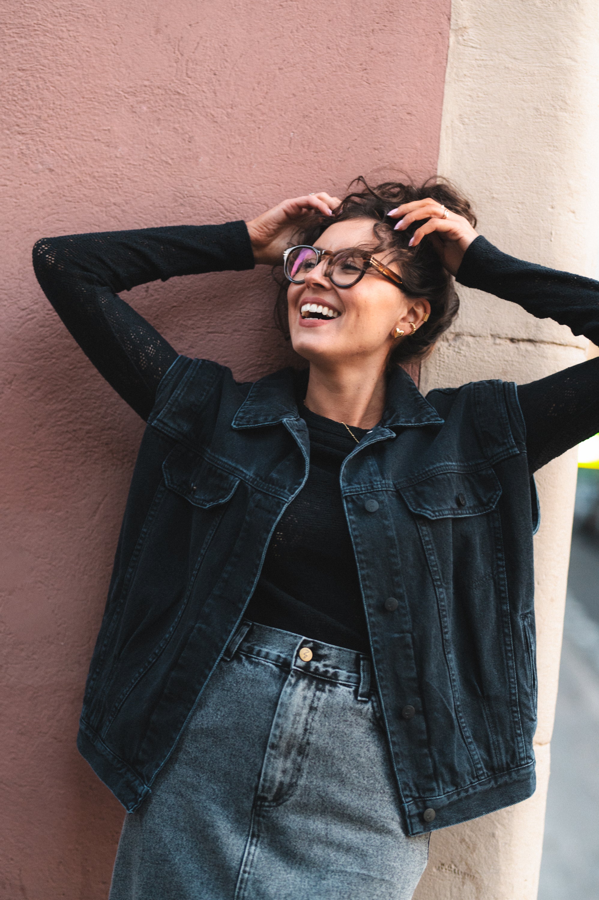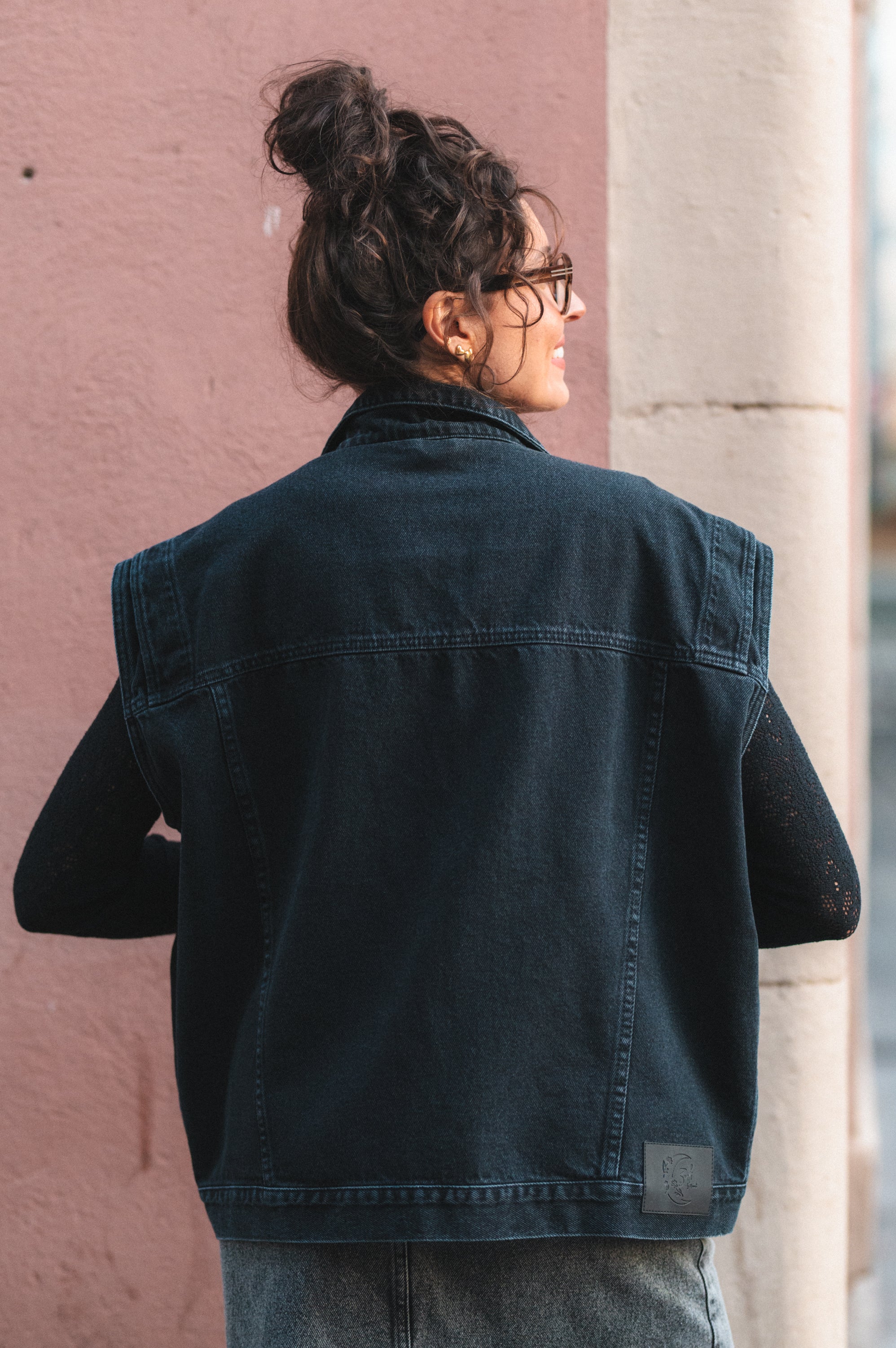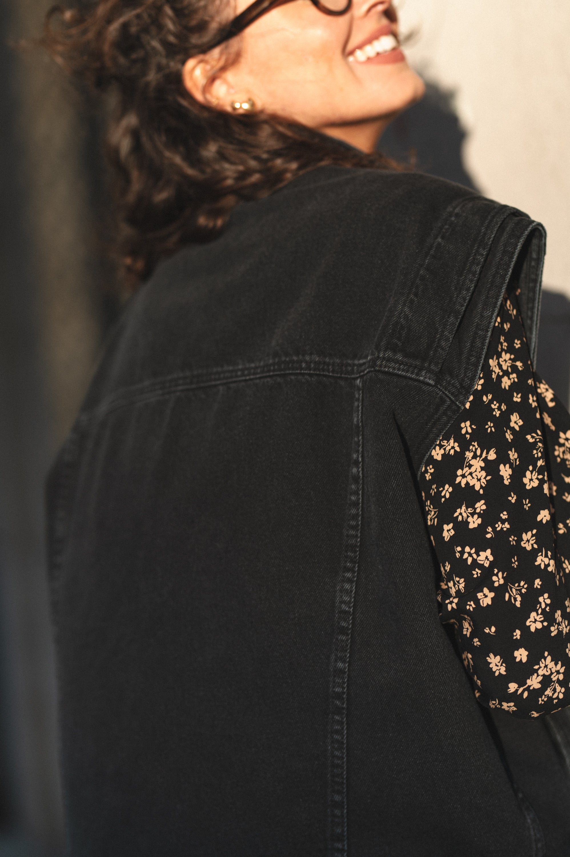 Kamizelka jeansowa w luźnym, lekko oversizowym kroju to must-have w każdej szafie. Zapinana na guziki, idealnie łączy klasyczny styl z nowoczesnym luzem. Z przodu znajdują się dwie funkcjonalne kieszenie, które dodają jej charakteru i praktyczności. Klasyczny kołnierzyk w połączeniu z wyrazistymi przeszyciami nadaje całości wyjątkowego, casualowego charakteru. To doskonały wybór na wiosenne i letnie dni, świetnie komponujący się zarówno z t-shirtami, jak i zwiewnymi sukienkami.