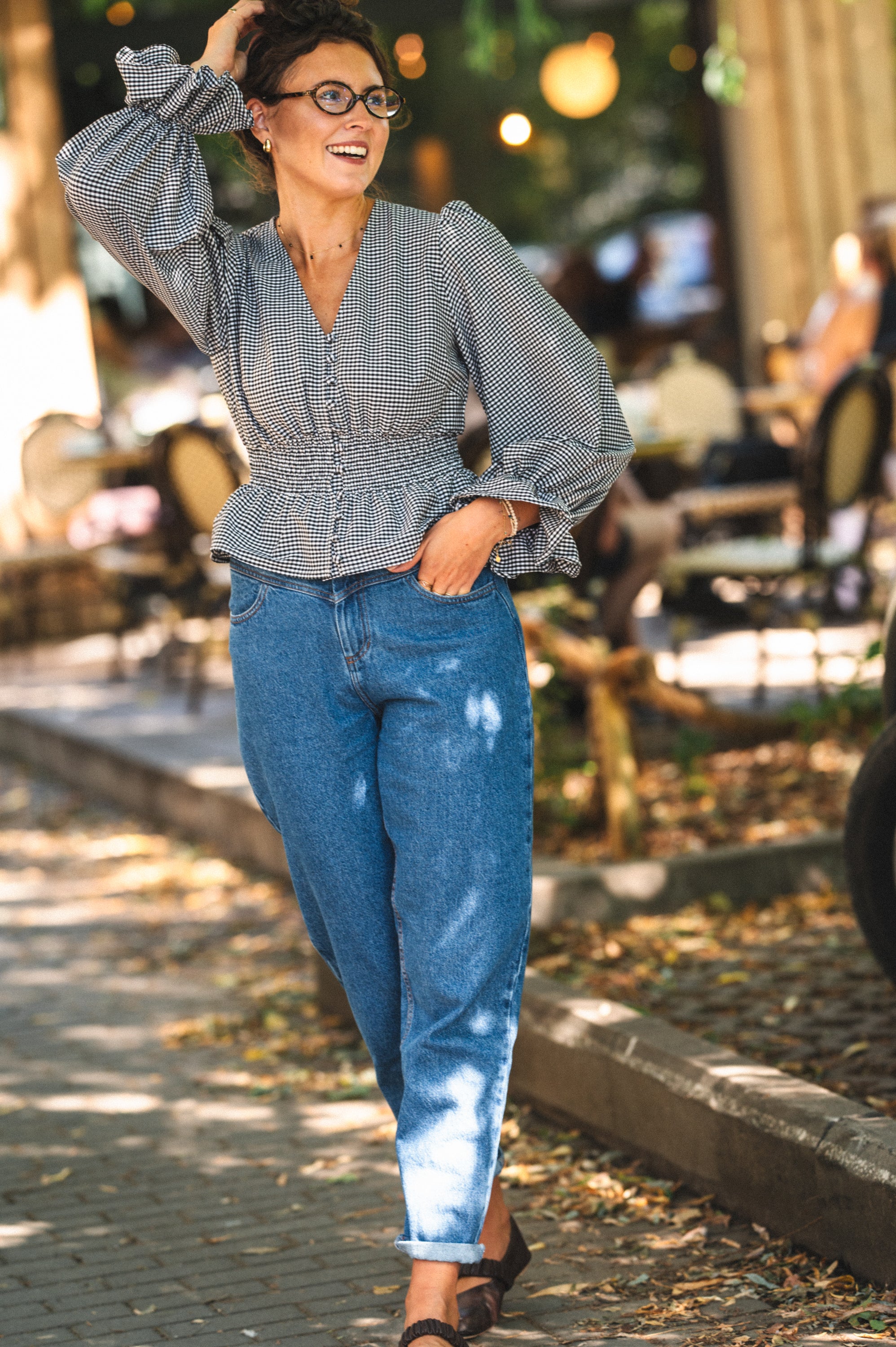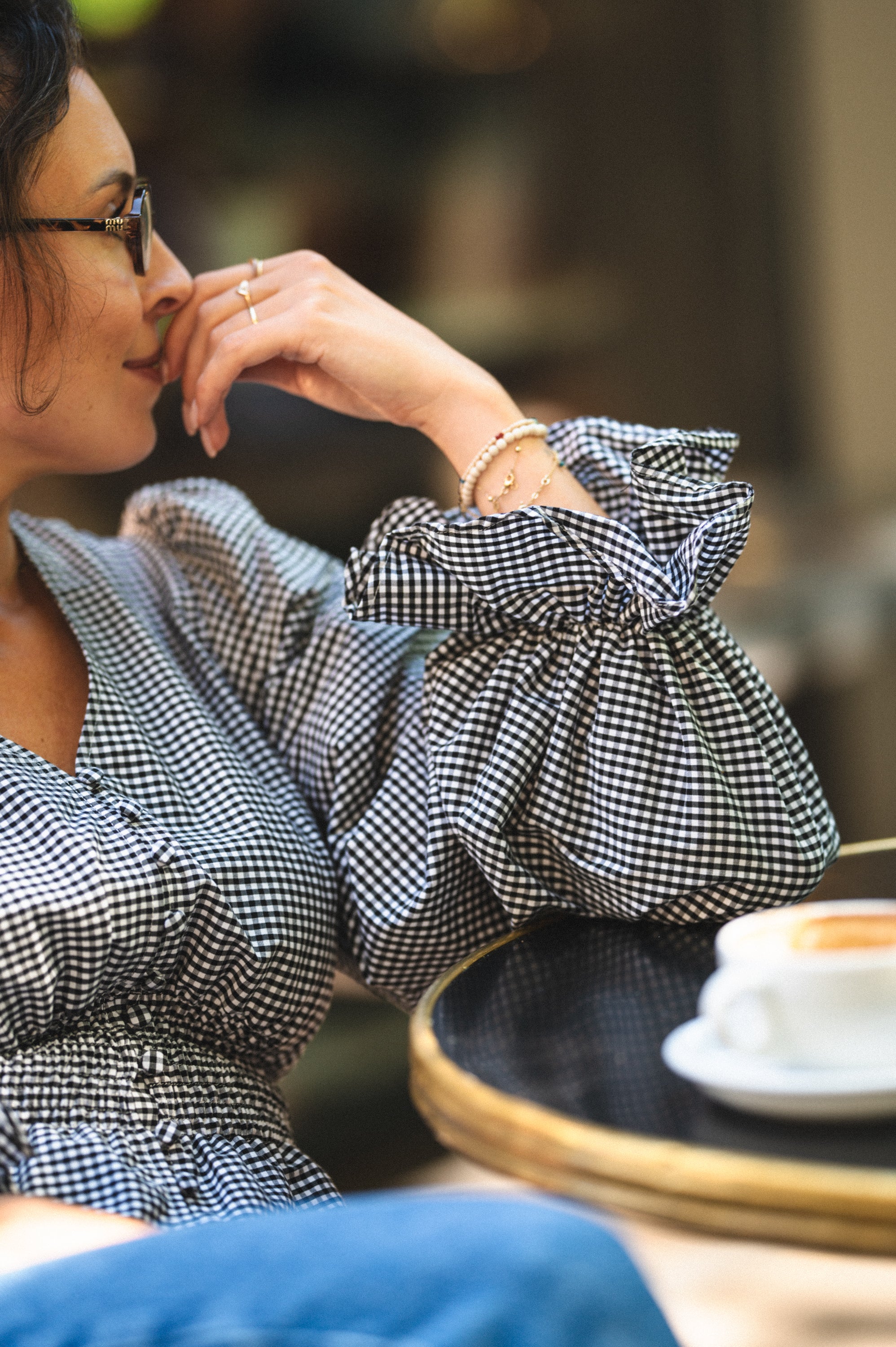 Bluzka o subtelnie romantycznym charakterze, idealna na co dzień i na specjalne okazje. Delikatne bufki na ramionach dodają sylwetce lekkości, a dekolt w kształcie litery V optycznie wysmukla szyję. Rękawy zakończone gumką tworzą efekt dzwonka, który pięknie układa się przy ruchu. Przód zdobi rząd ozdobnych, powlekanych guzików, które wprowadzają elegancki detal. Talia została podkreślona szeroką, marszczoną gumą, która zapewnia wygodne dopasowanie i akcentuje kobiecą sylwetkę. Całość uzupełnia krótka baskinka, nadająca bluzce lekko rozkloszowany, kobiecy kształt.