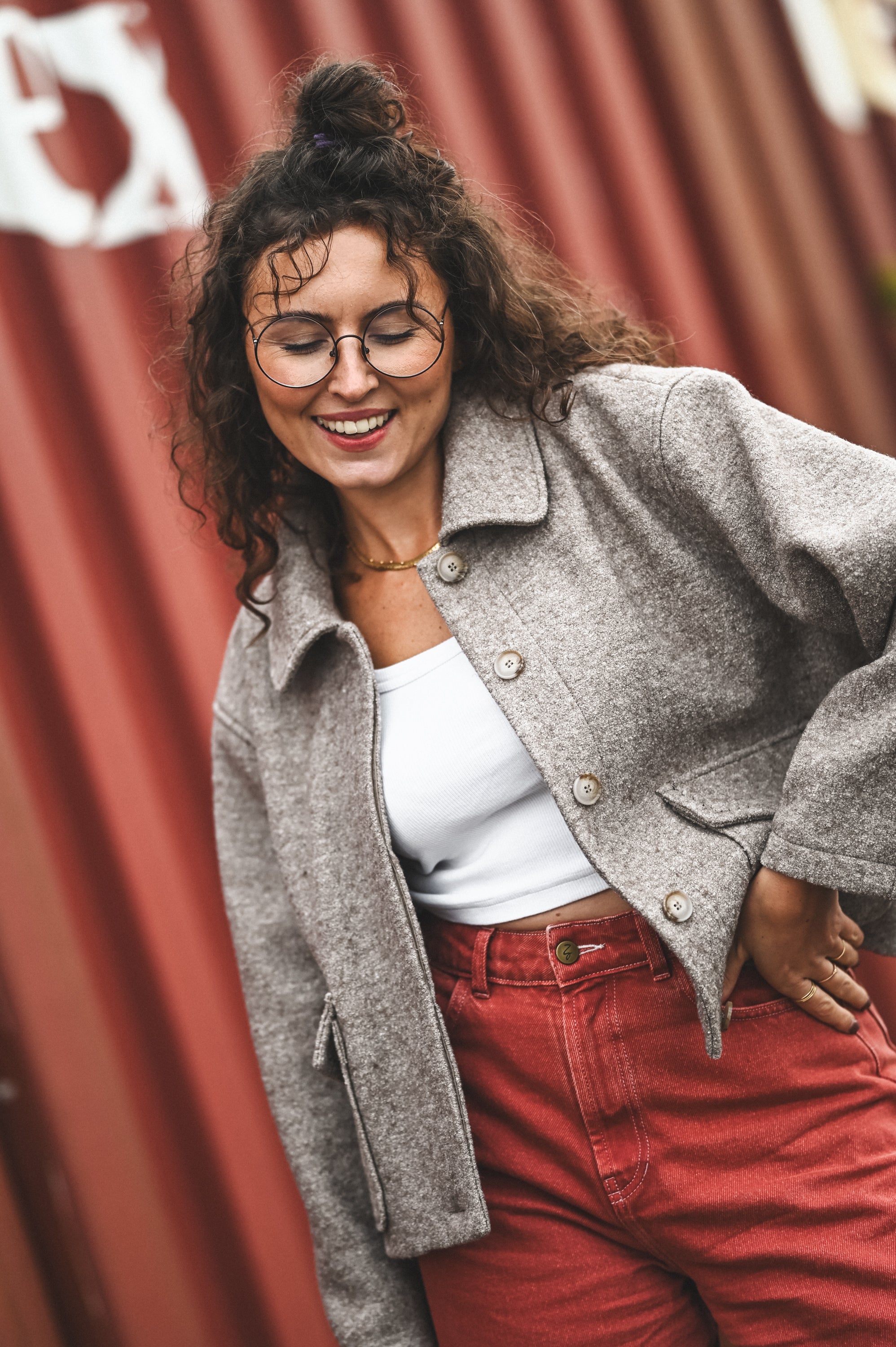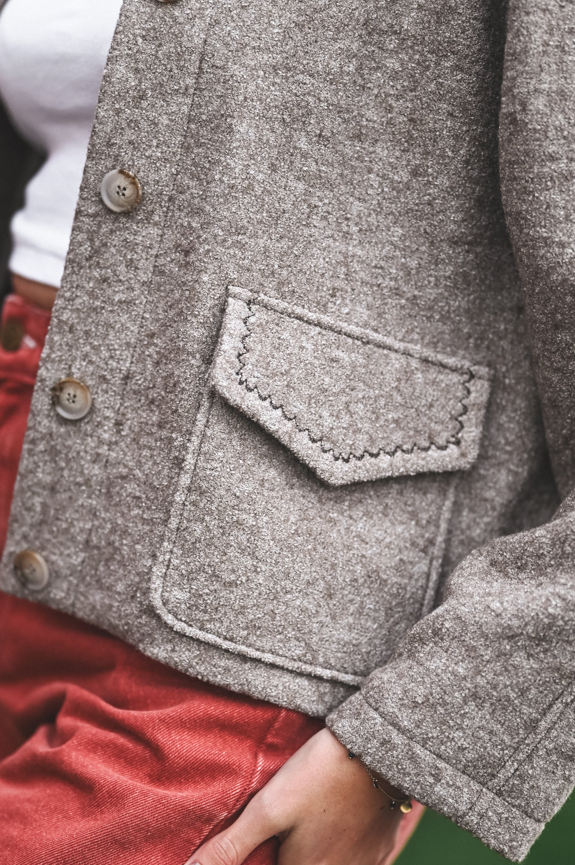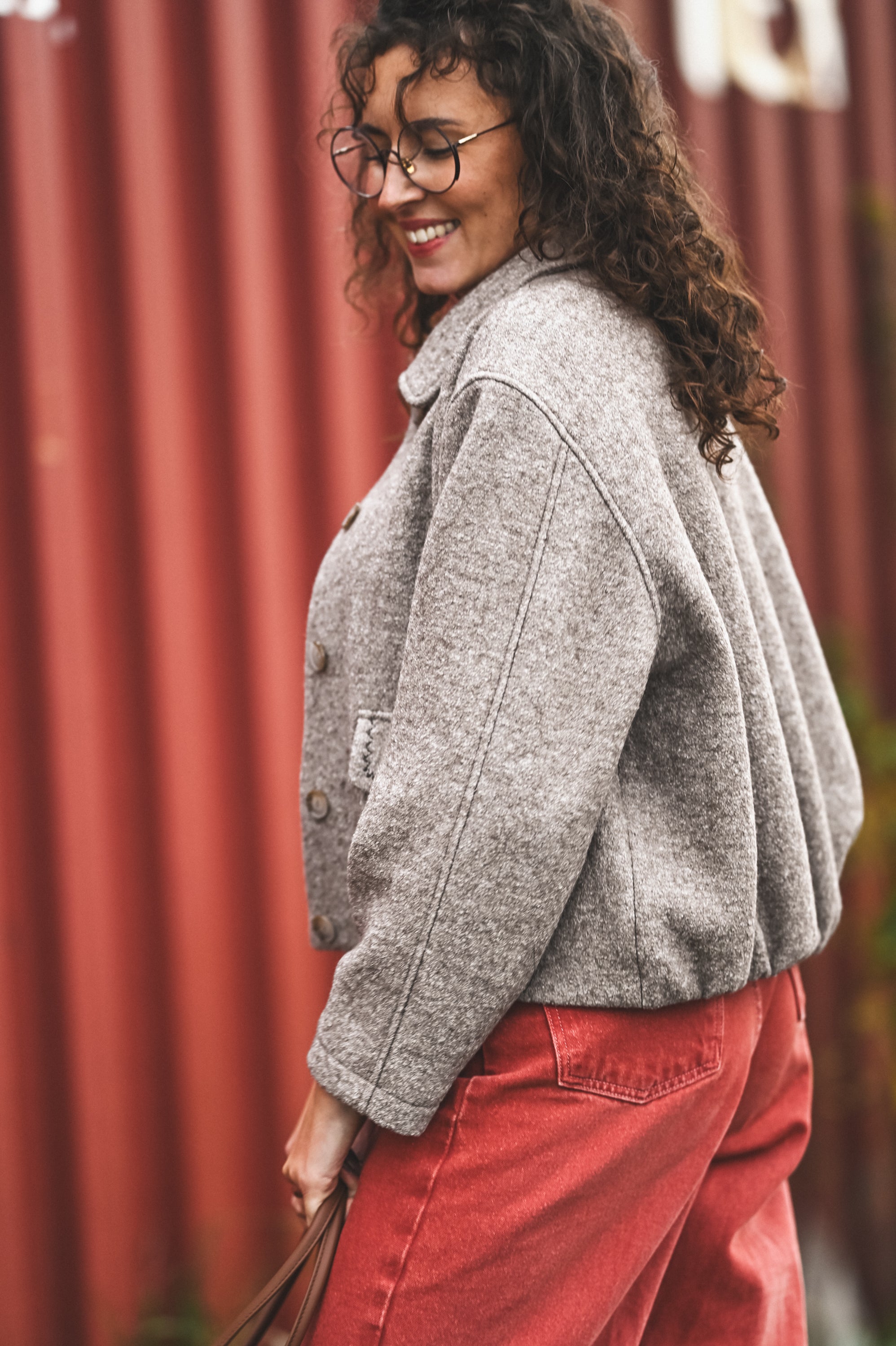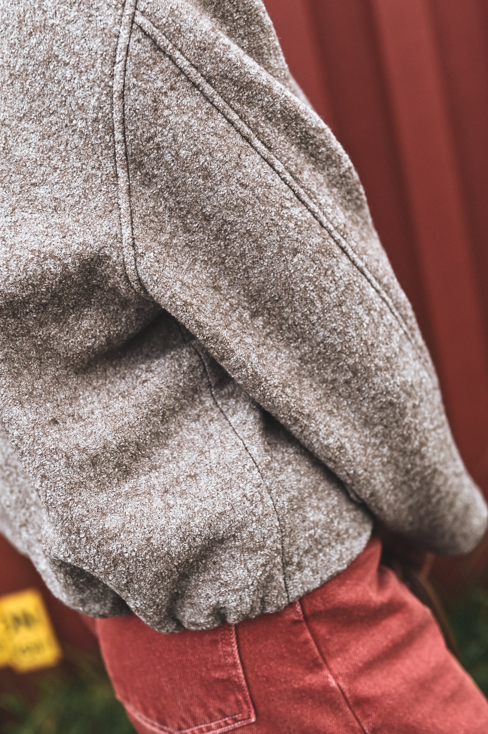 Stylowa, beżowa kurtka o eleganckim, krótszym kroju. Wykonana z miękkiej, wełnianej tkaniny o lekko melanżowej fakturze, zapewnia ciepło i wygodę w chłodniejsze dni. Zapinana na duże guziki, z prostym kołnierzem i prostymi rękawami, które dodają jej nowoczesnego charakteru.