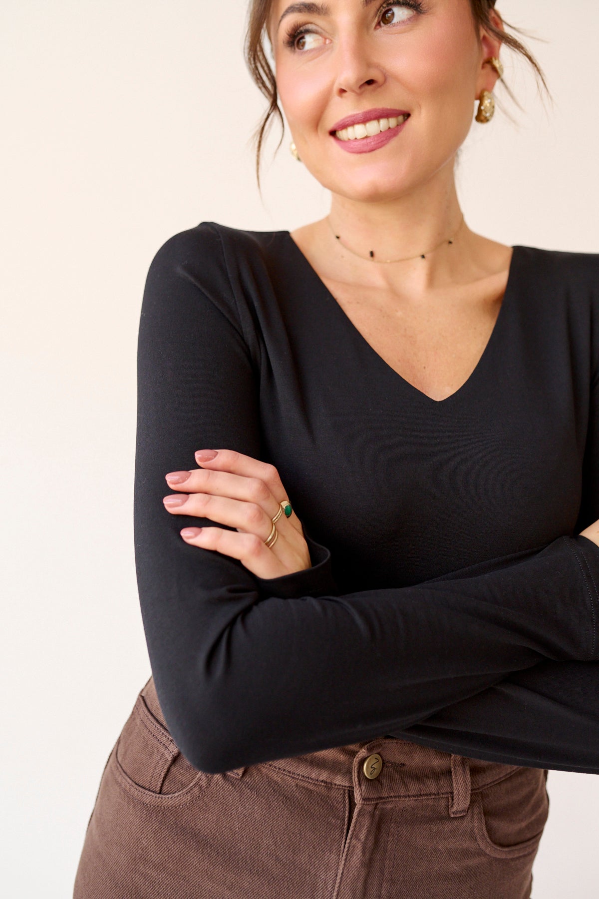 Model został wykonany z wysokiej jakości wiskozy bambusowej, która jest miękka, oddychająca i przyjemna dla skóry. Podwójna warstwa materiału z przodu i z tyłu zapewnia lepsze krycie oraz idealne układanie się na sylwetce. To uniwersalna baza, która sprawdzi się zarówno solo, jak i jako element warstwowych stylizacji.