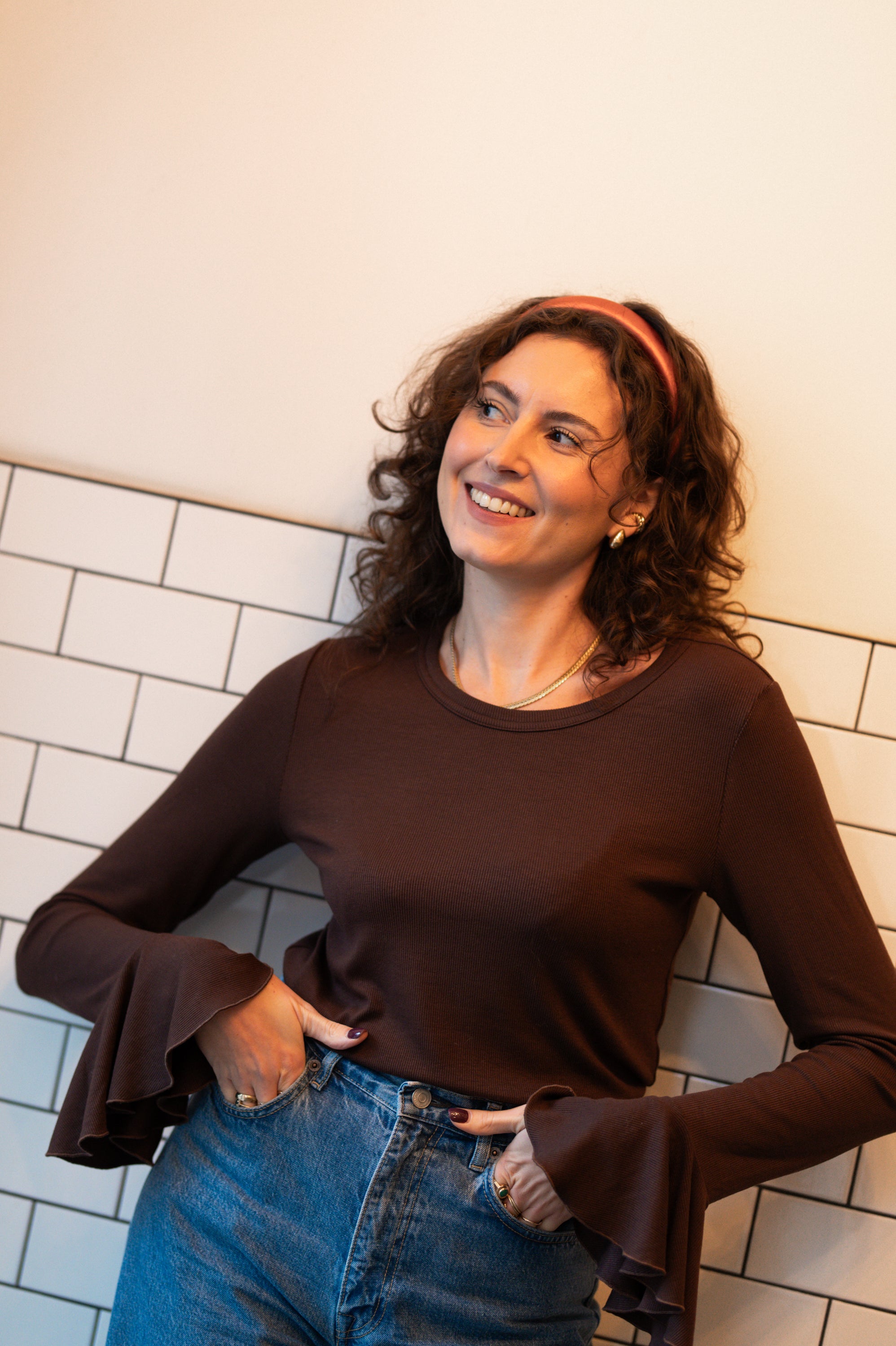 Komfortowy longsleeve wykonany z wysokiej jakości prążkowanej dzianiny, która zapewnia wygodę przez cały dzień. Jego prosty, ponadczasowy krój doskonale dopasowuje się do sylwetki, a delikatny okrągły dekolt dodaje subtelnej elegancji. Rękawy, klasycznie odcinane na ramionach, zakończone są uroczymi dzwonkami z delikatną falbanką, co nadaje całości dziewczęcego uroku. To doskonała baza do wielu stylizacji, idealna zarówno na co dzień, jak i na bardziej eleganckie okazje.