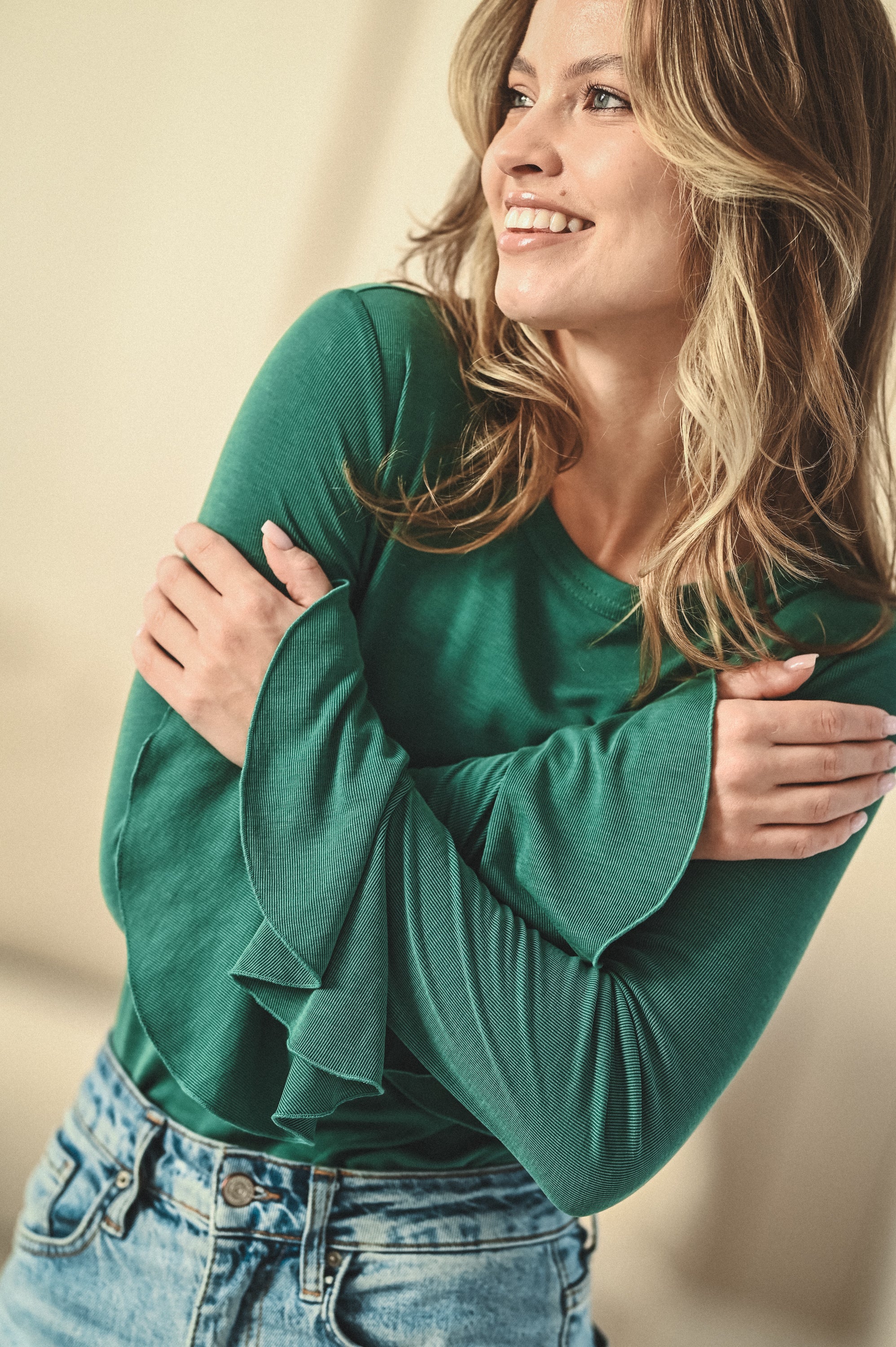 Komfortowy longsleeve wykonany z wysokiej jakości prążkowanej dzianiny, która zapewnia wygodę przez cały dzień. Jego prosty, ponadczasowy krój doskonale dopasowuje się do sylwetki, a delikatny okrągły dekolt dodaje subtelnej elegancji. Rękawy, klasycznie odcinane na ramionach, zakończone są uroczymi dzwonkami z delikatną falbanką, co nadaje całości dziewczęcego uroku. To doskonała baza do wielu stylizacji, idealna zarówno na co dzień, jak i na bardziej eleganckie okazje.