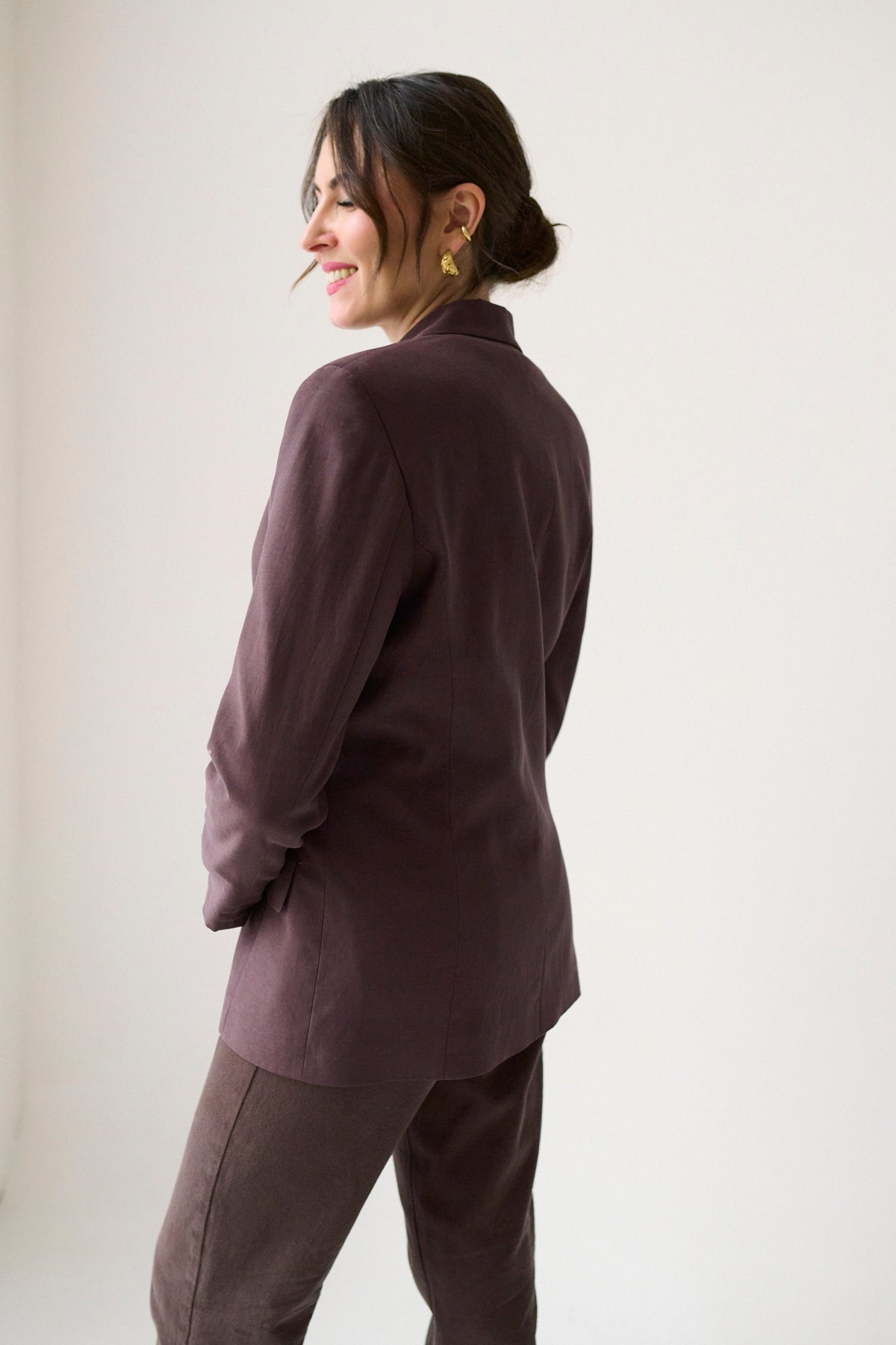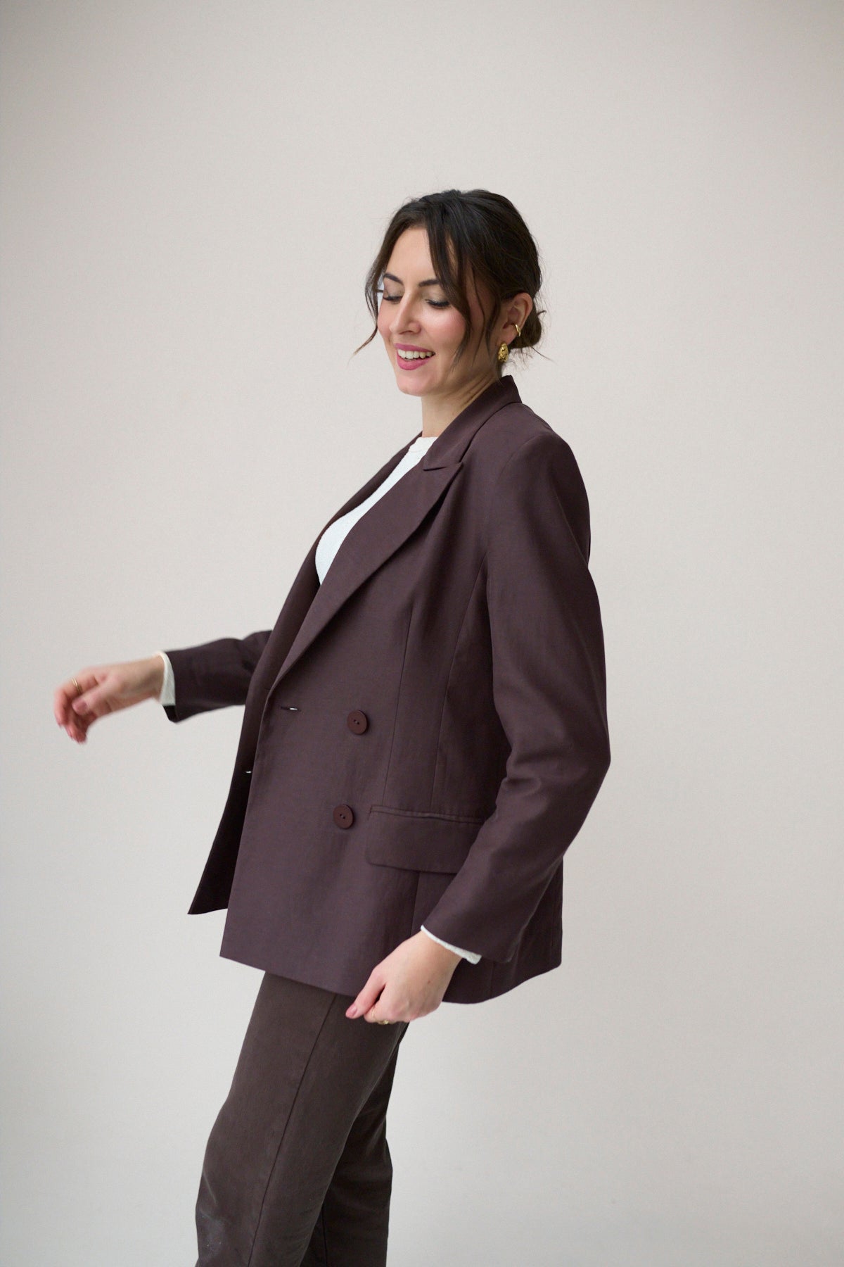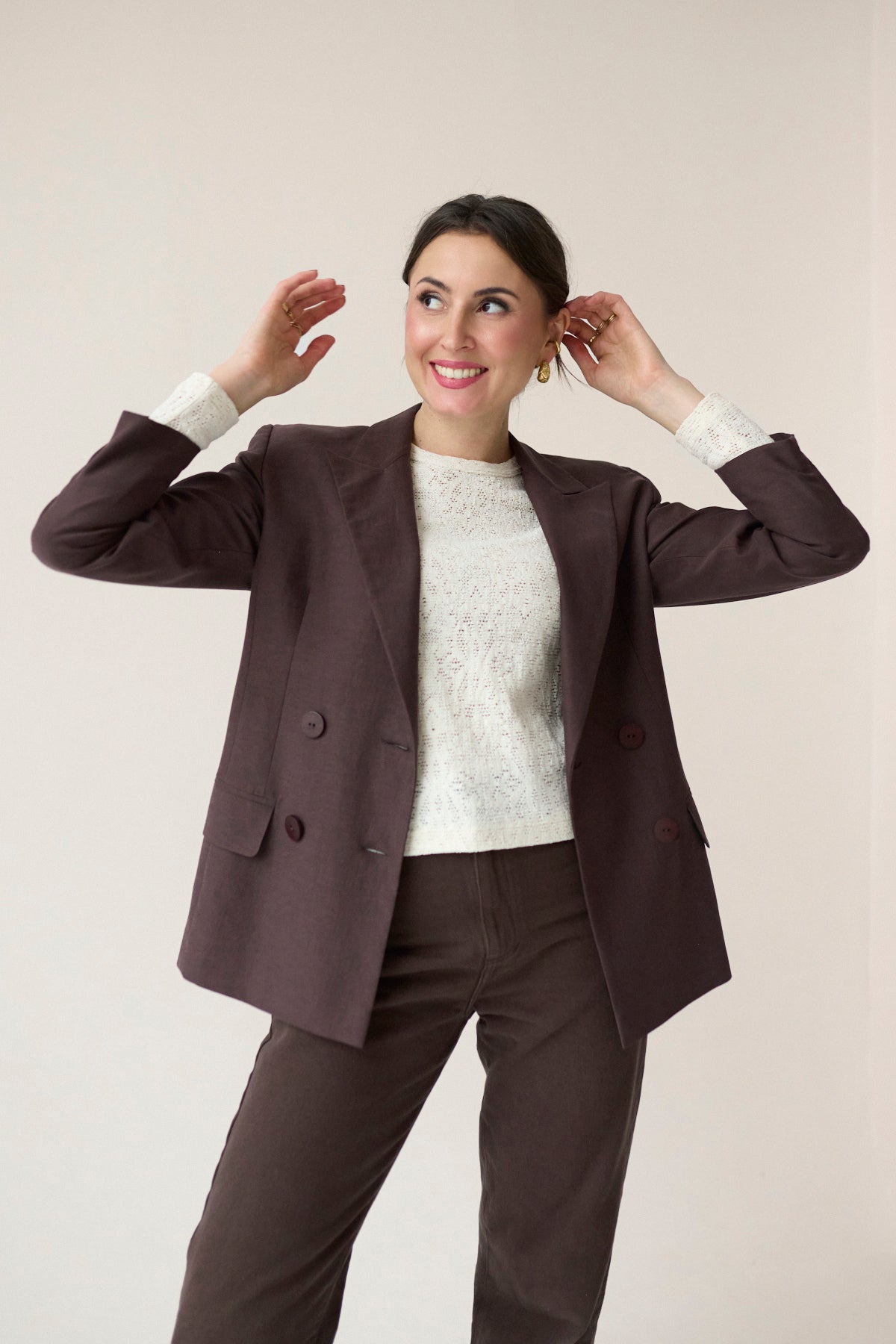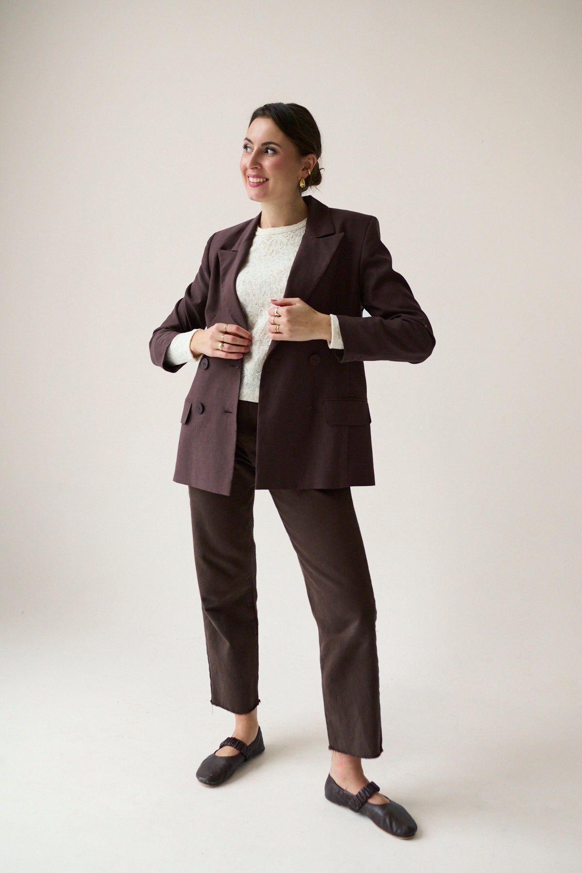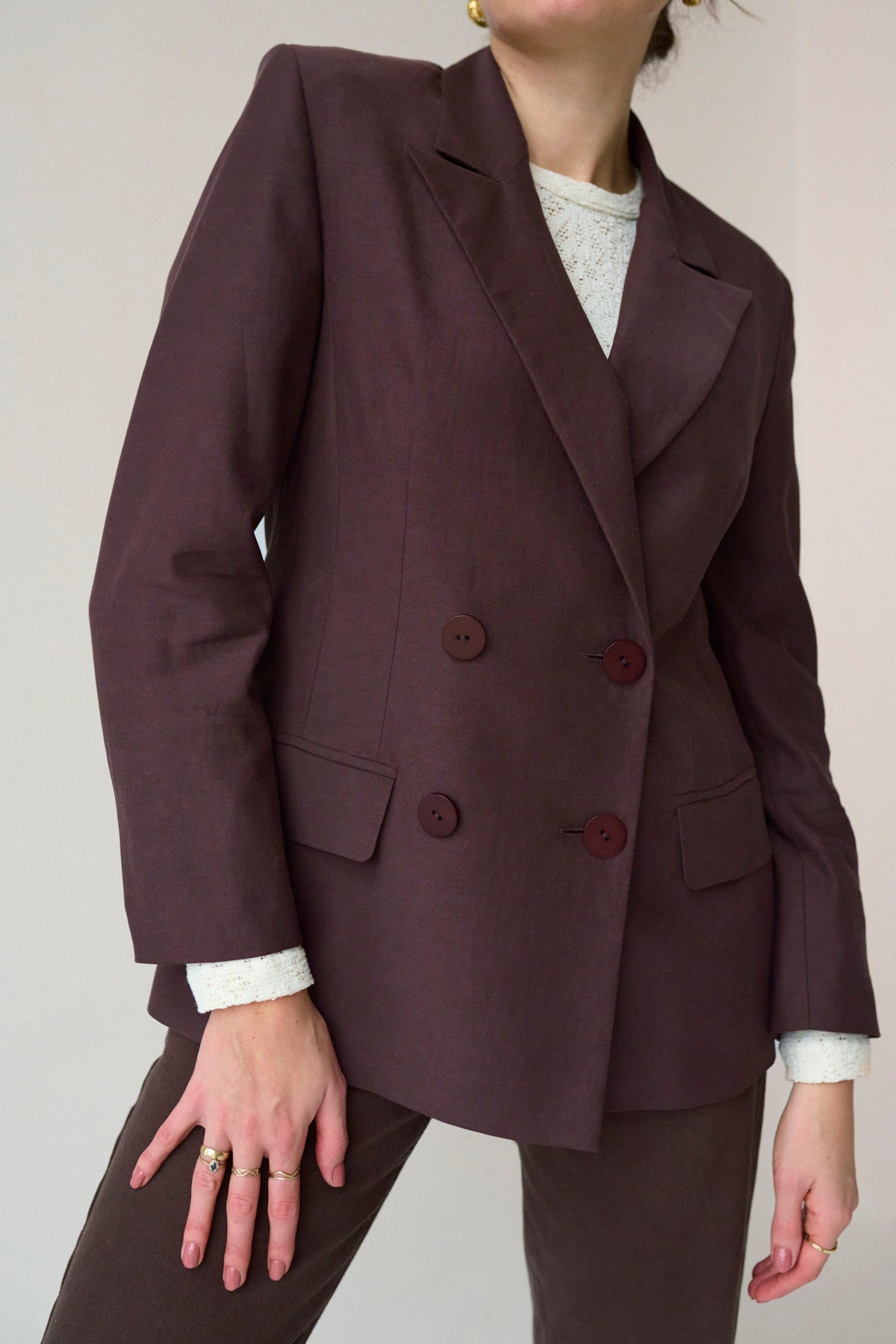 Marynarka o klasycznym, ponadczasowym kroju, który łączy elegancję z wyrafinowaną prostotą. Dwurzędowa forma nadaje jej charakteru i podkreśla styl inspirowany klasycznym krawiectwem. Lekko taliowany fason subtelnie modeluje sylwetkę, zachowując przy tym komfort i swobodę noszenia.