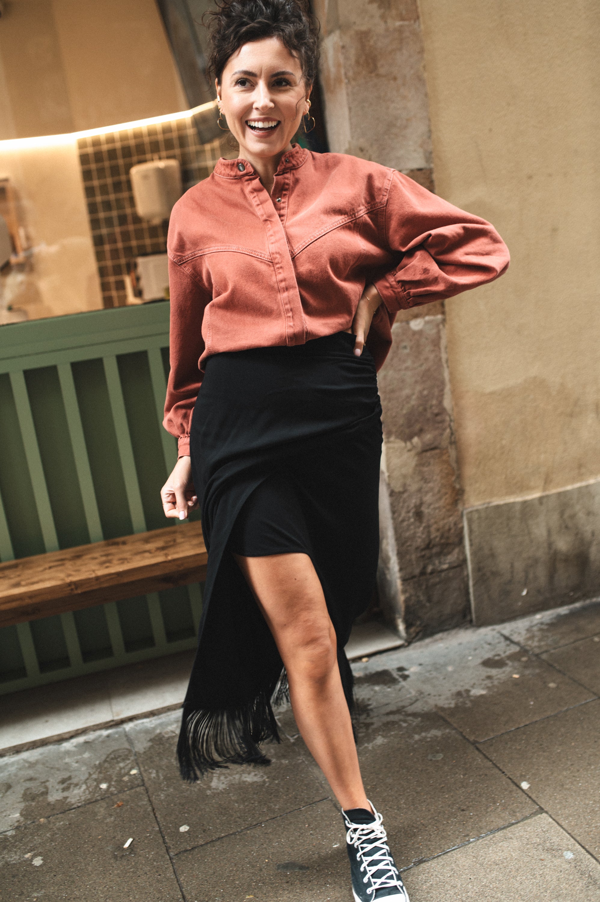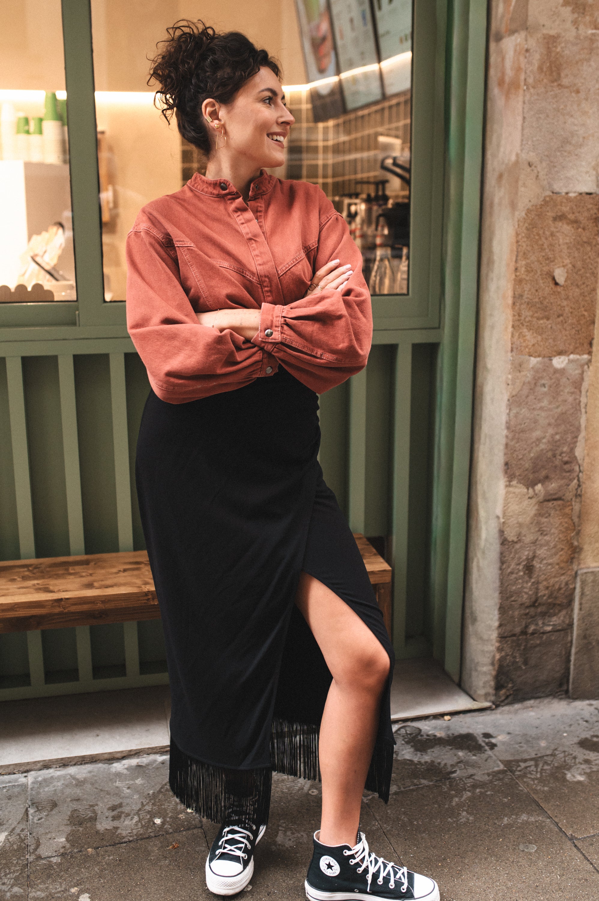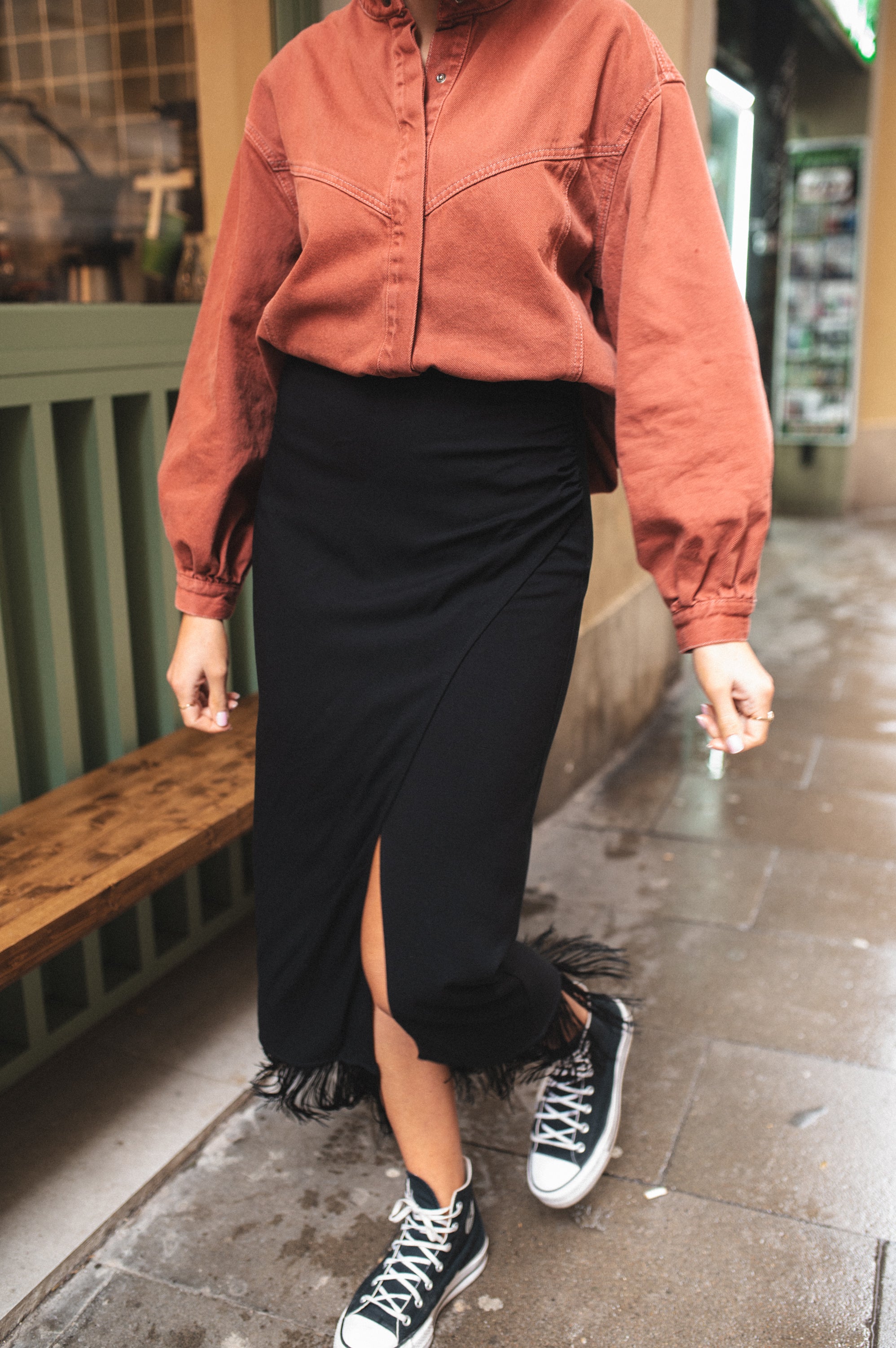 Spódnica z frędzlami, które stanowią jej największy atut i nadają całości niepowtarzalnego charakteru. To właśnie one sprawiają, że prosta forma nabiera efektu „wow” – minimalistyczna w kroju, a jednocześnie wyrazista i oryginalna. Frędzle pięknie pracują w ruchu, przyciągając spojrzenia i dodając stylizacji lekkości oraz dynamiki.