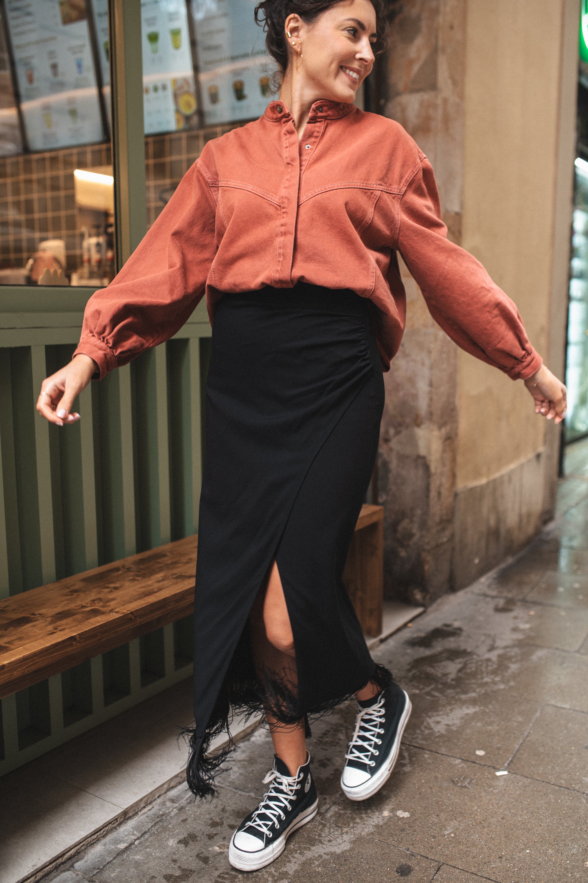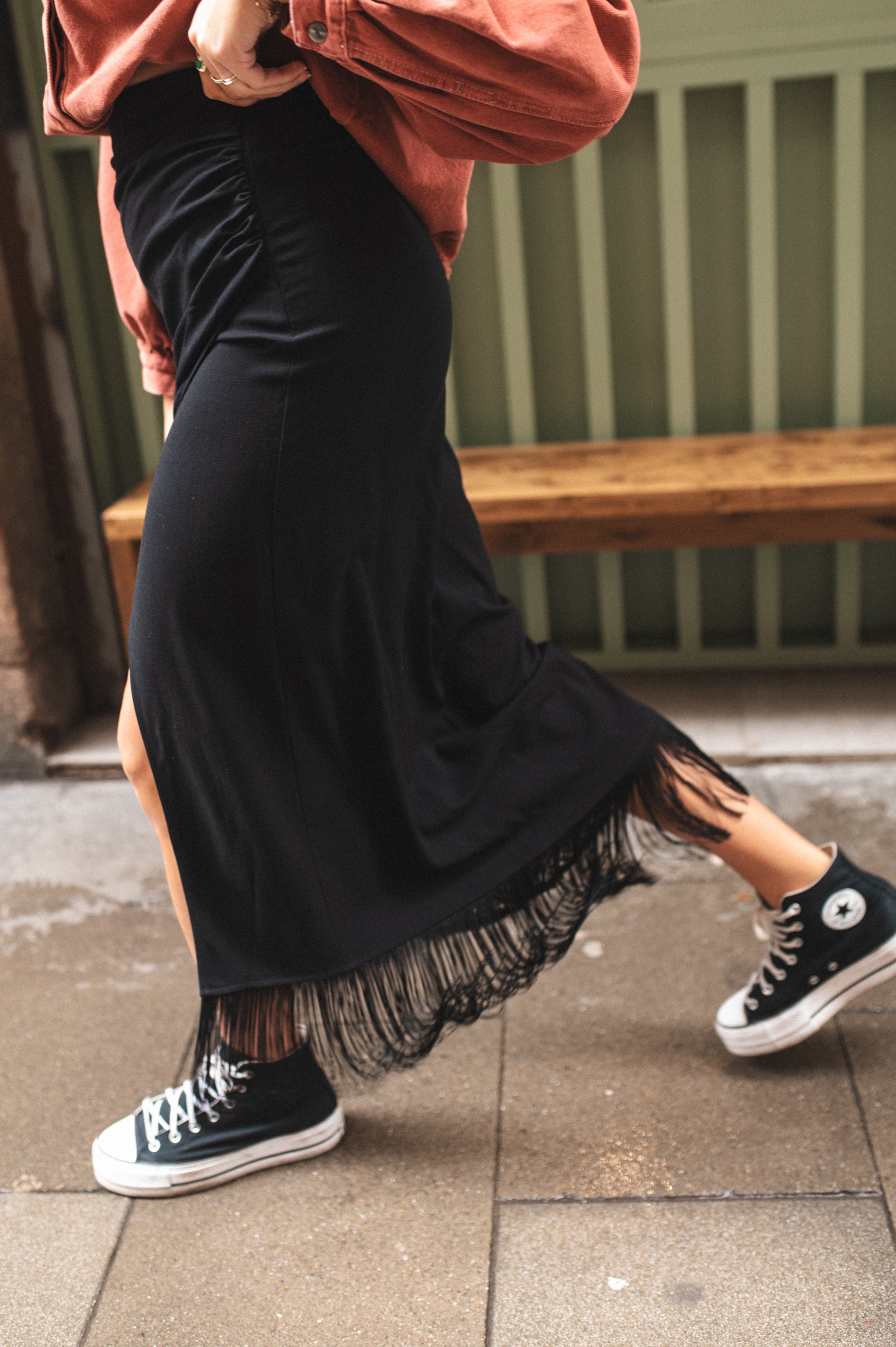 Ukryta część tworzy mini spódniczkę, dzięki czemu nie widać bielizny podczas wiatru lub duuuuużego kroku.