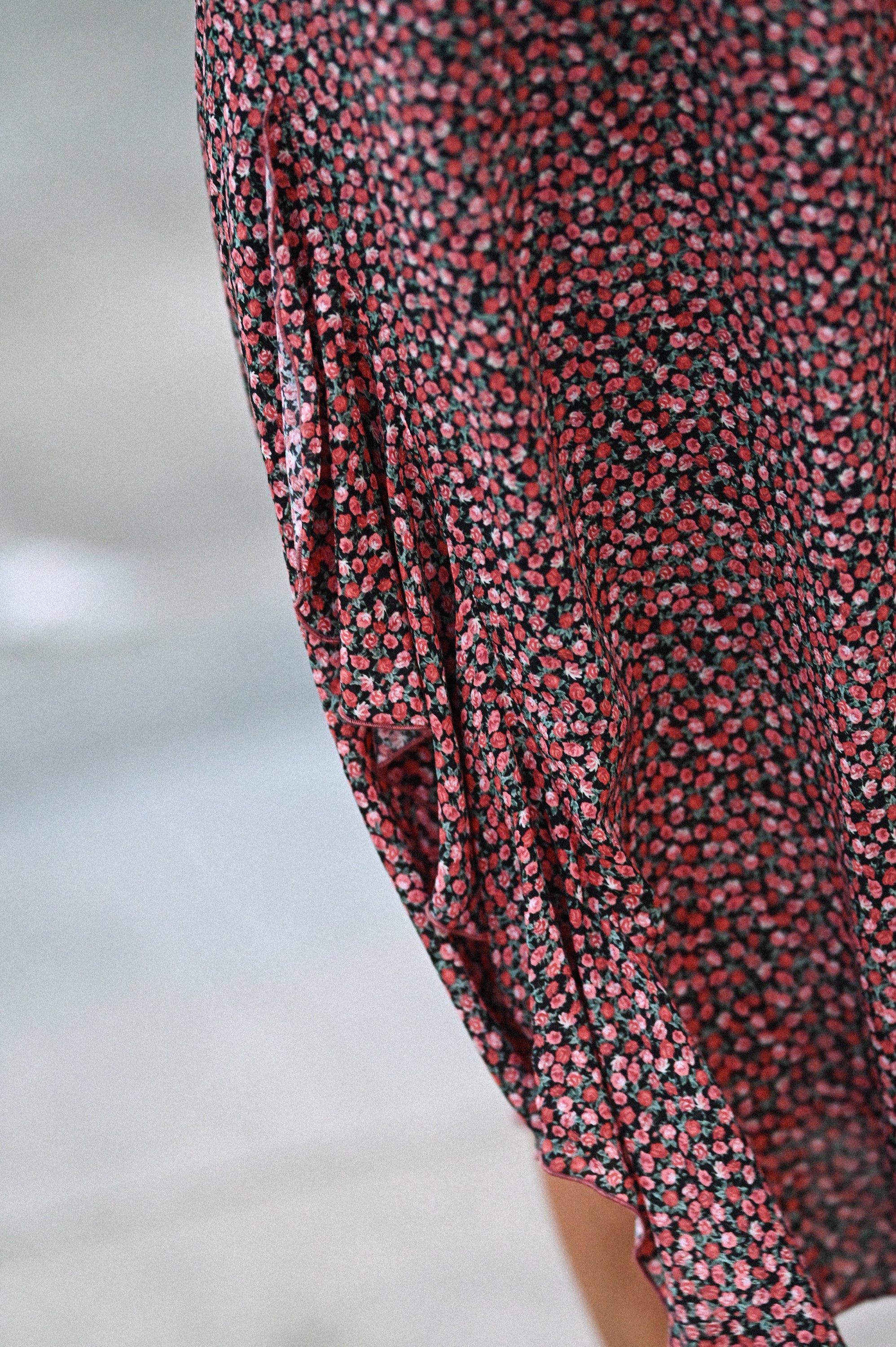 Stylowa i kobieca spódnica o długości midi, uszyta z lekkiej, przewiewnej wiskozy, idealnej na cieplejsze dni. Jej charakterystycznym elementem jest efektowna falbana w kształcie litery V, która dodaje sylwetce lekkości i dynamiki. Model posiada podszewkę, co zapewnia komfort noszenia i dodatkowe krycie. Doskonała propozycja zarówno na co dzień, jak i na specjalne okazje.