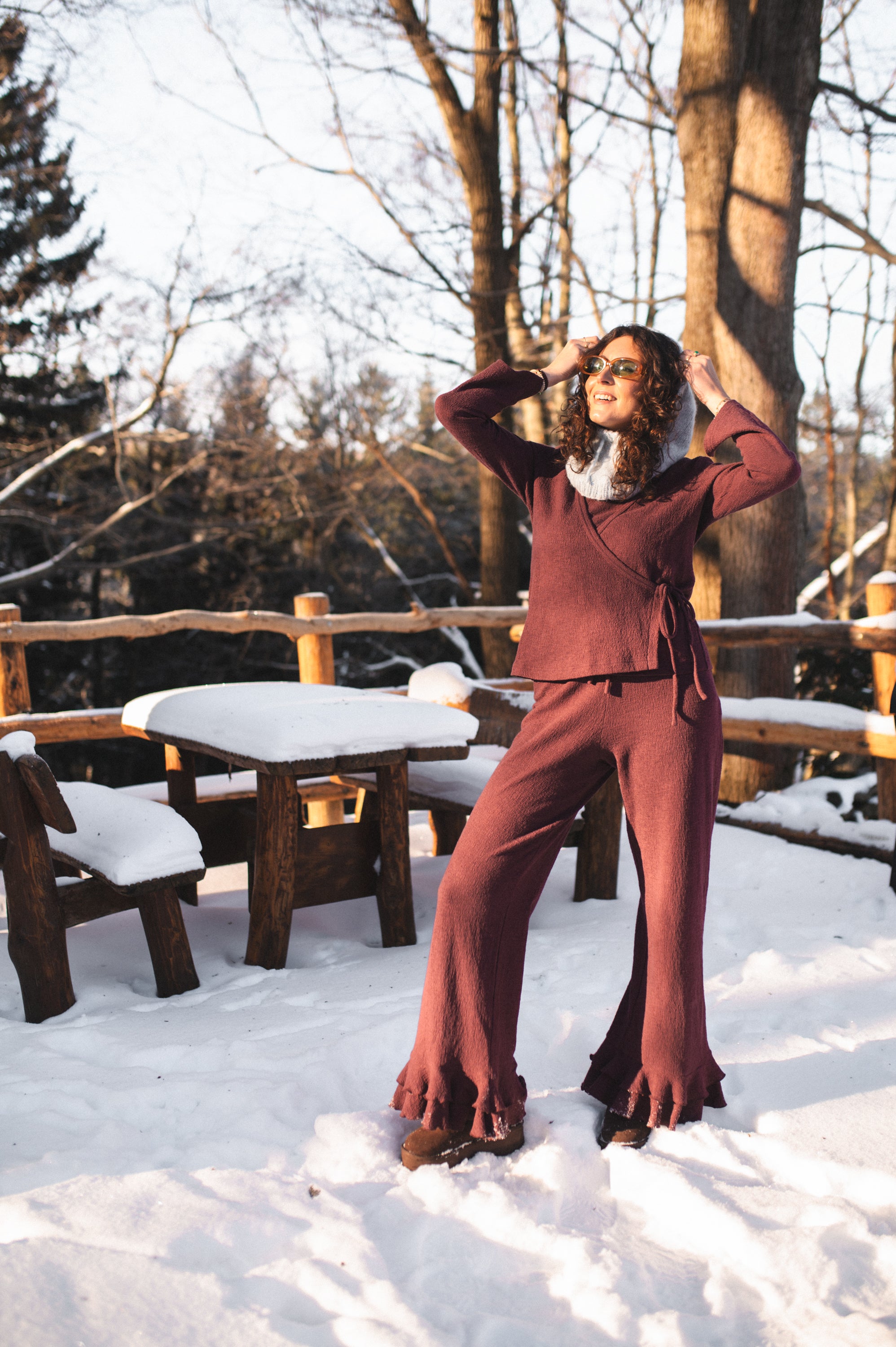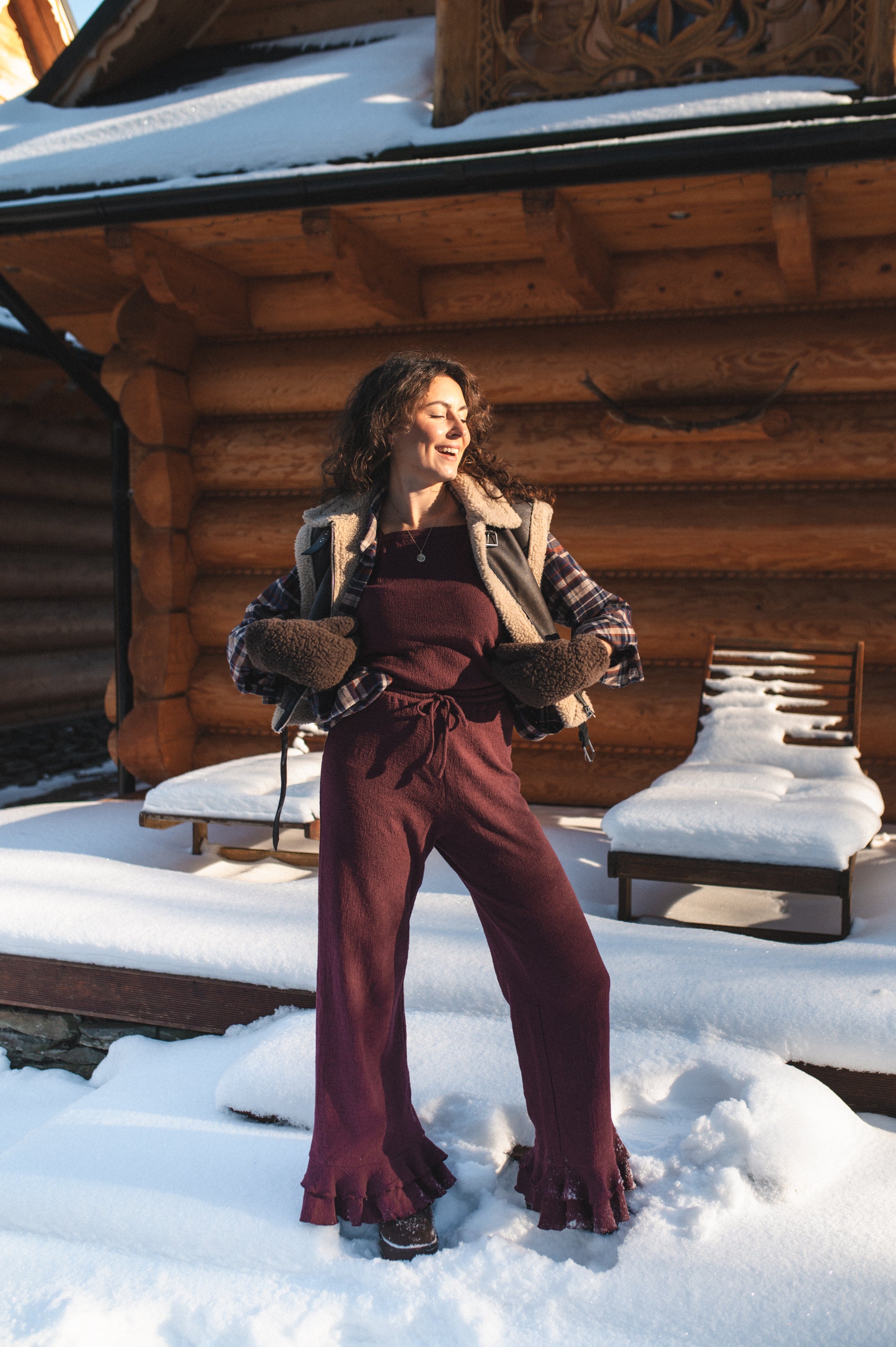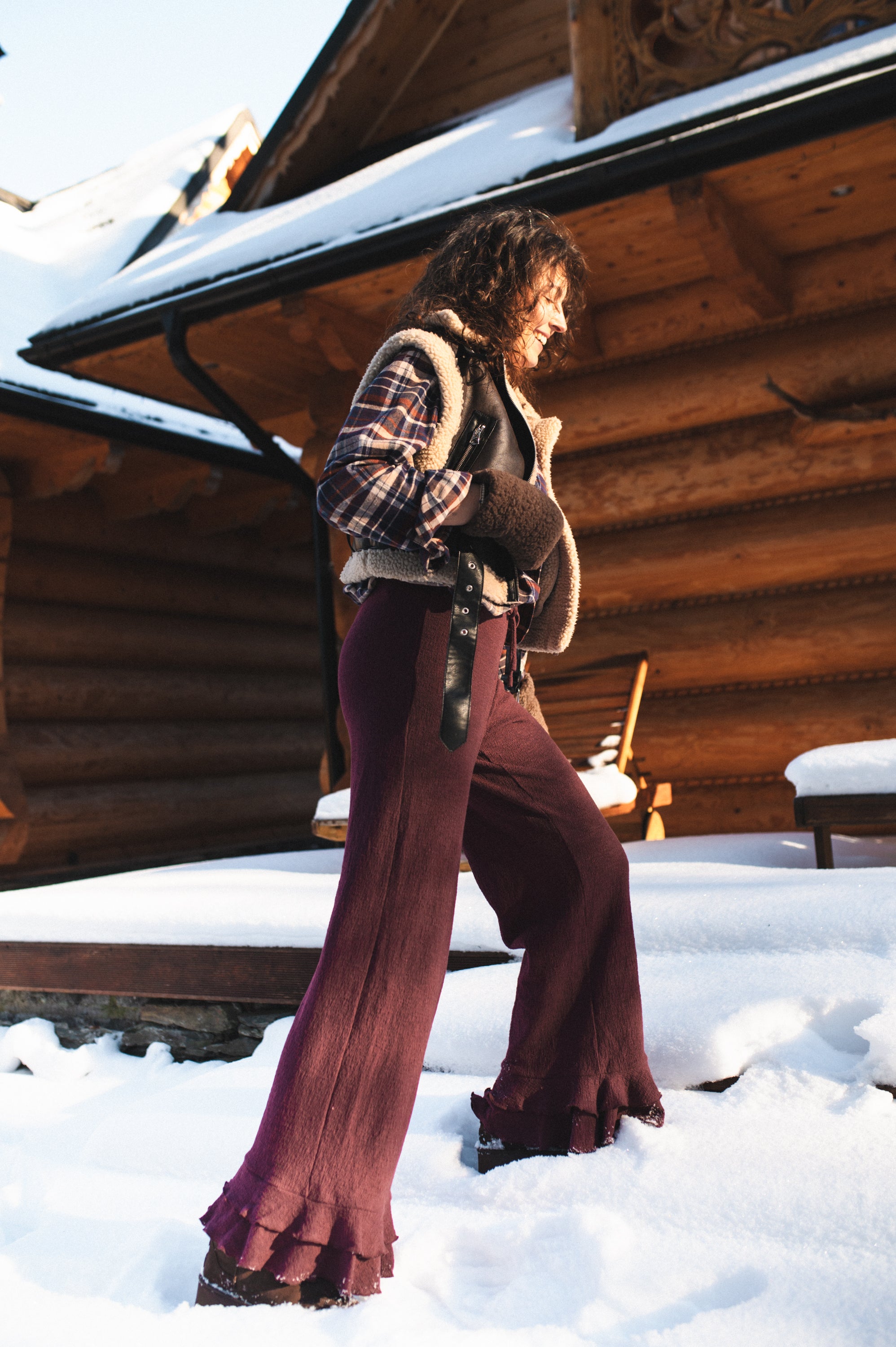Szerokie nogawki wykończone podwójną falbaną.