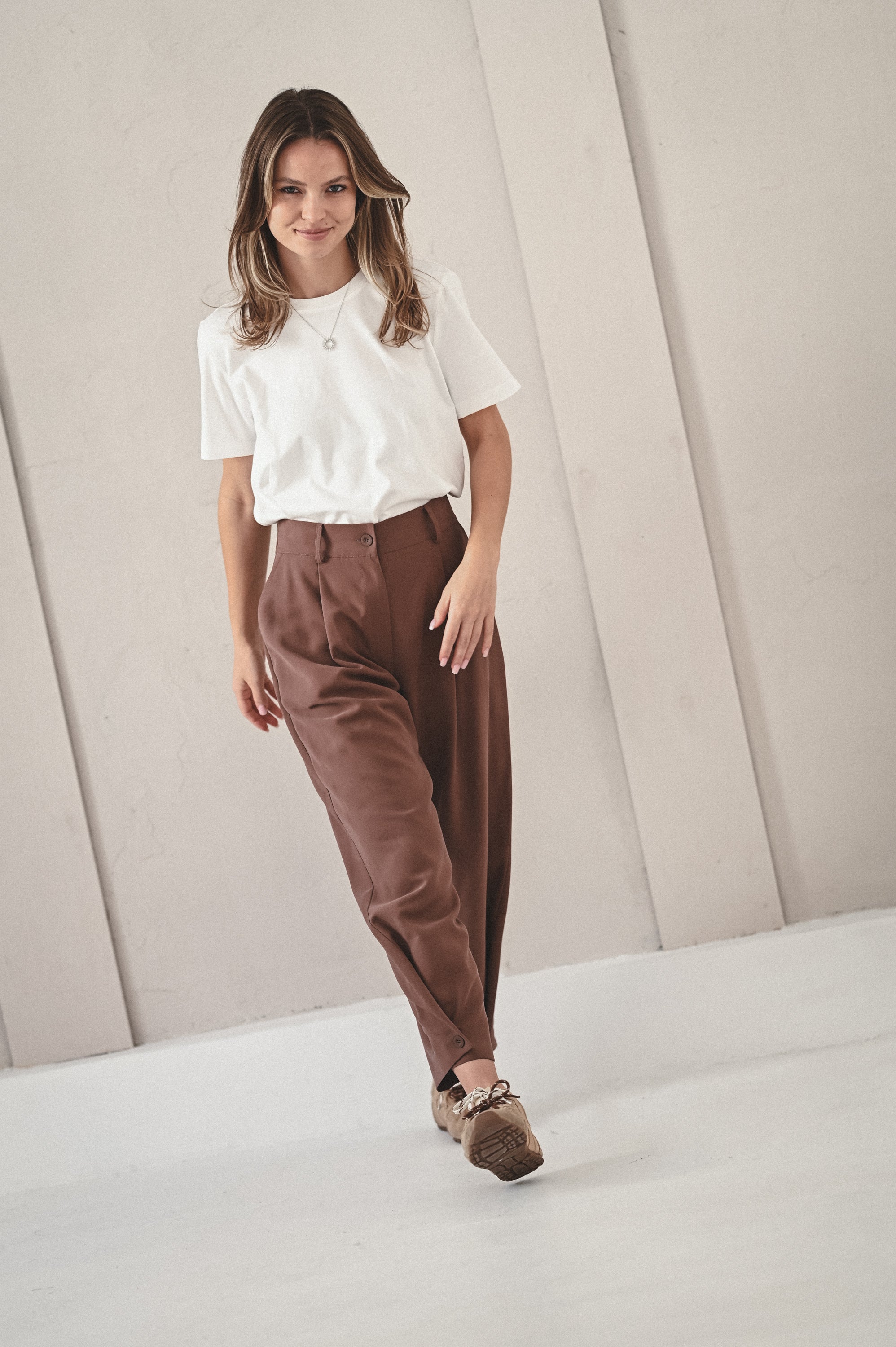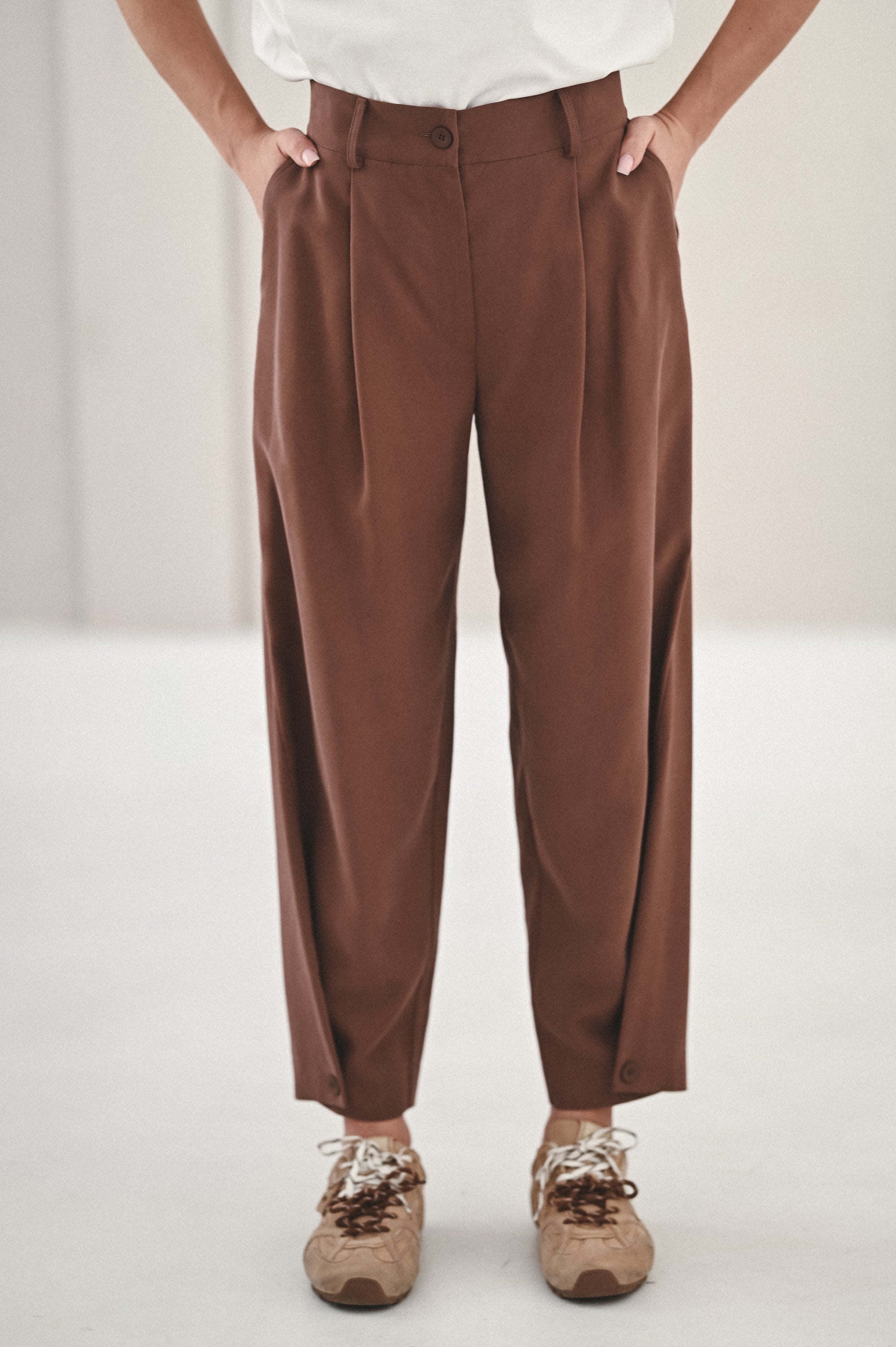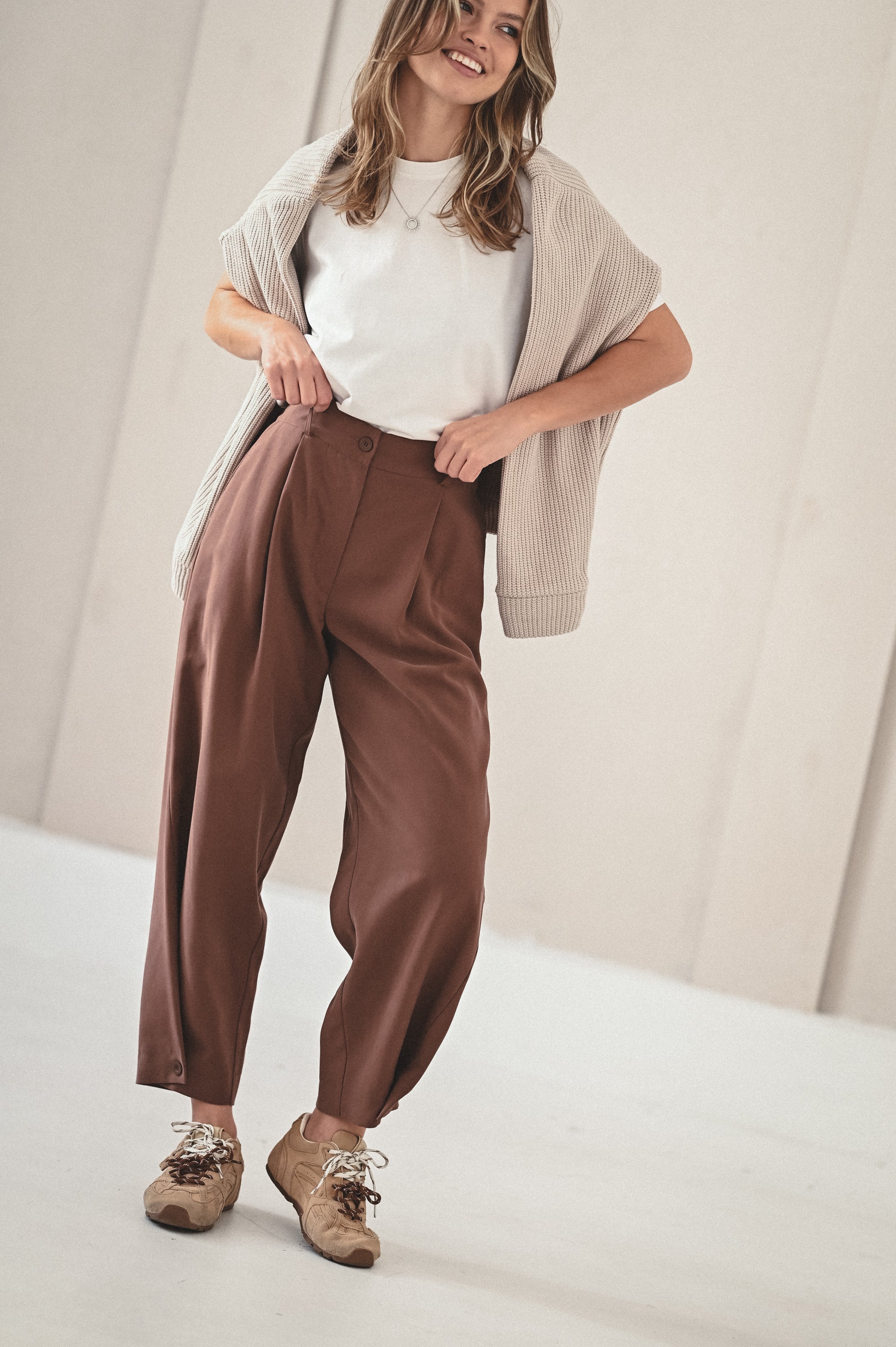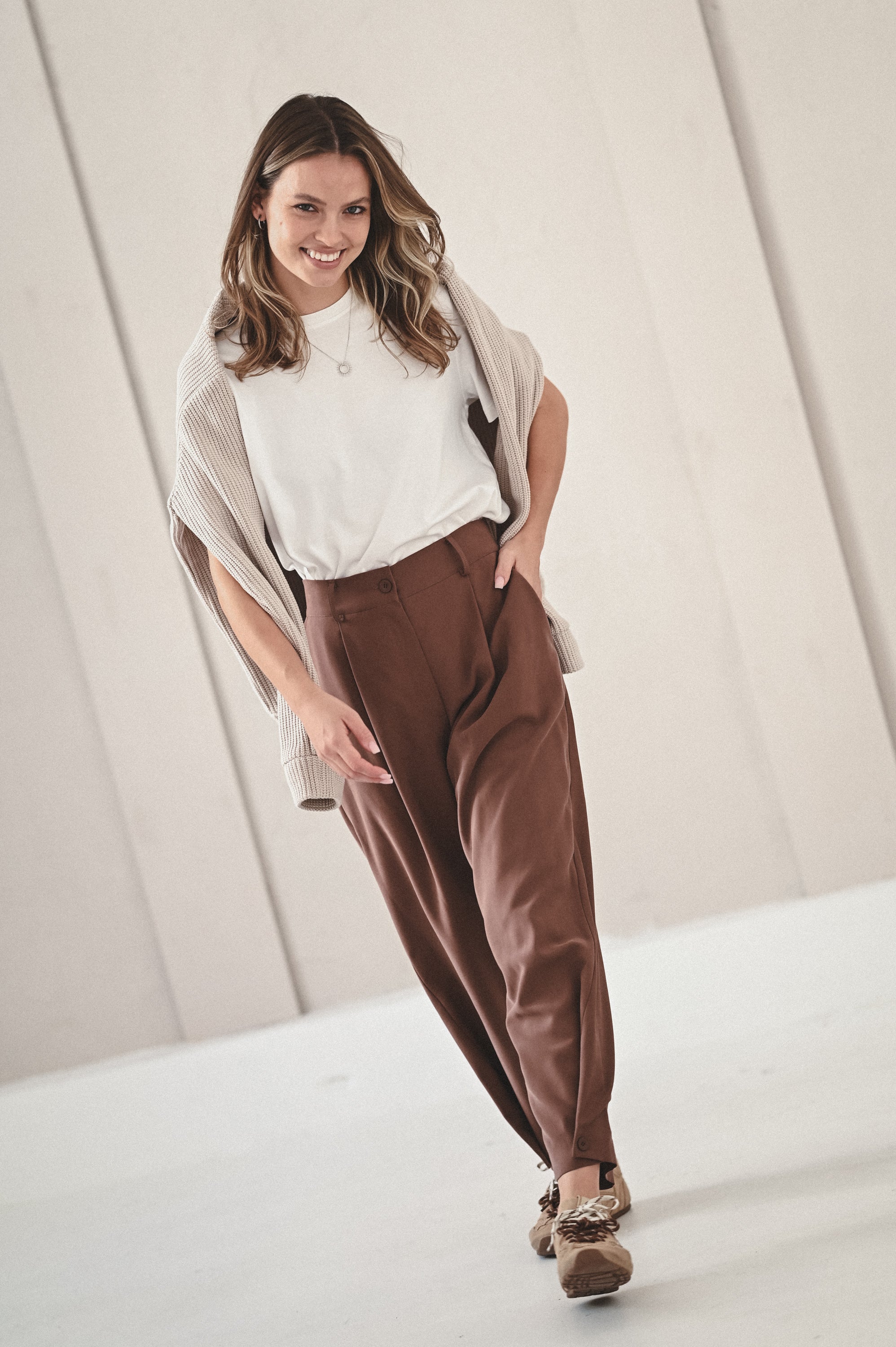Wysoki stan optycznie wydłuża nogi, a komfort noszenia zapewnia elastyczna gumka z tyłu i zapinany na guzik pasek z przodu. Nogawki są swobodne w udach, zwężane ku dołowi i zakończone ozdobnym guzikiem – detalem, który dodaje im oryginalnego charakteru.