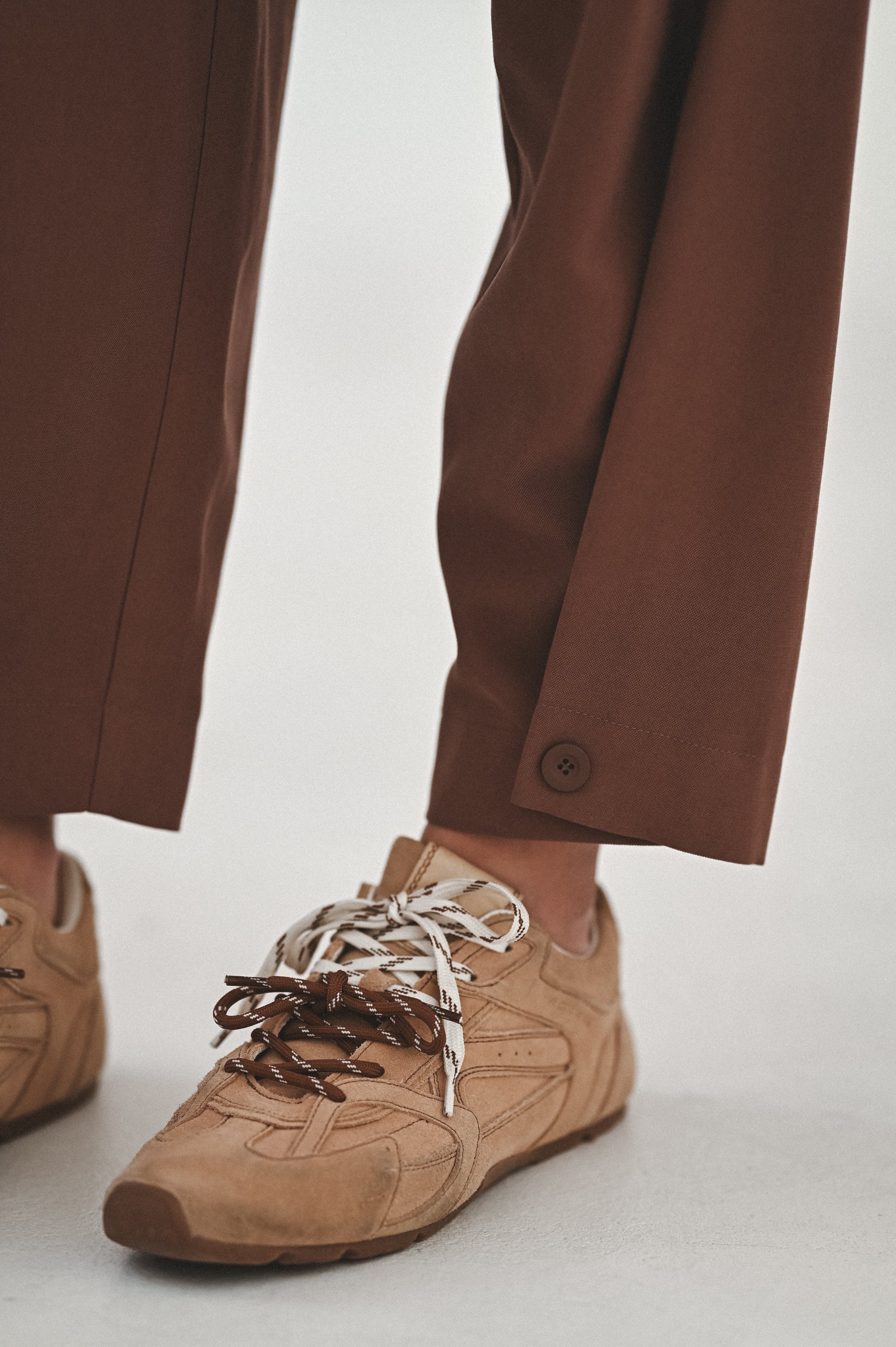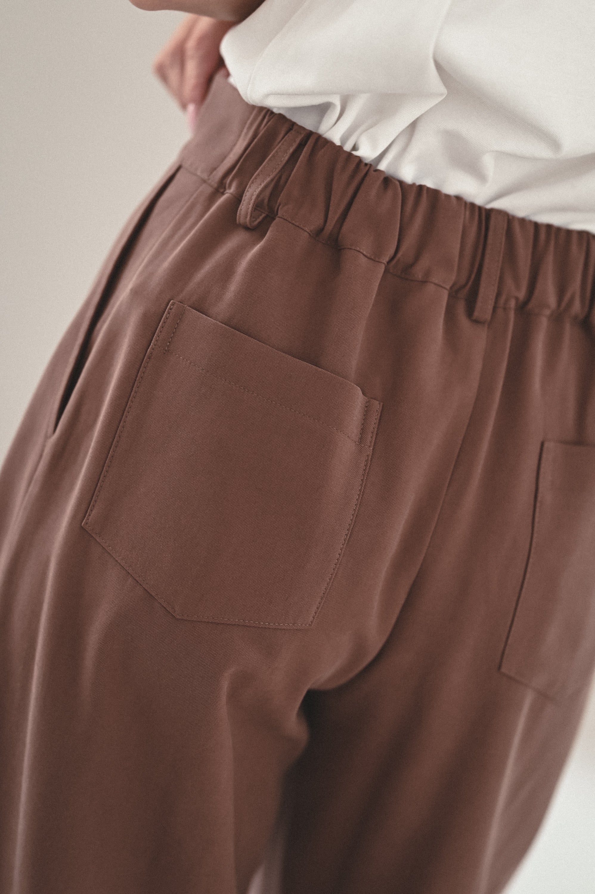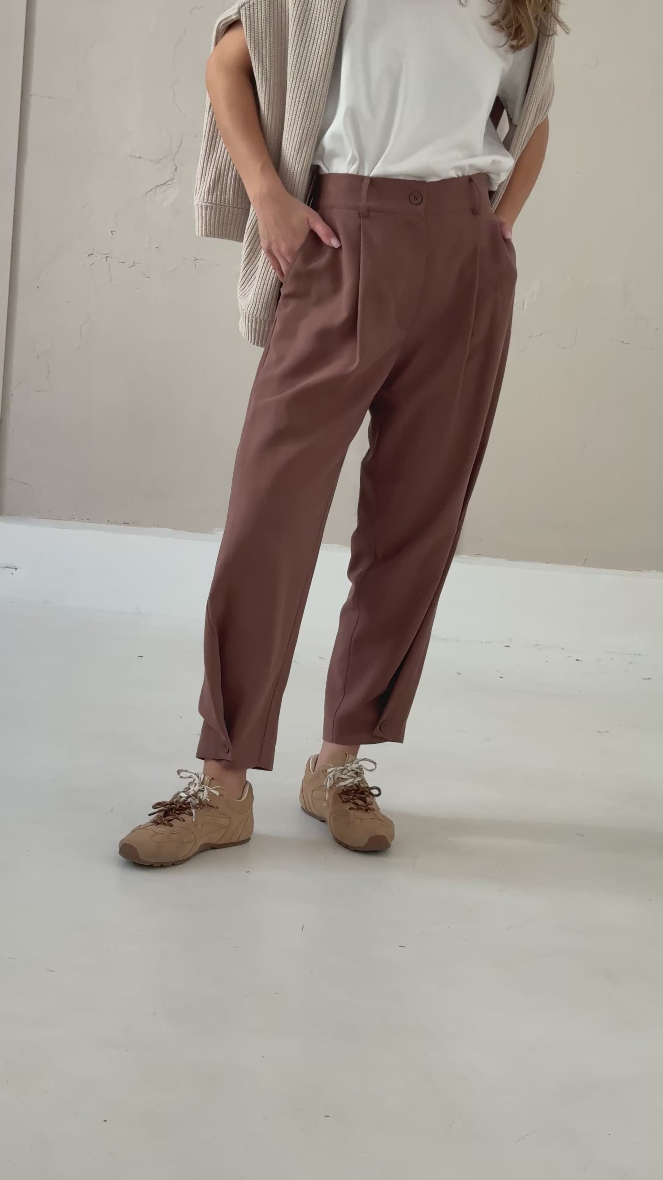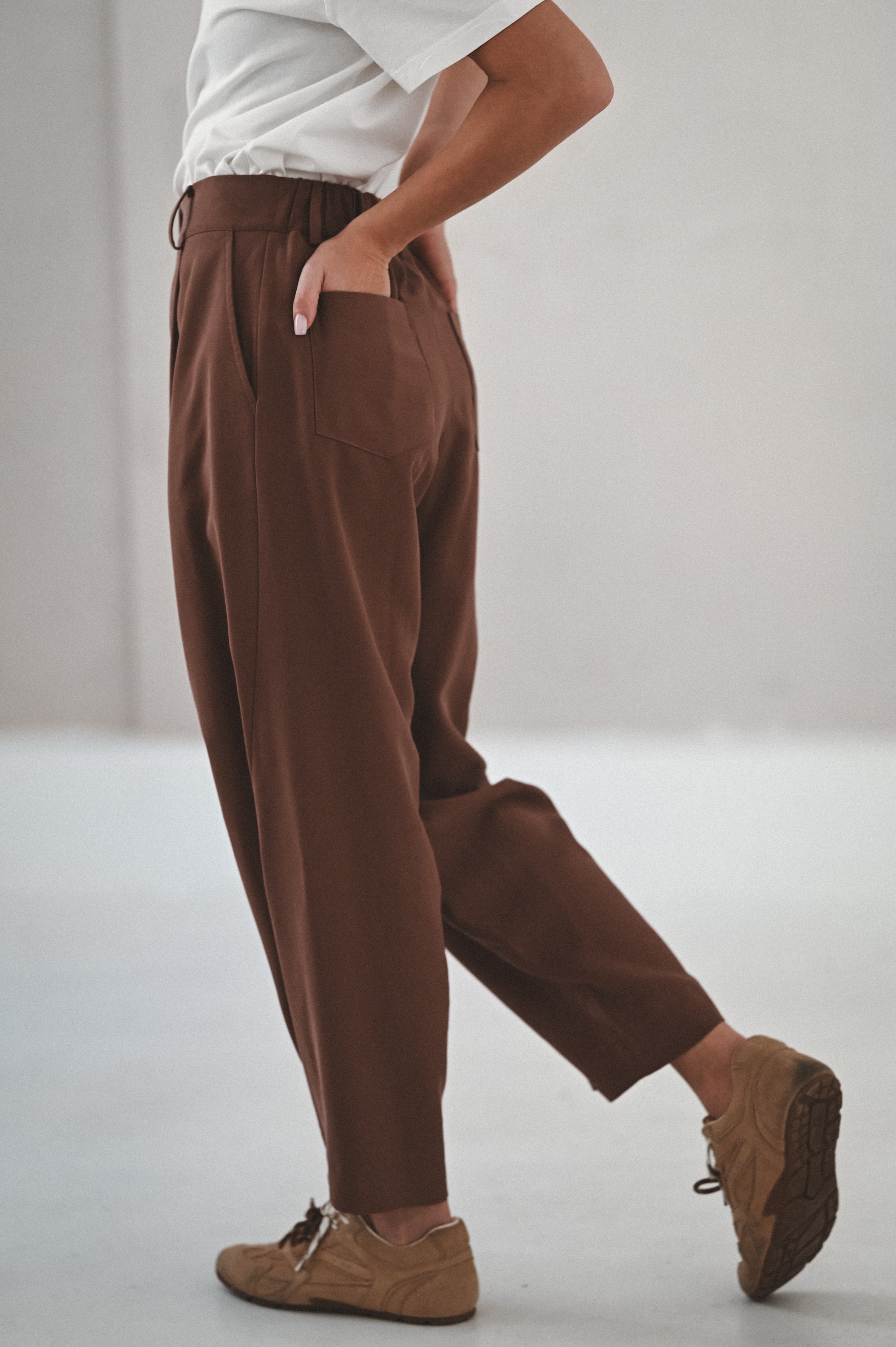 Wysoki stan optycznie wydłuża nogi, a komfort noszenia zapewnia elastyczna gumka z tyłu i zapinany na guzik pasek z przodu. Nogawki są swobodne w udach, zwężane ku dołowi i zakończone ozdobnym guzikiem – detalem, który dodaje im oryginalnego charakteru.