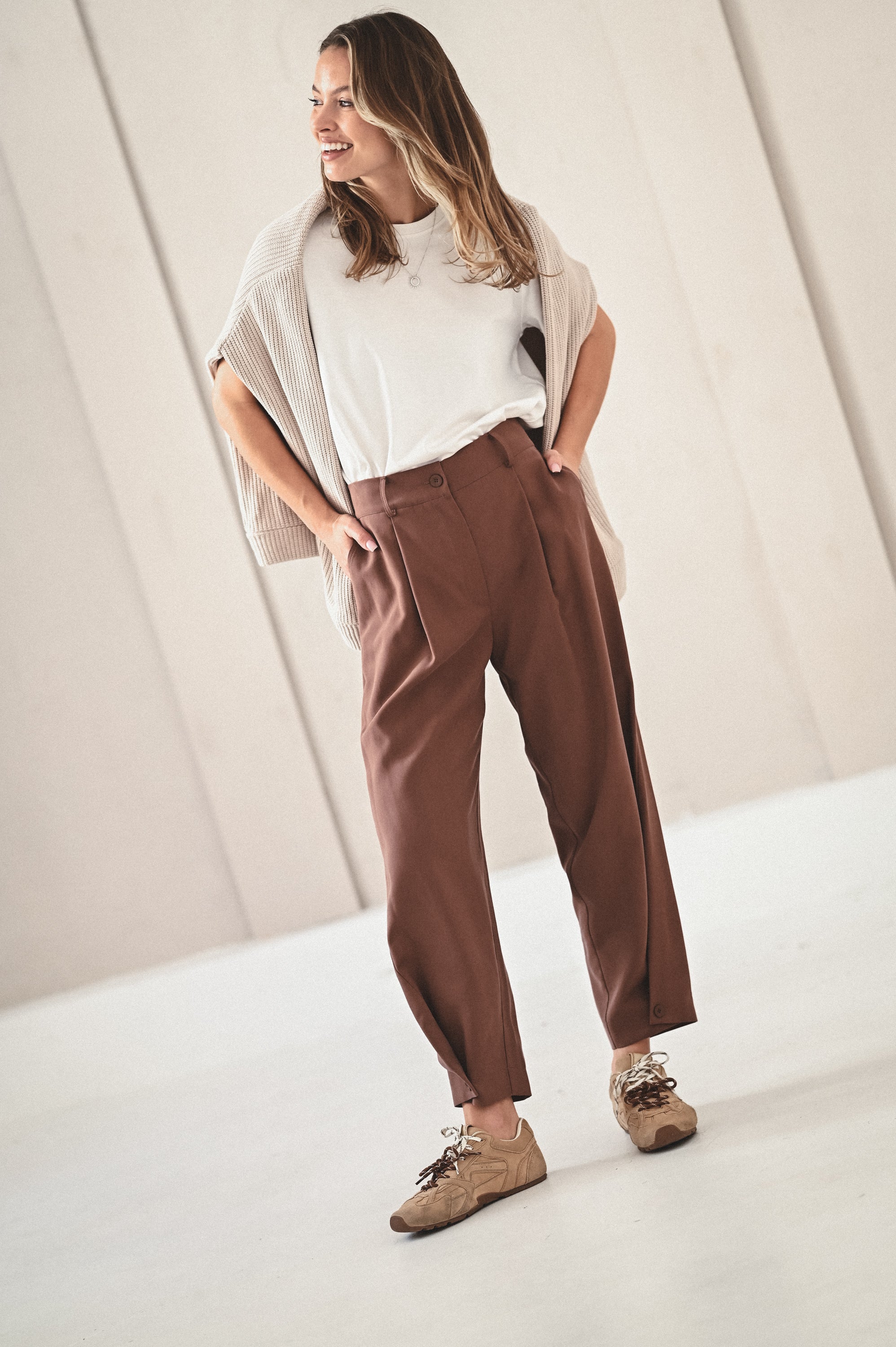 Stylowe i wygodne – te spodnie o luźnym kroju typu carrot to doskonały wybór na co dzień i do pracy. Wykonane z miękkiej tkaniny, są przyjemne dla skóry i świetnie układają się na sylwetce.