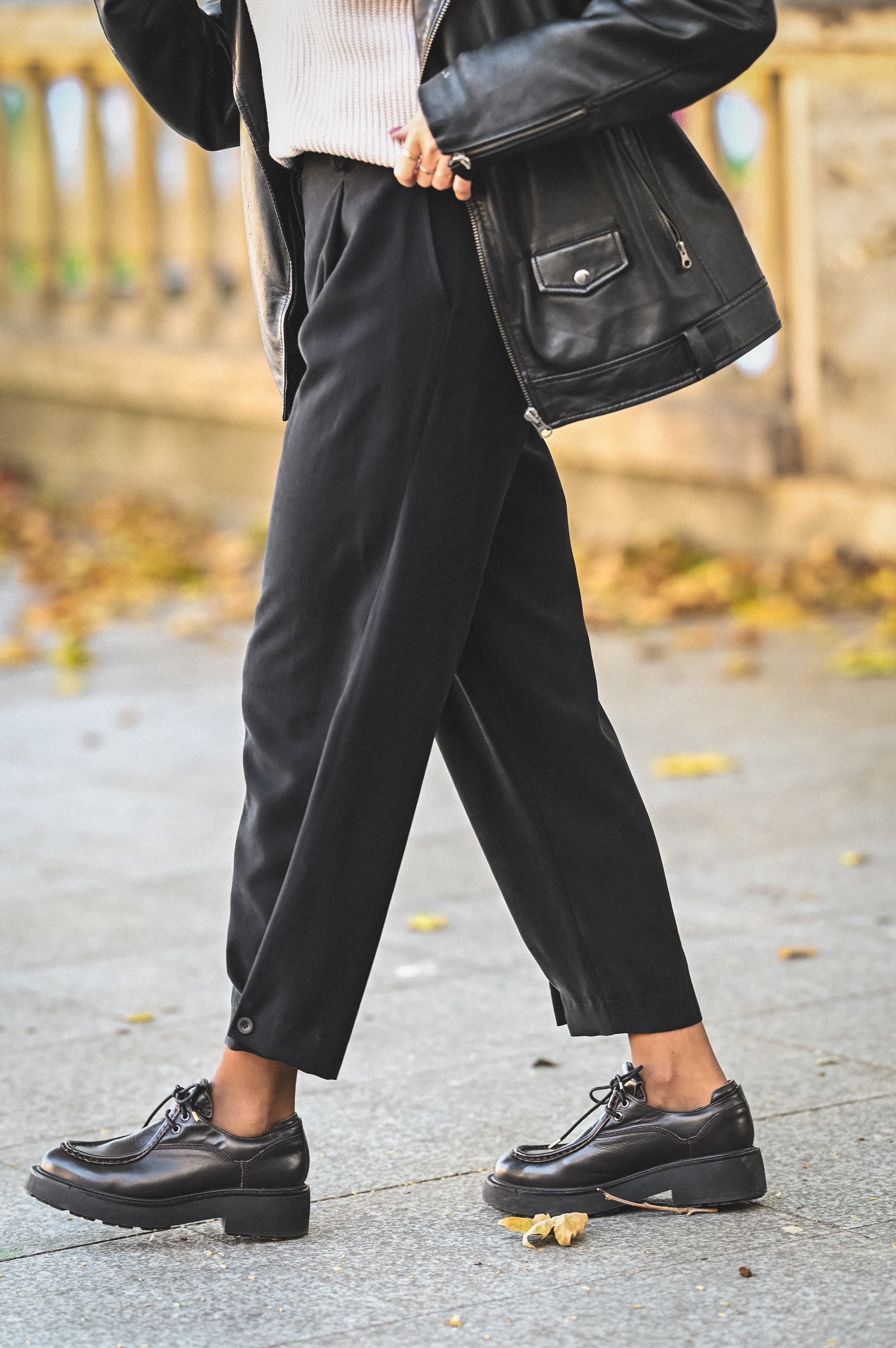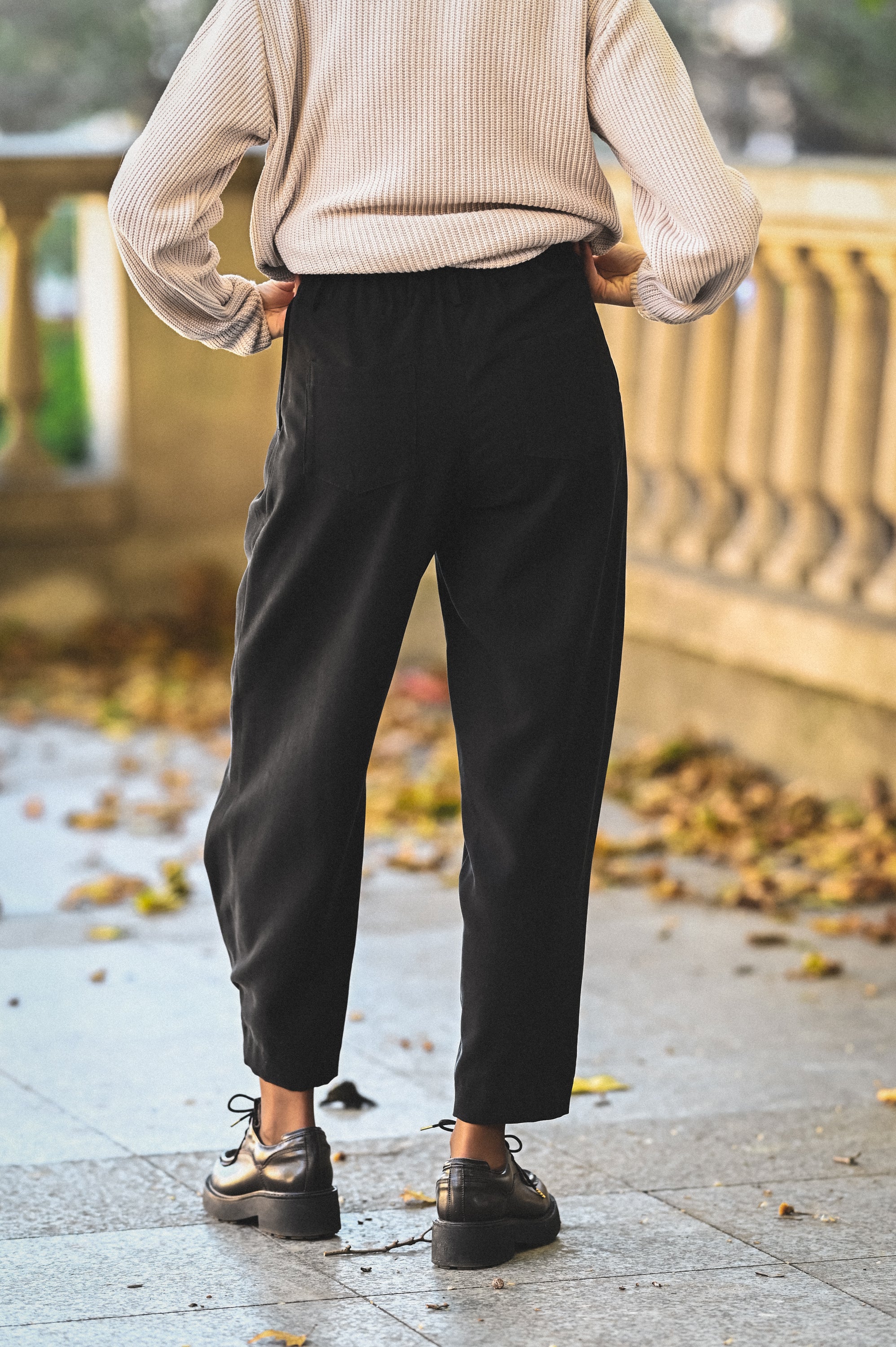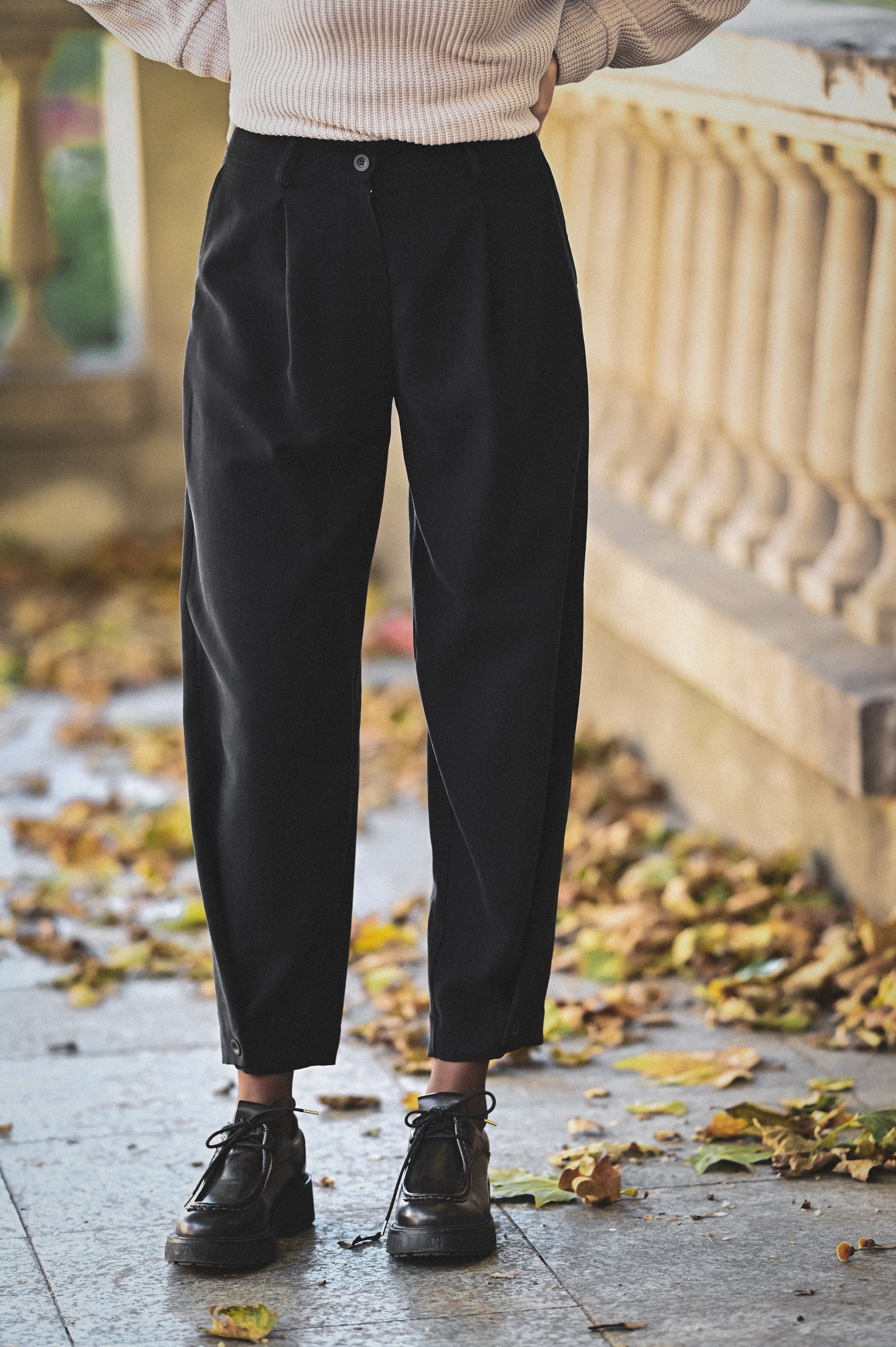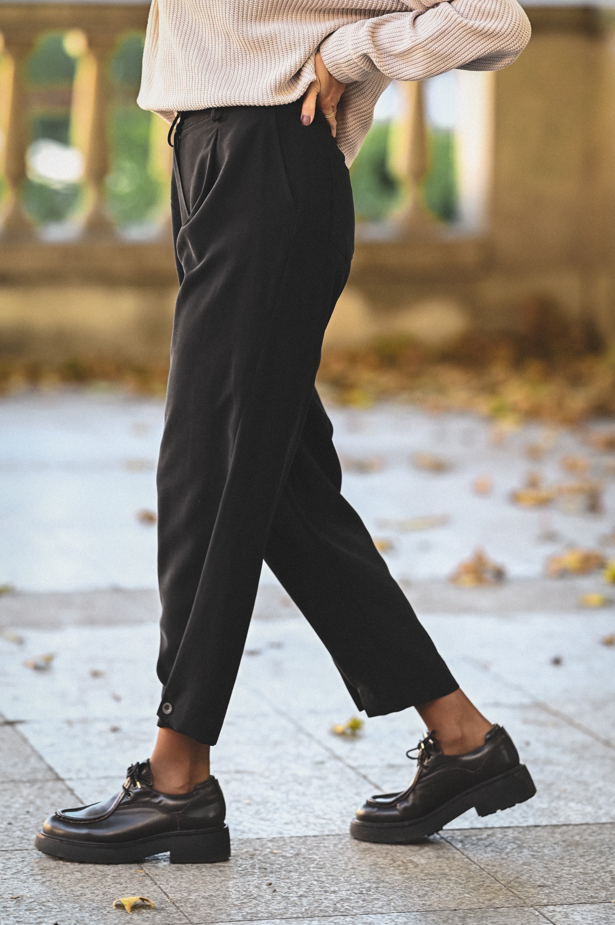 Wysoki stan optycznie wydłuża nogi, a komfort noszenia zapewnia elastyczna gumka z tyłu i zapinany na guzik pasek z przodu. Nogawki są swobodne w udach, zwężane ku dołowi i zakończone ozdobnym guzikiem – detalem, który dodaje im oryginalnego charakteru.