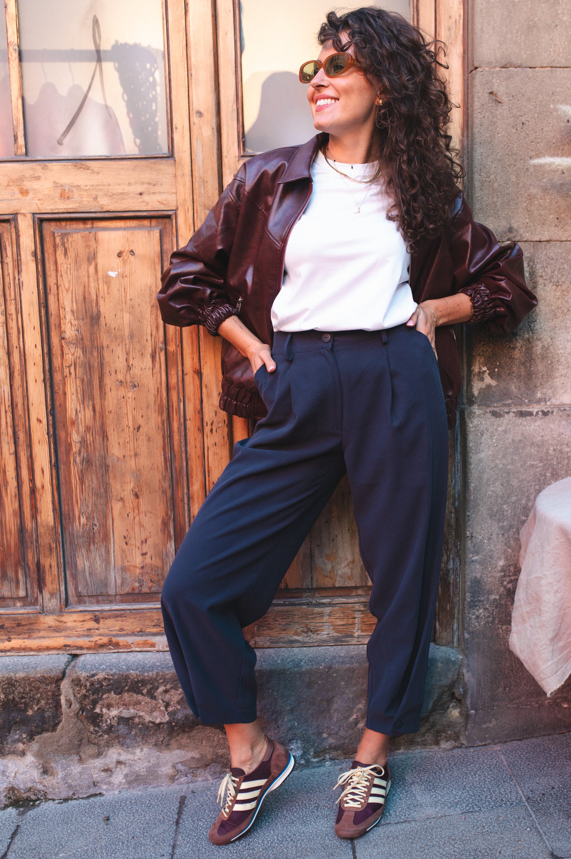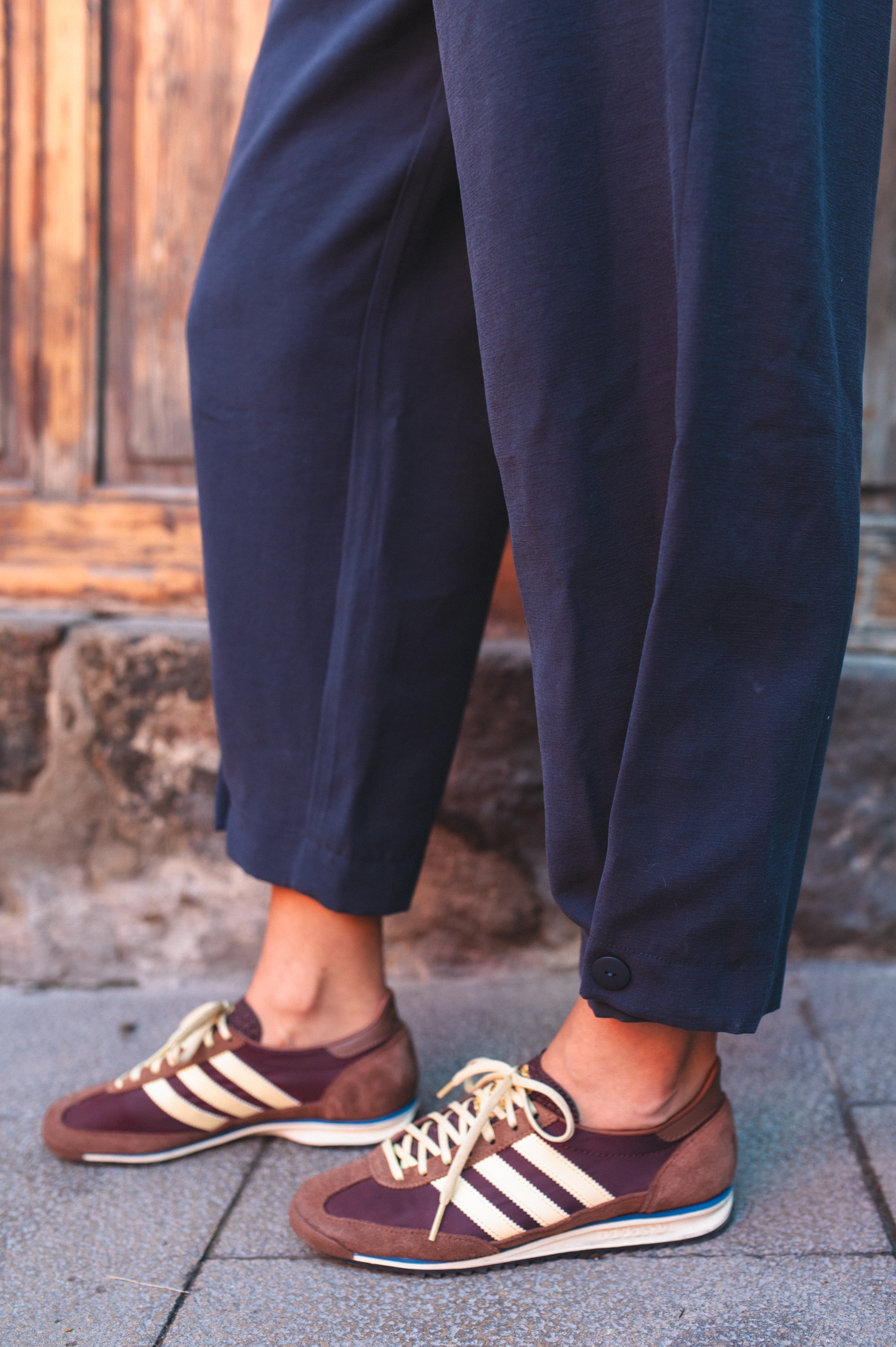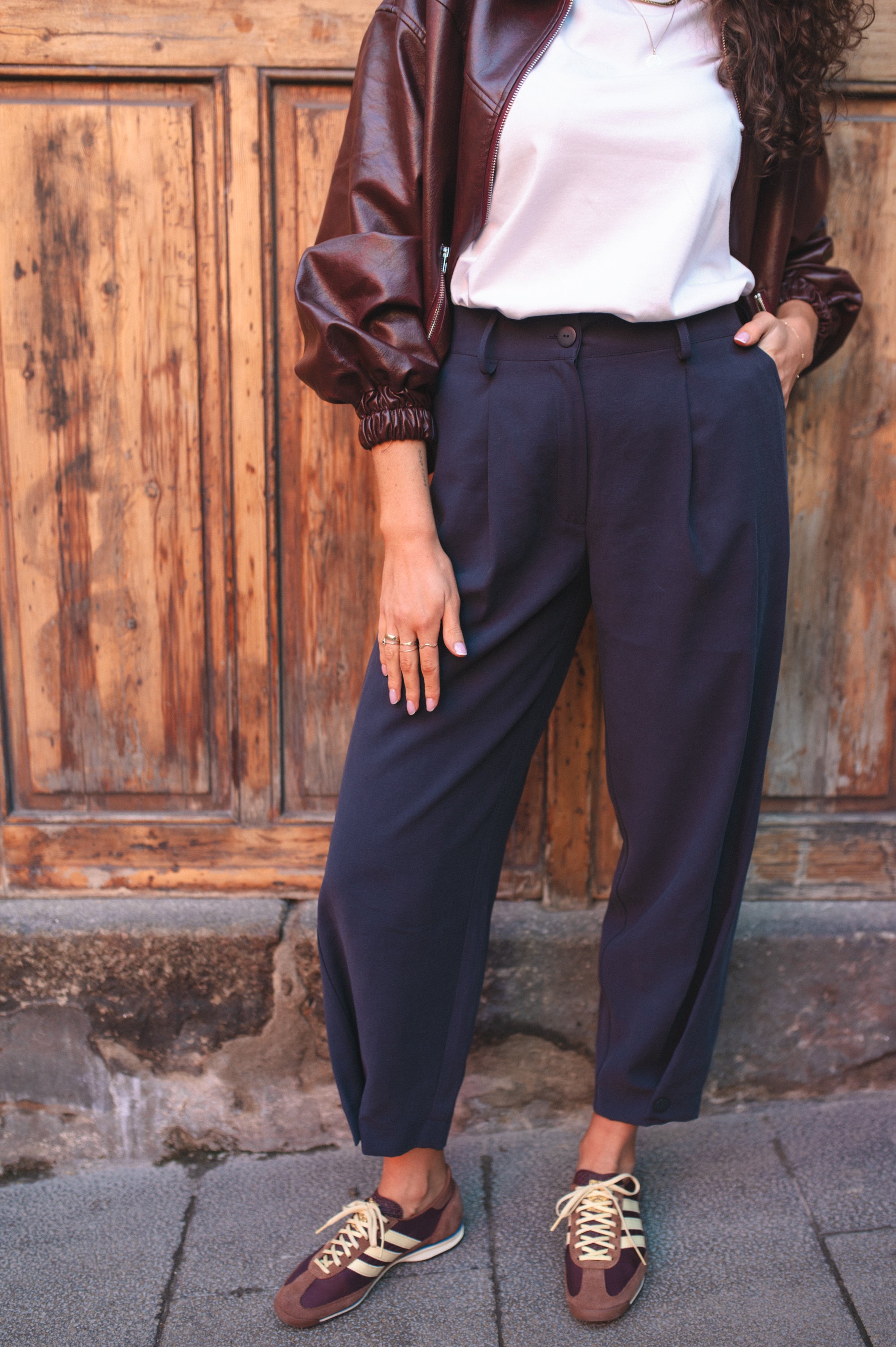 Wysoki stan optycznie wydłuża nogi, a komfort noszenia zapewnia elastyczna gumka z tyłu i zapinany na guzik pasek z przodu. Nogawki są swobodne w udach, zwężane ku dołowi i zakończone ozdobnym guzikiem – detalem, który dodaje im oryginalnego charakteru.