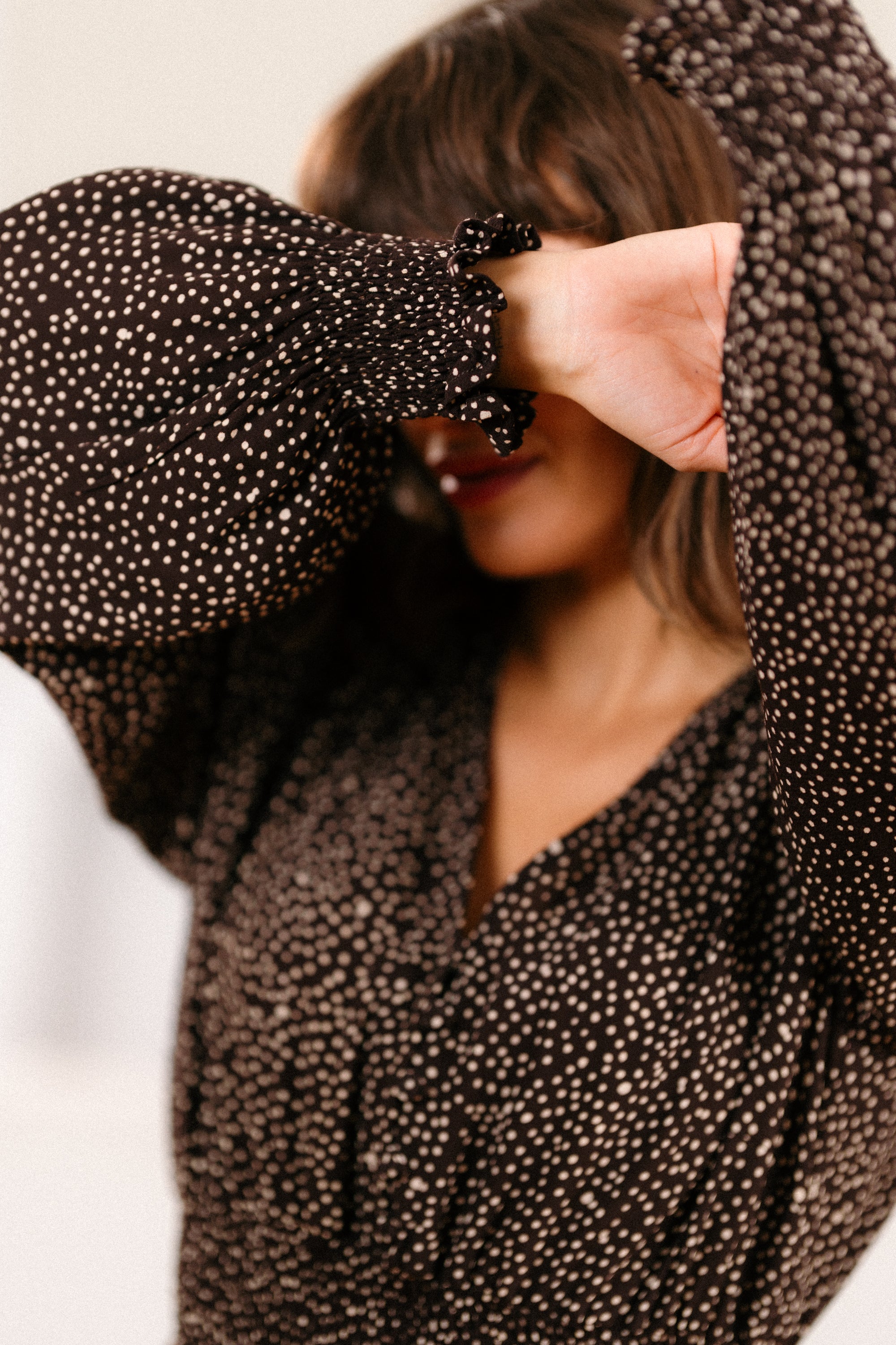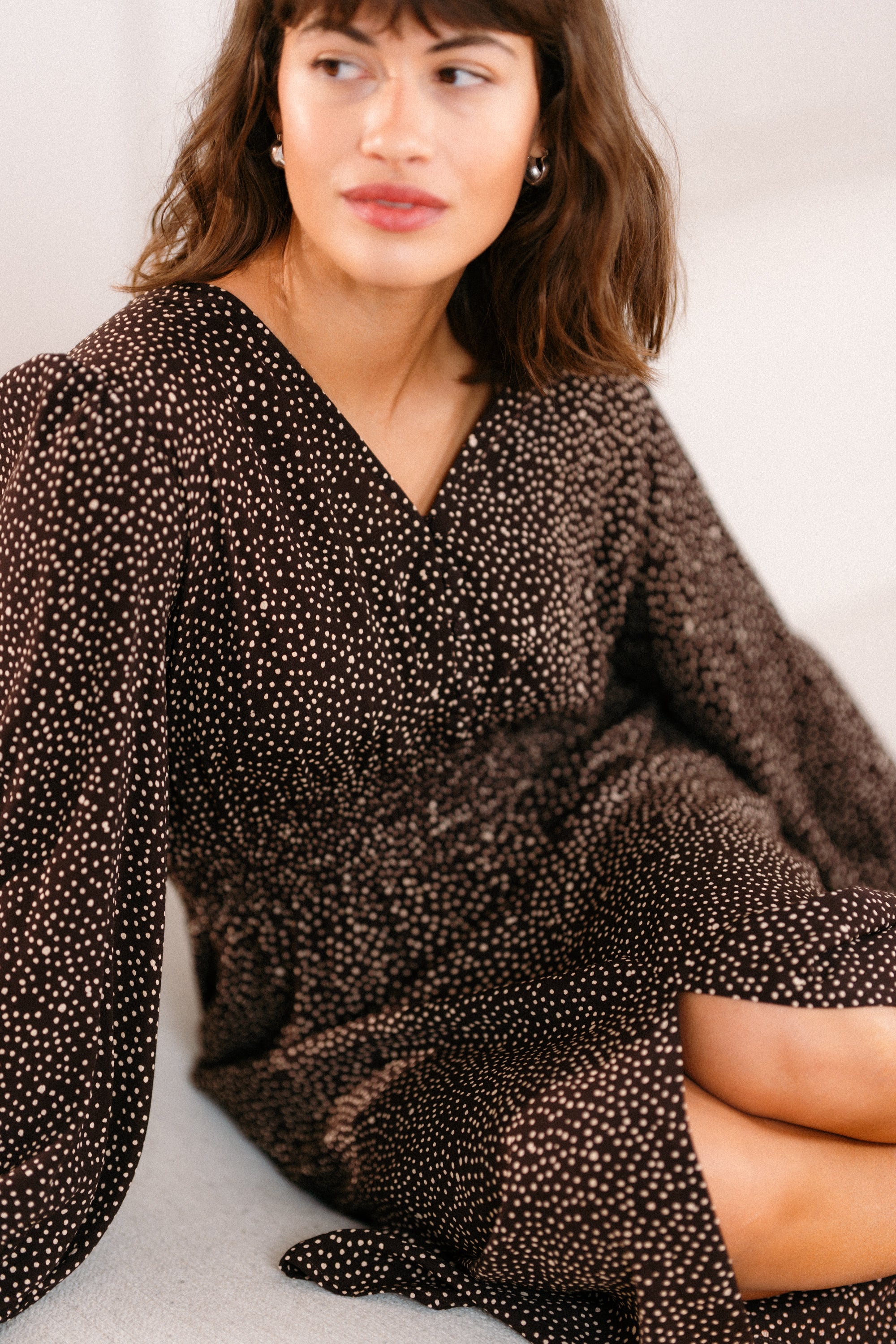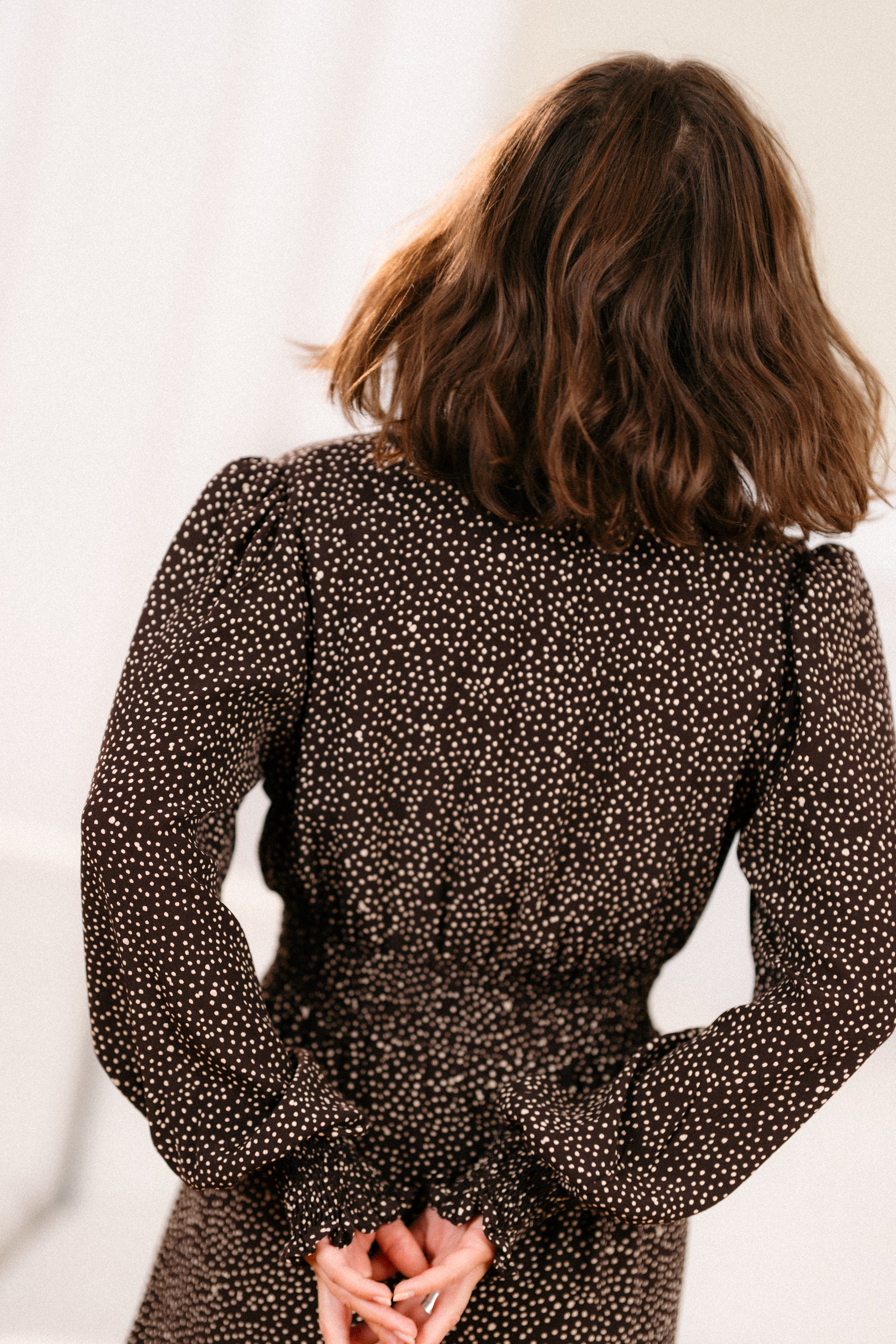 Wybierz komfort i elegancję w jednym dzięki naszej wiskozowej sukience midi, idealnej na chłodniejsze dni jesieni i zimy. Model o subtelnym dekolcie w kształcie litery V pięknie podkreśla linię szyi, a lekko bufiasty rękawek zakończony gumkowanym ściągaczem z delikatną falbanką dodaje całości romantycznego charakteru.