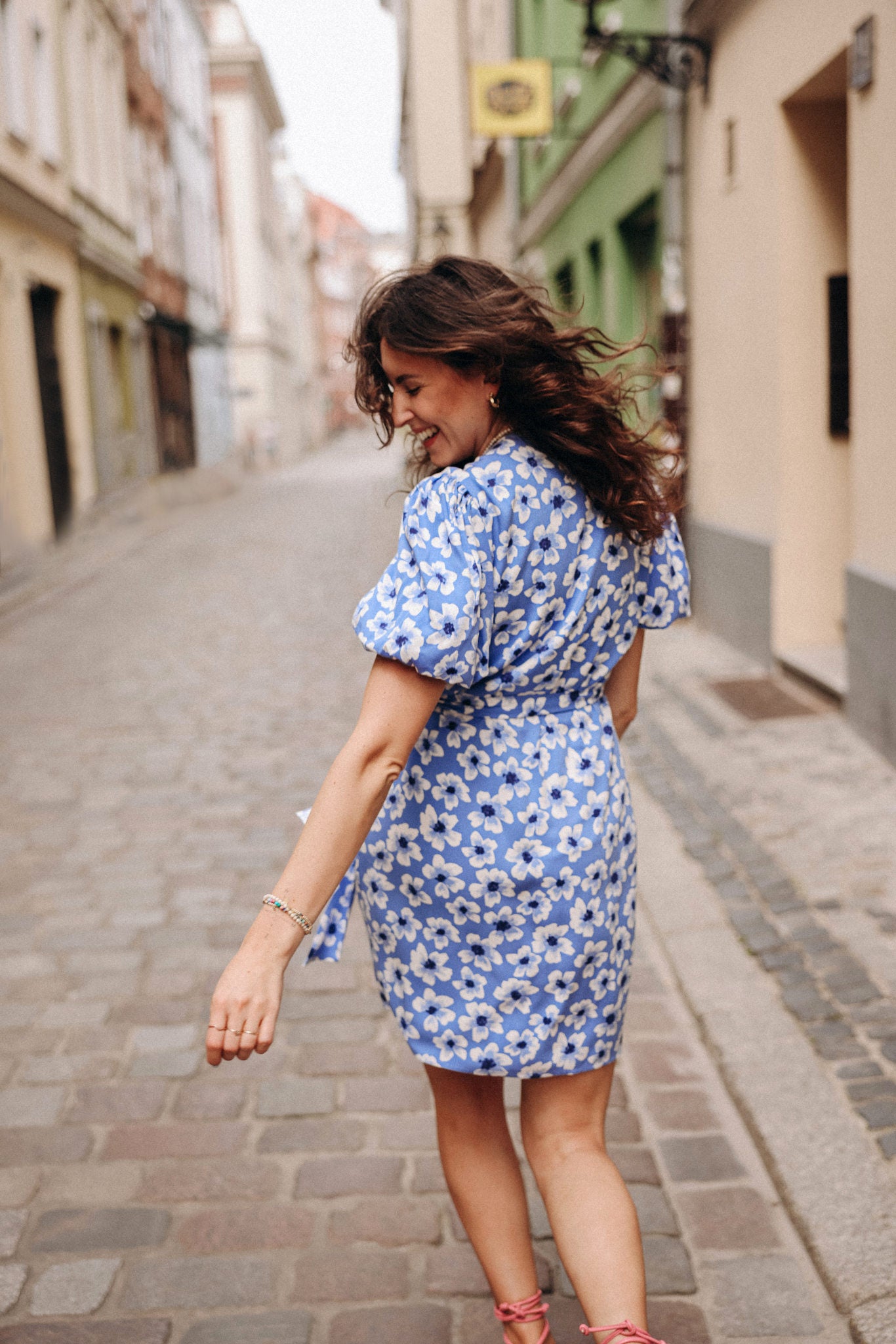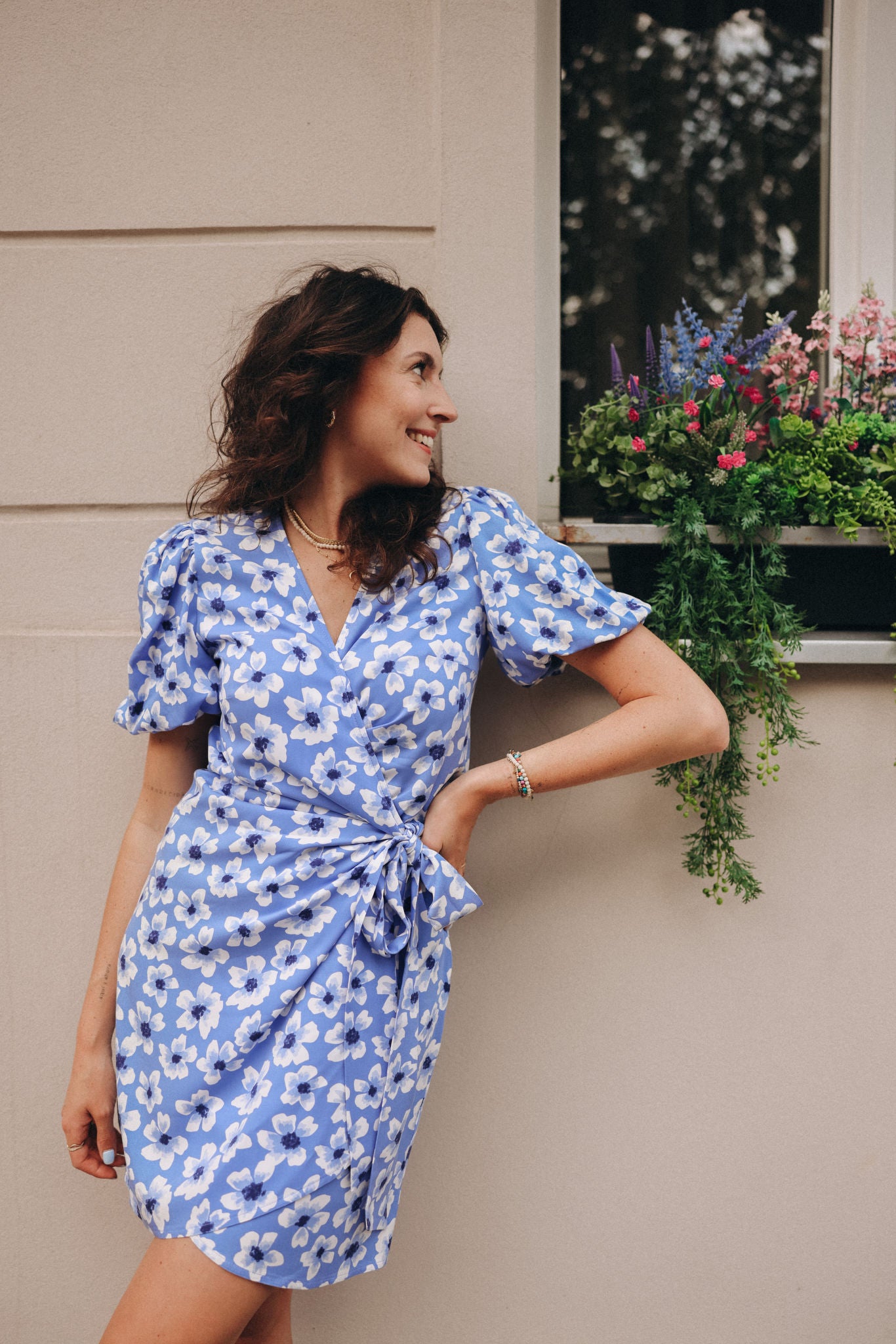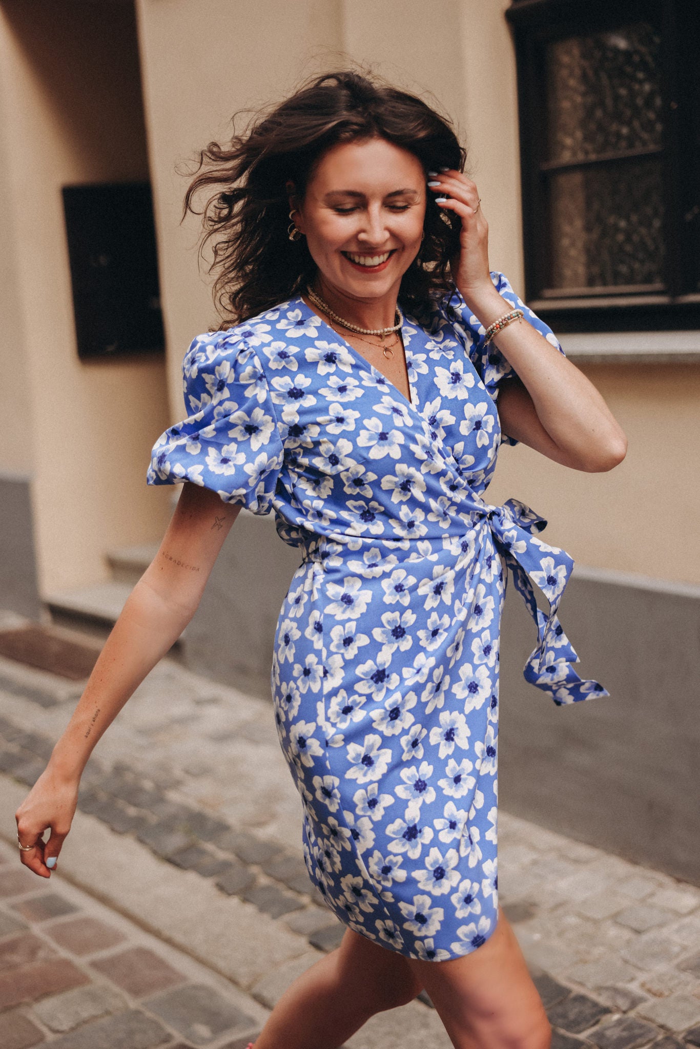 Stylowa i kobieca sukienka o klasycznym, prostym kroju to połączenie ponadczasowej formy i wygody. Kopertowy dekolt pięknie podkreśla linię szyi, a możliwość wyboru dwóch sposobów wiązania – na gładko lub z delikatnym marszczeniem – pozwala dopasować fason do sylwetki i okazji.