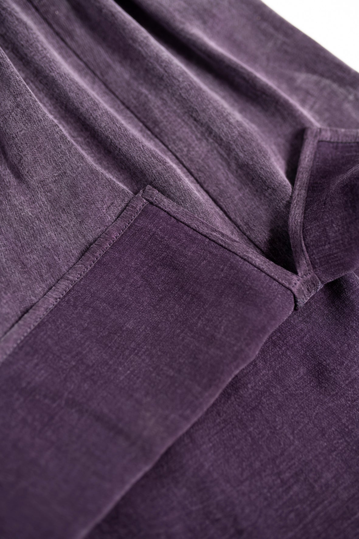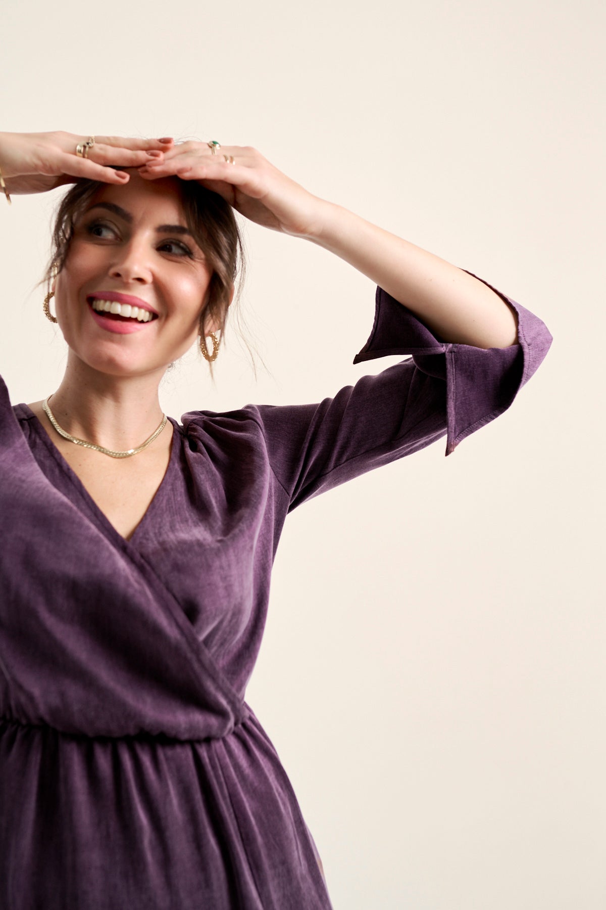 Sukienka o prostym kroju i długości mini, która łączy wygodę z kobiecymi detalami. Marszczony karczek dodaje jej lekkości i subtelnej objętości, a długie rękawy zakończone asymetrycznym rozcięciem nadają całości nowoczesnego charakteru. Kopertowy dekolt w kształcie litery V, zapinany na napę, pięknie podkreśla linię szyi. Gumka w talii zapewnia komfort i delikatnie akcentuje sylwetkę, a ozdobne rozcięcie na lewej nodze dodaje sukience lekkości i swobody ruchów. Idealna propozycja zarówno na co dzień, jak i na wyjątkowe okazje.