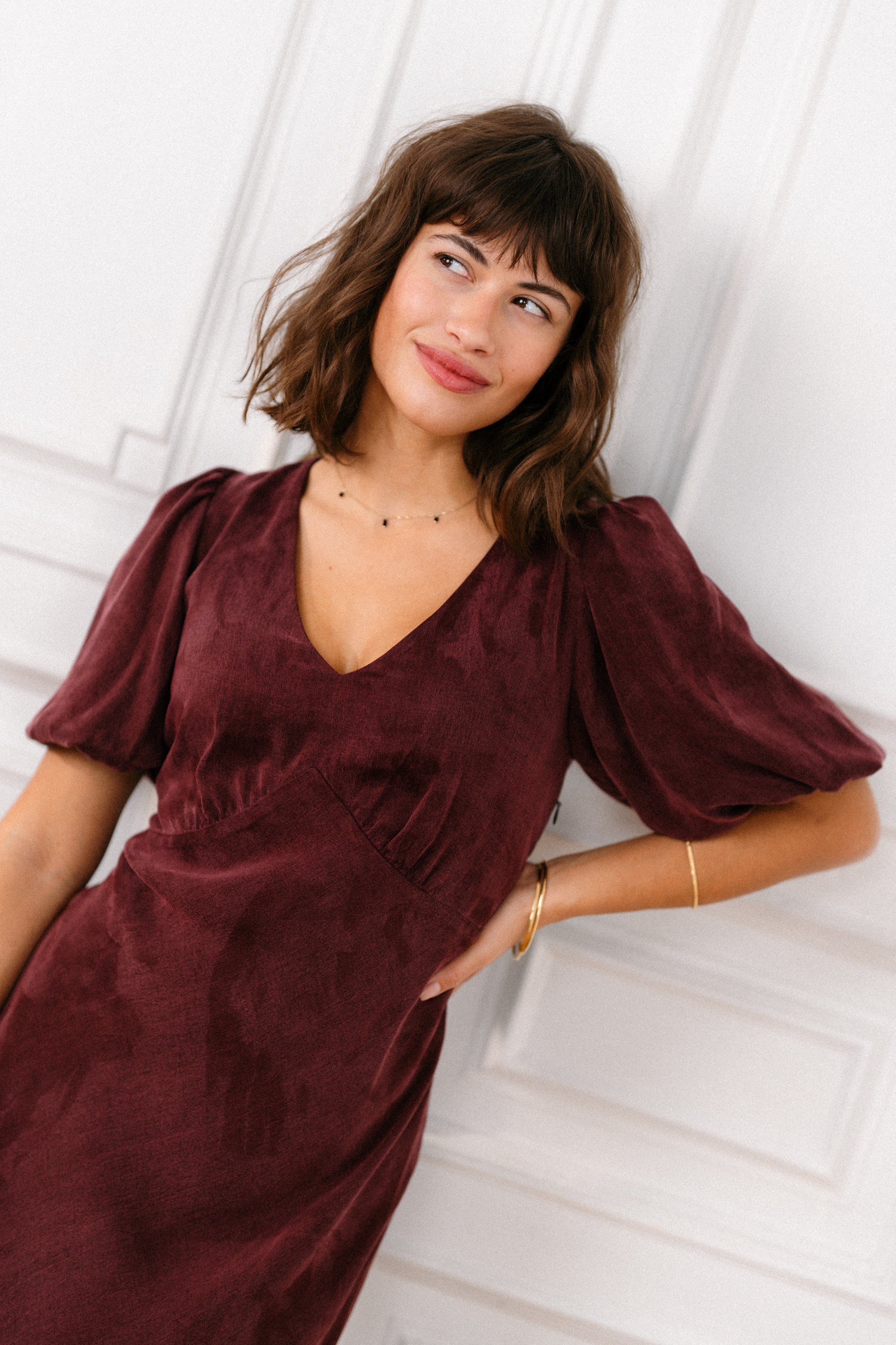 Romantycznego charakteru dodaje bufiasty, krótki rękaw, który wprowadza lekkość i finezję. Zarówno z przodu, jak i z tyłu uwagę przyciąga dekolt V, nadający całości zmysłowego wyrazu. Plecy zdobi dekoracyjne wiązanie, subtelnie podkreślające wyjątkowy styl sukienki.