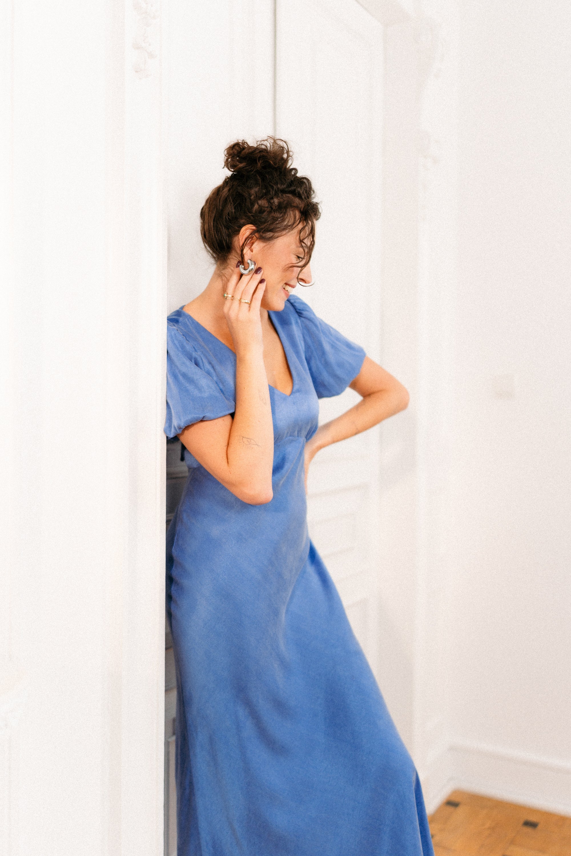 Ta sukienka zachwyca swoją lekkością i kobiecą elegancją. Krój szyty ze skosu nadaje jej naturalną miękkość oraz pięknie układającą się, opływową formę, która subtelnie podkreśla sylwetkę. Długość maxi dodaje jej szyku, a przeszycia delikatnie podkreślające biust oraz marszczenie pod linią biustu tworzą harmonijny, wysmuklający efekt.