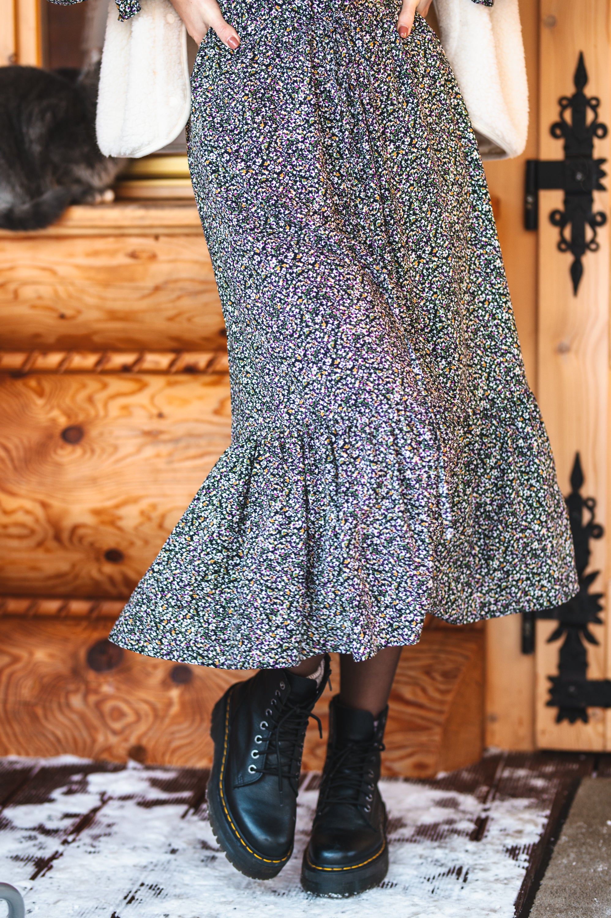 Sukienka zakończona jest falbaną na dole.