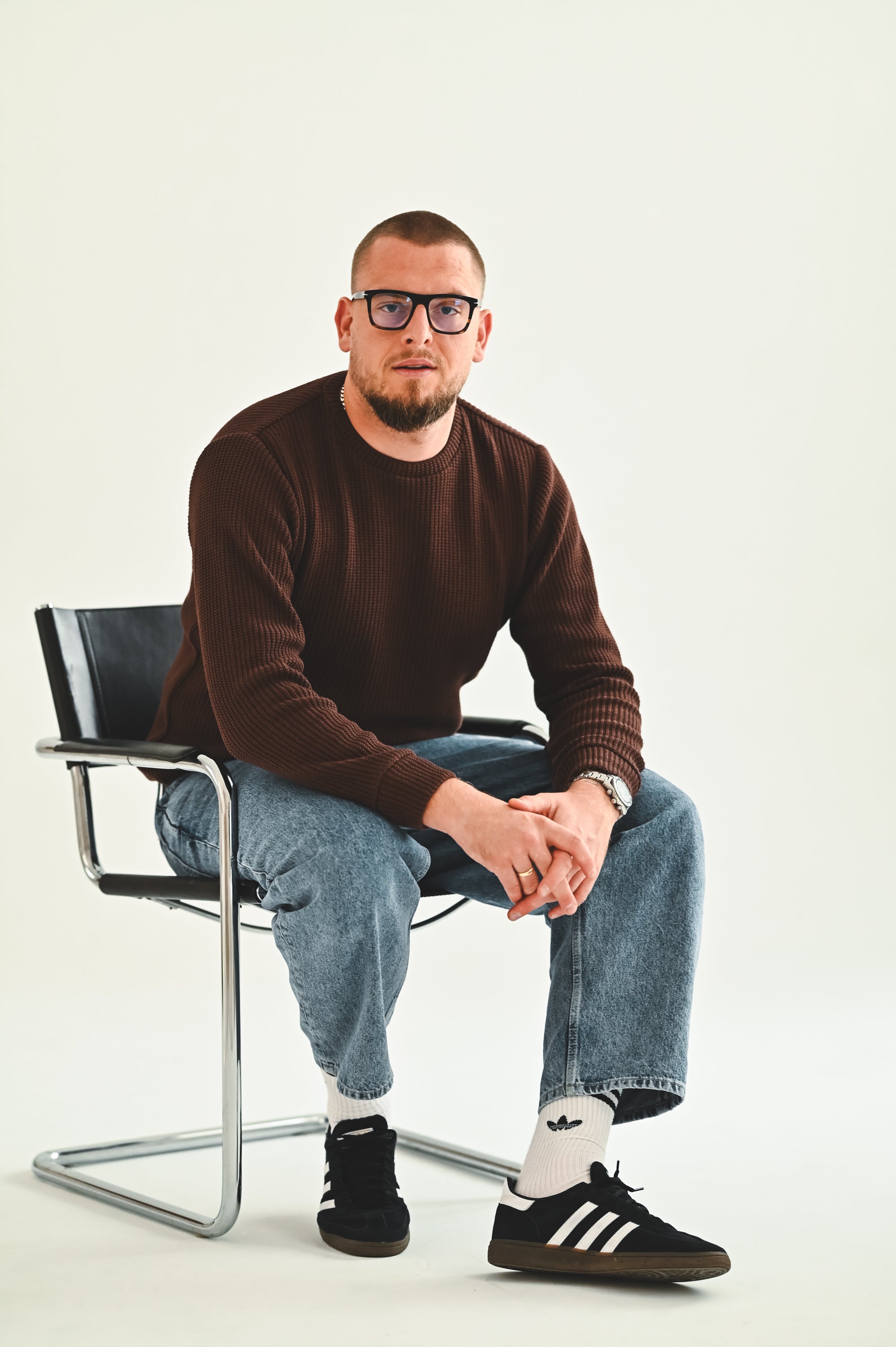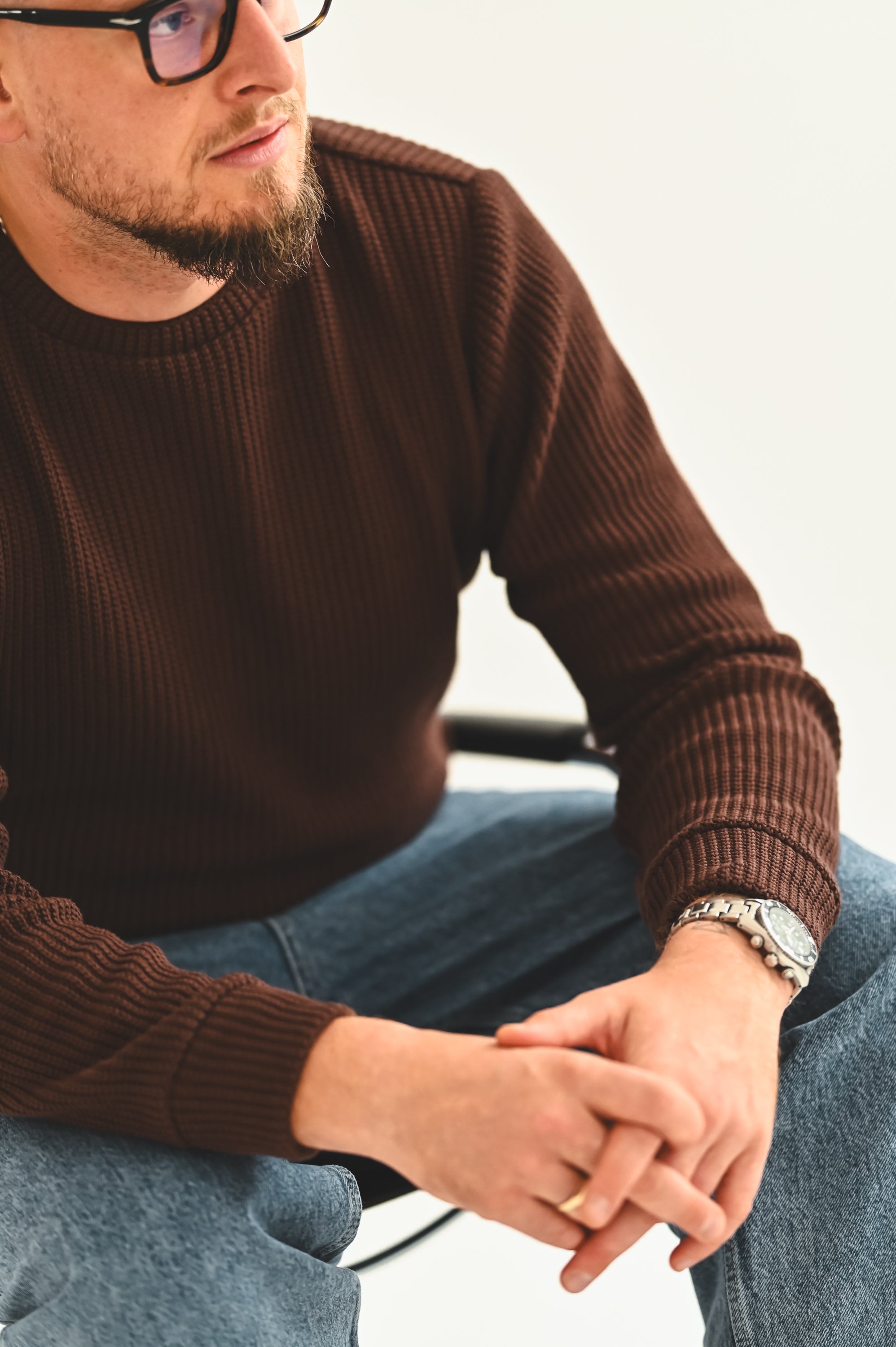 Sweter męski zakładany przez głowę, wykonany z przyjemnej, grubej bawełny, zapewniający komfort i ciepło w chłodniejsze dni. Jego prosty krój i delikatny okrągły dekolt nadają mu klasyczny, ponadczasowy charakter. Rękawy typu reglan dodają swetrowi sportowego stylu, a ich prosty fason zapewnia swobodę ruchów. Sweter wykończony jest subtelnym, ukrytym ściągaczem, co zapewnia dopasowanie i wygodę noszenia. Dodatkowo, wnętrze swetra zostało starannie wykończone i wzmocnione bawełnianą lamówką, co gwarantuje trwałość i estetyczny wygląd przez długi czas. Idealny wybór do codziennych stylizacji, łączący prostotę z funkcjonalnością.