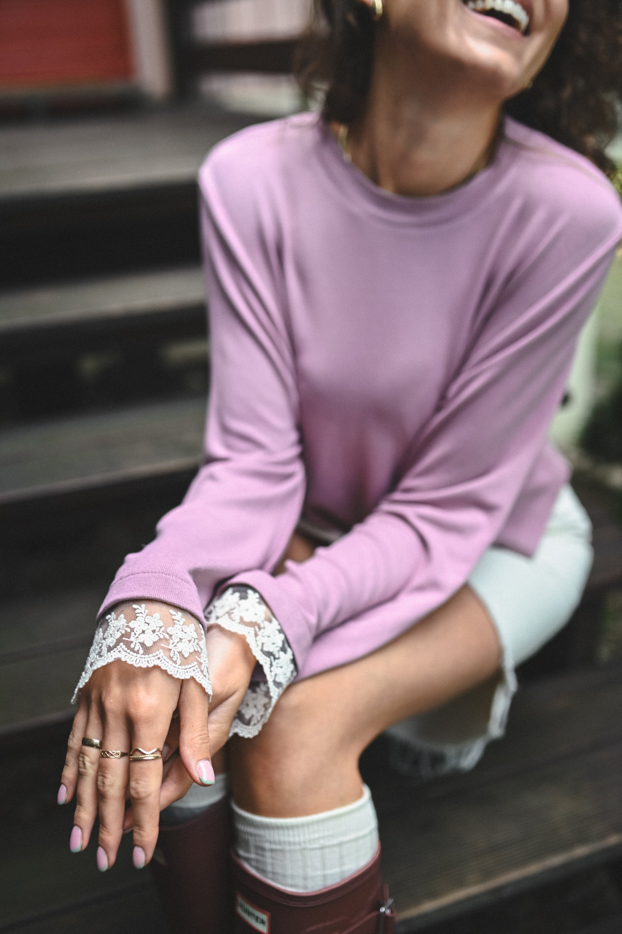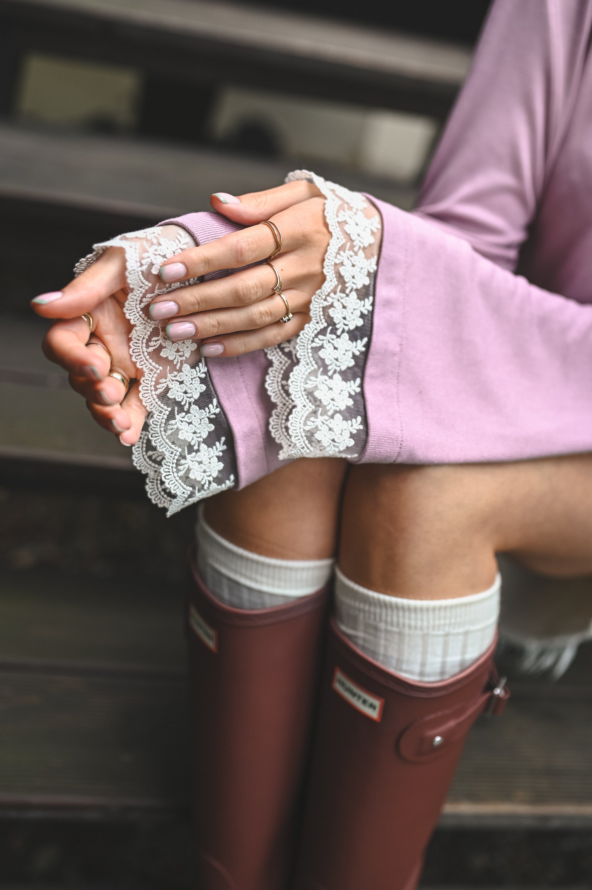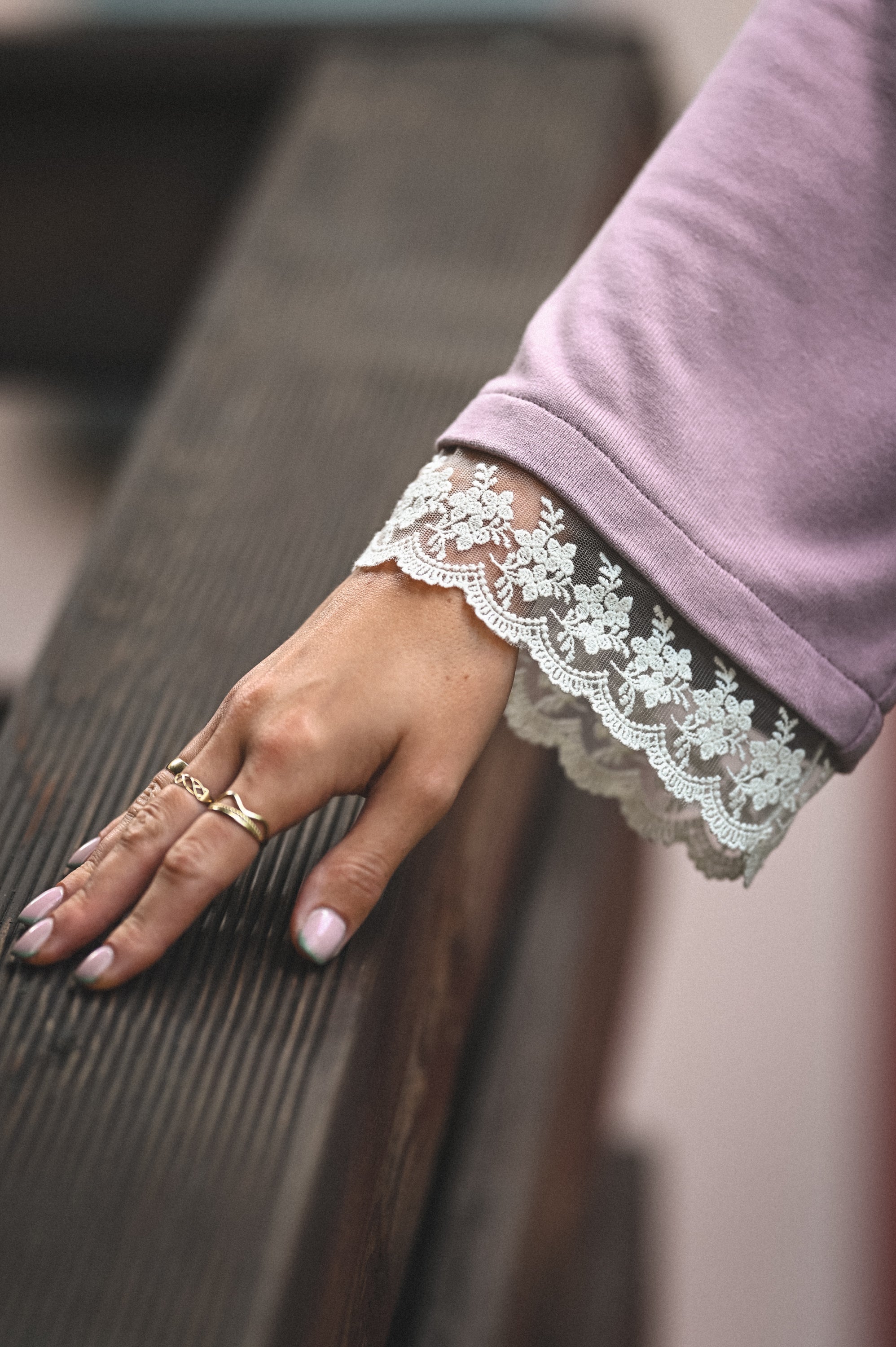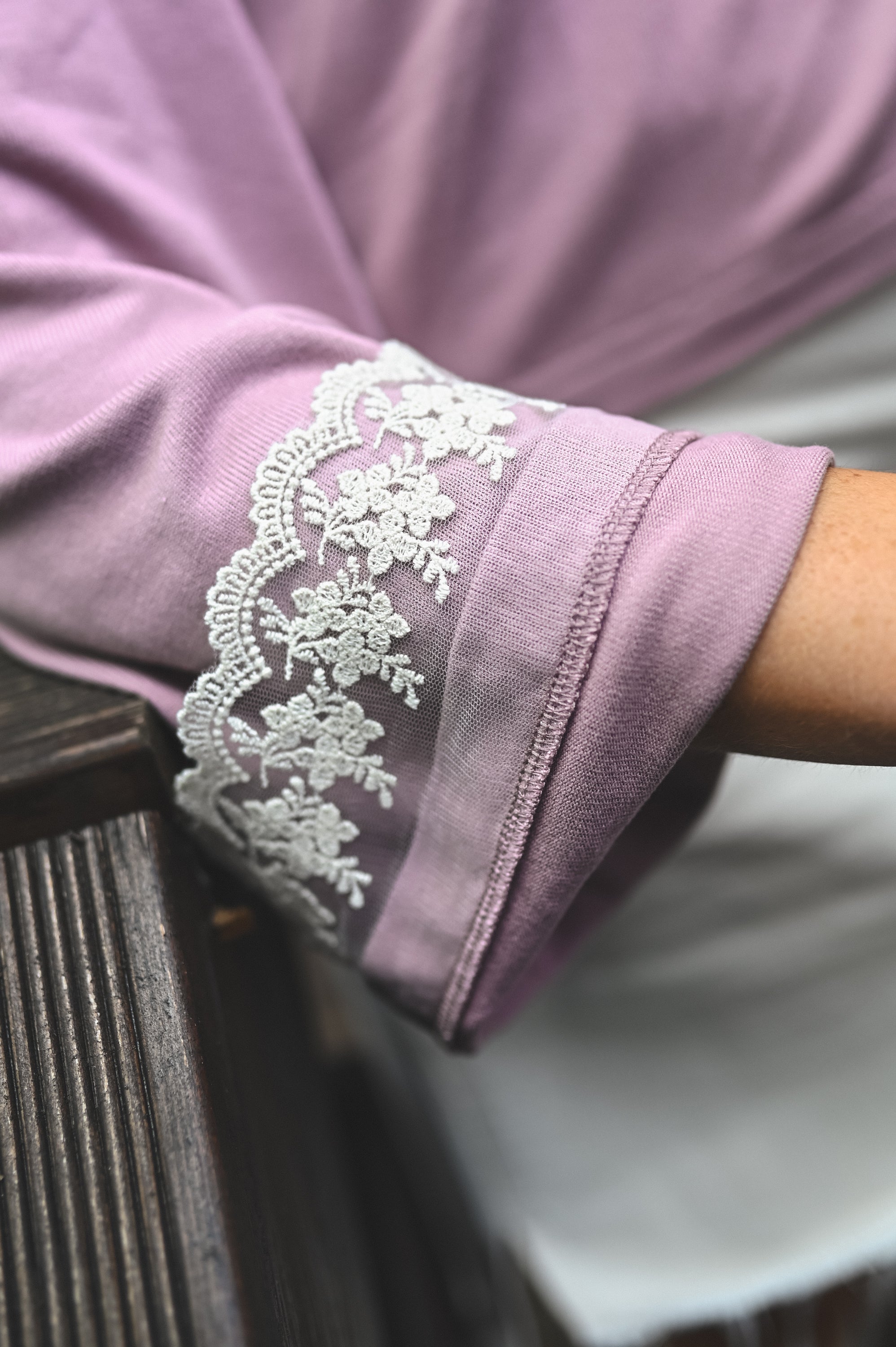 Efektowny wykończenie rękawów koronką.