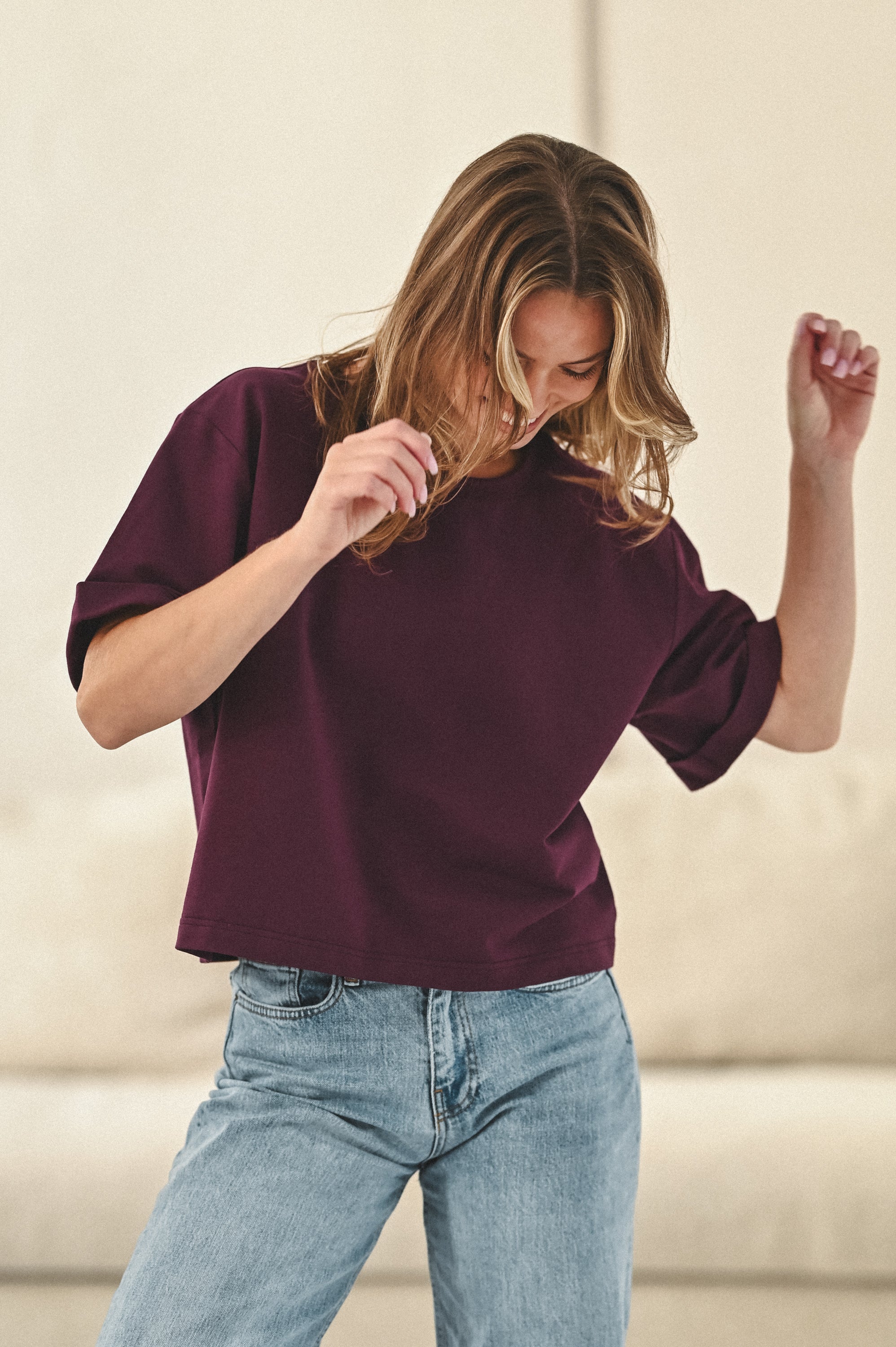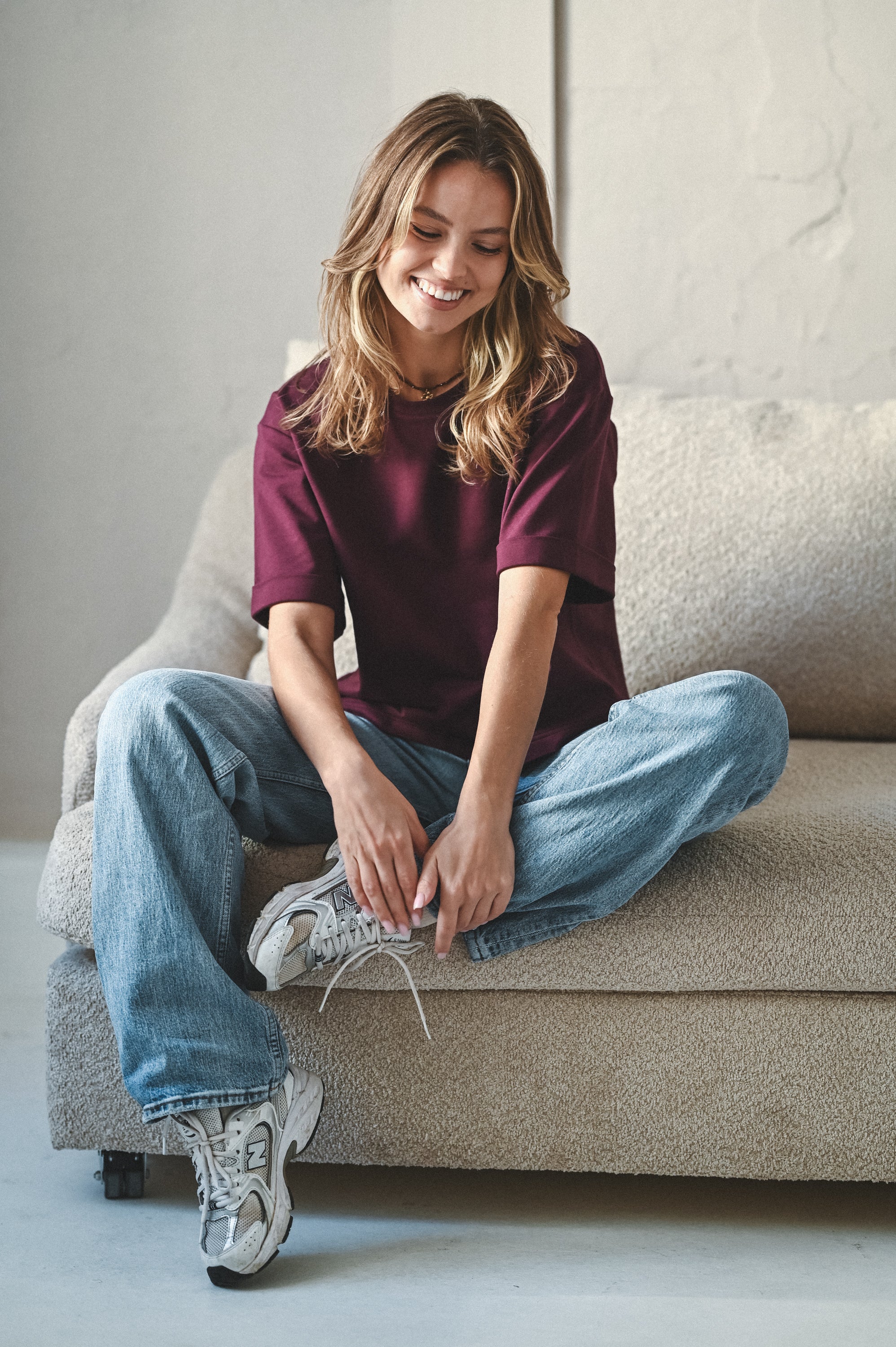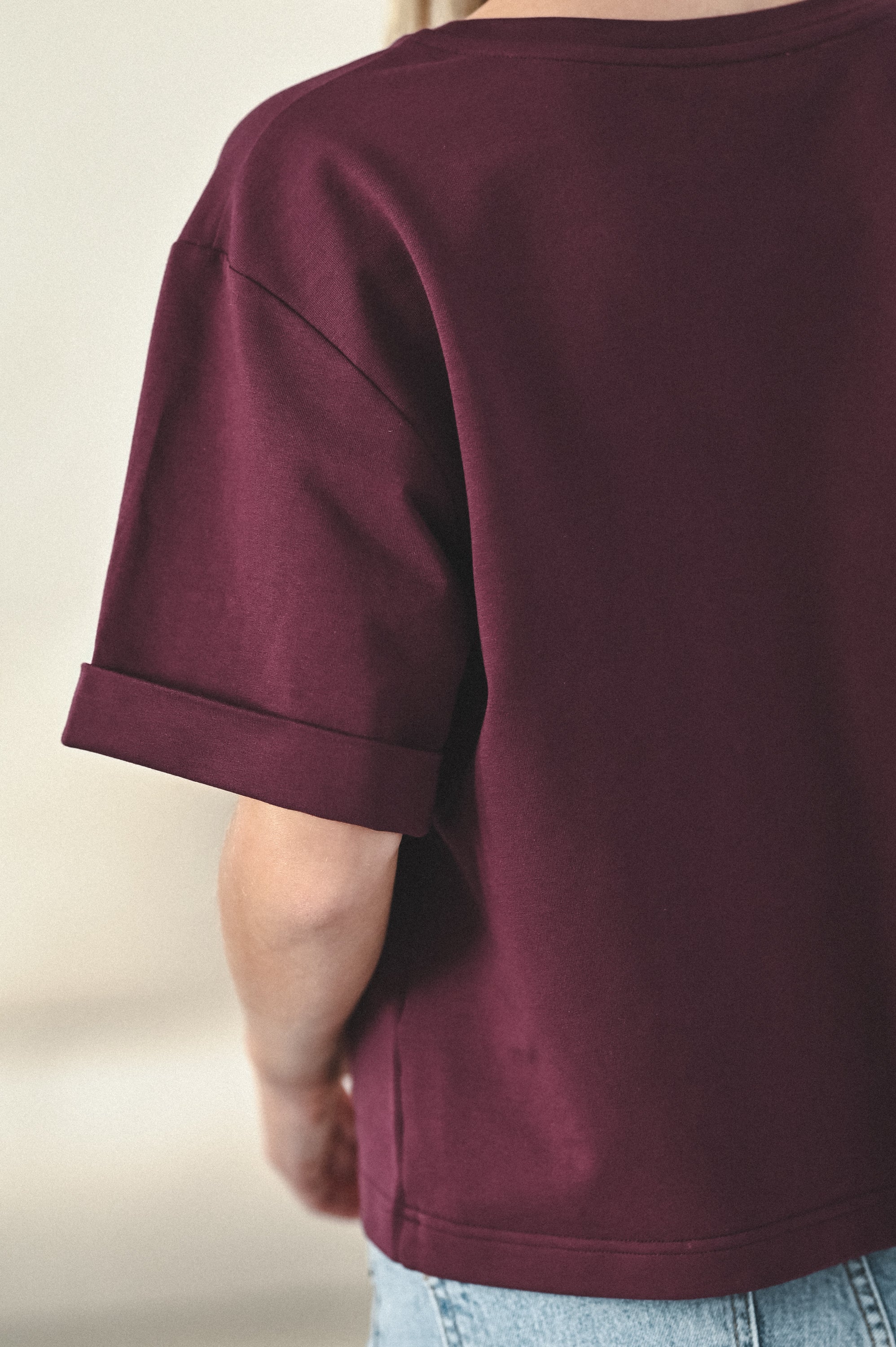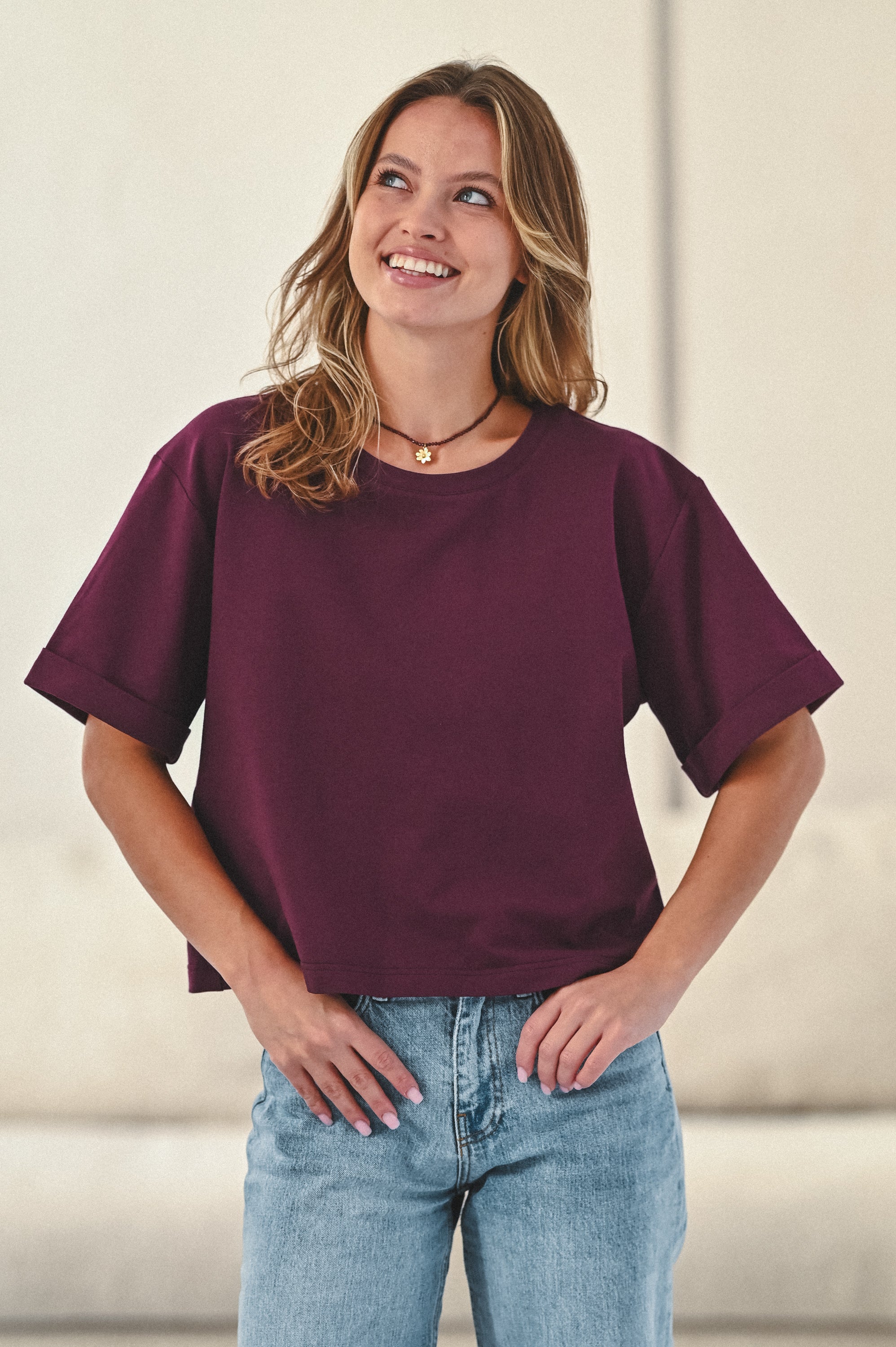 Koszulka wykonana z wysokiej jakości bawełny, która jest wyjątkowo przyjemna dla skóry, zapewniając komfort przez cały dzień. Charakteryzuje się prostym, luźnym fasonem o pudełkowym kroju, który swobodnie układa się na sylwetce. Krótkie rękawy są stylowo podwinięte, co dodaje jej lekkości i modowego charakteru. Niewielki, okrągły dekolt doskonale komponuje się z resztą fasonu, tworząc harmonijną całość. Na przodzie koszulki znajduje się uroczy nadruk wykonany metodą sitodruku, co gwarantuje trwałość wzoru. To idealna baza do tworzenia wielu stylizacji przez cały rok, która sprawdzi się zarówno w casualowych, jak i bardziej eleganckich zestawieniach.