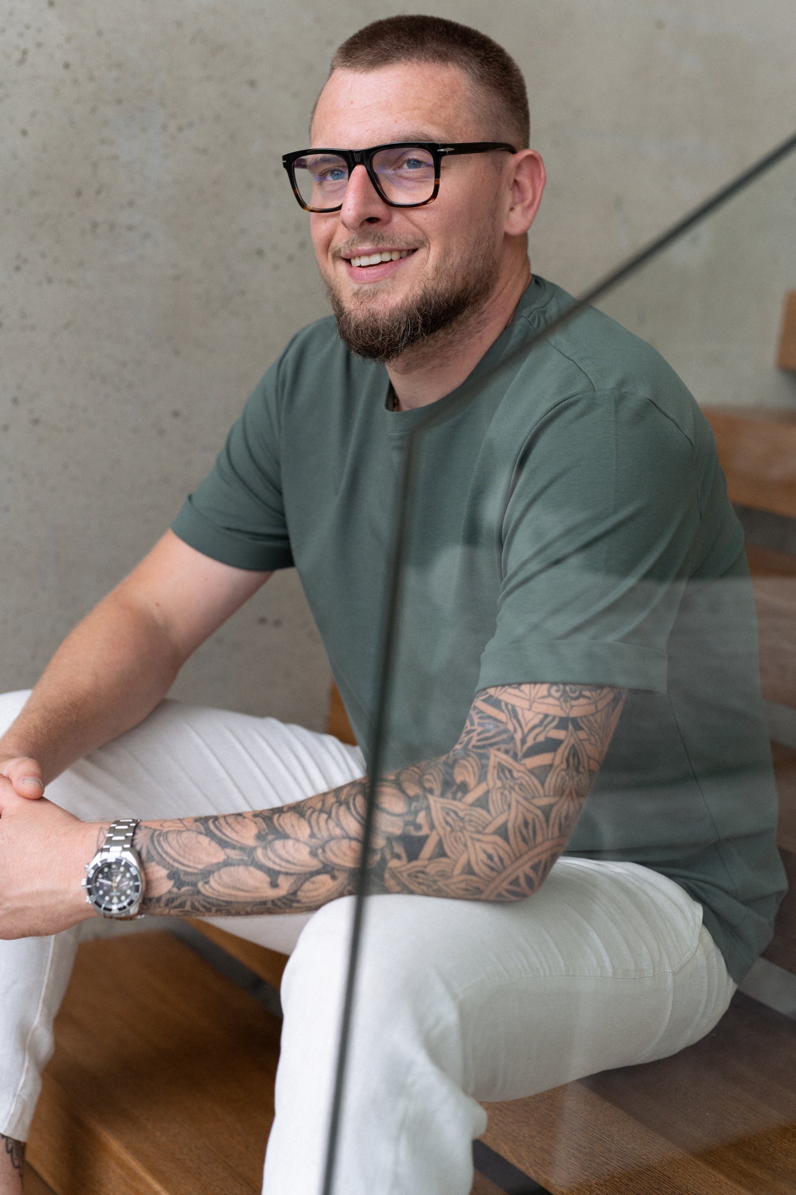 Klasyczny męski t-shirt o lekko oversizowym kroju, który łączy komfort z modnym wyglądem. Krótkie rękawy z subtelnym wywinięciem oraz okrągły dekolt dodają mu charakteru, a materiał z mięsistej bawełny organicznej z dodatkiem elastanu zapewnia wygodę i swobodę ruchów. Dzięki swojej uniwersalności, doskonale sprawdzi się jako baza do wielu stylizacji przez cały rok – od casualowych po bardziej eleganckie. Idealny wybór na co dzień, łączący prostotę z nowoczesnym stylem.