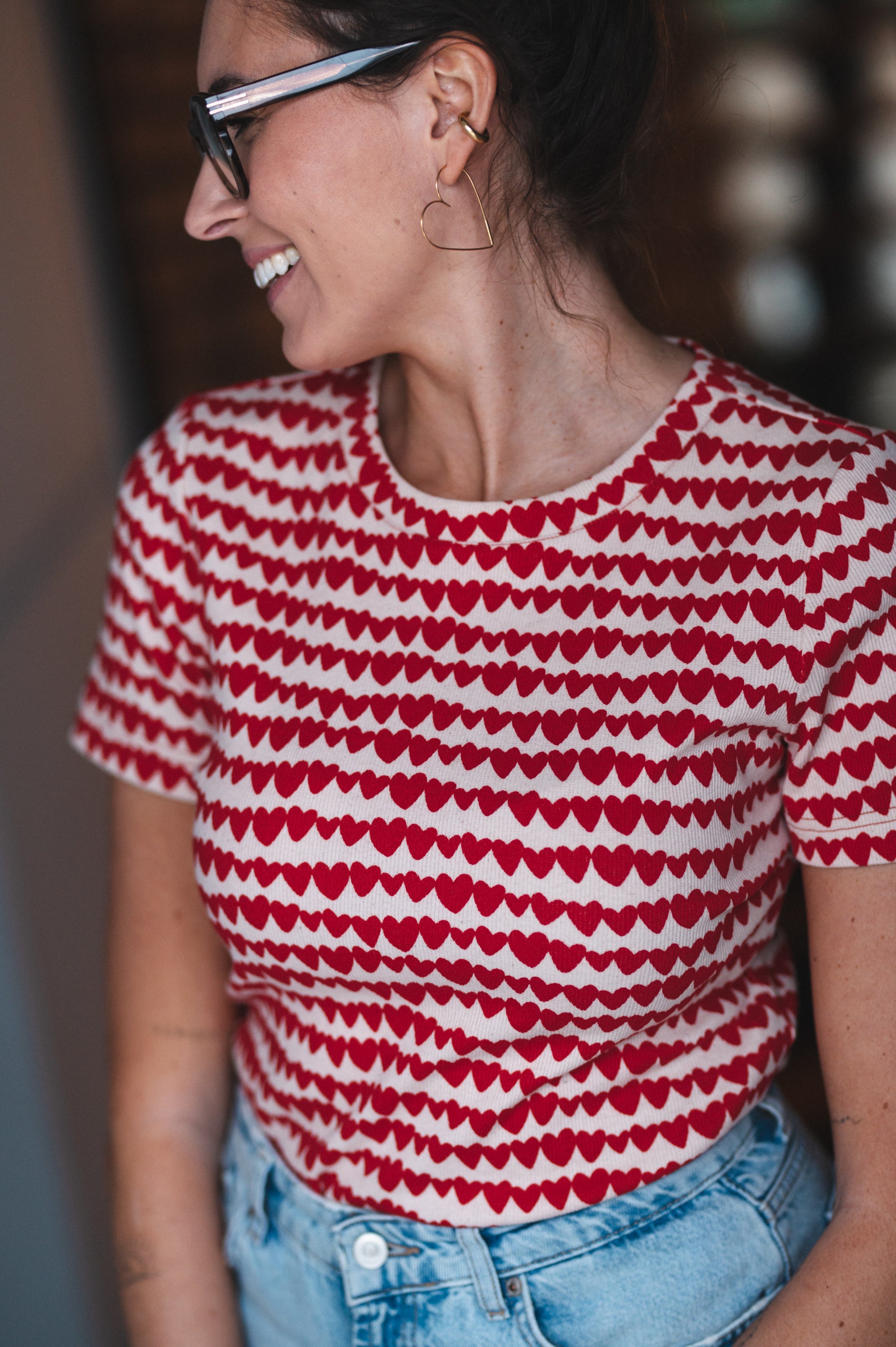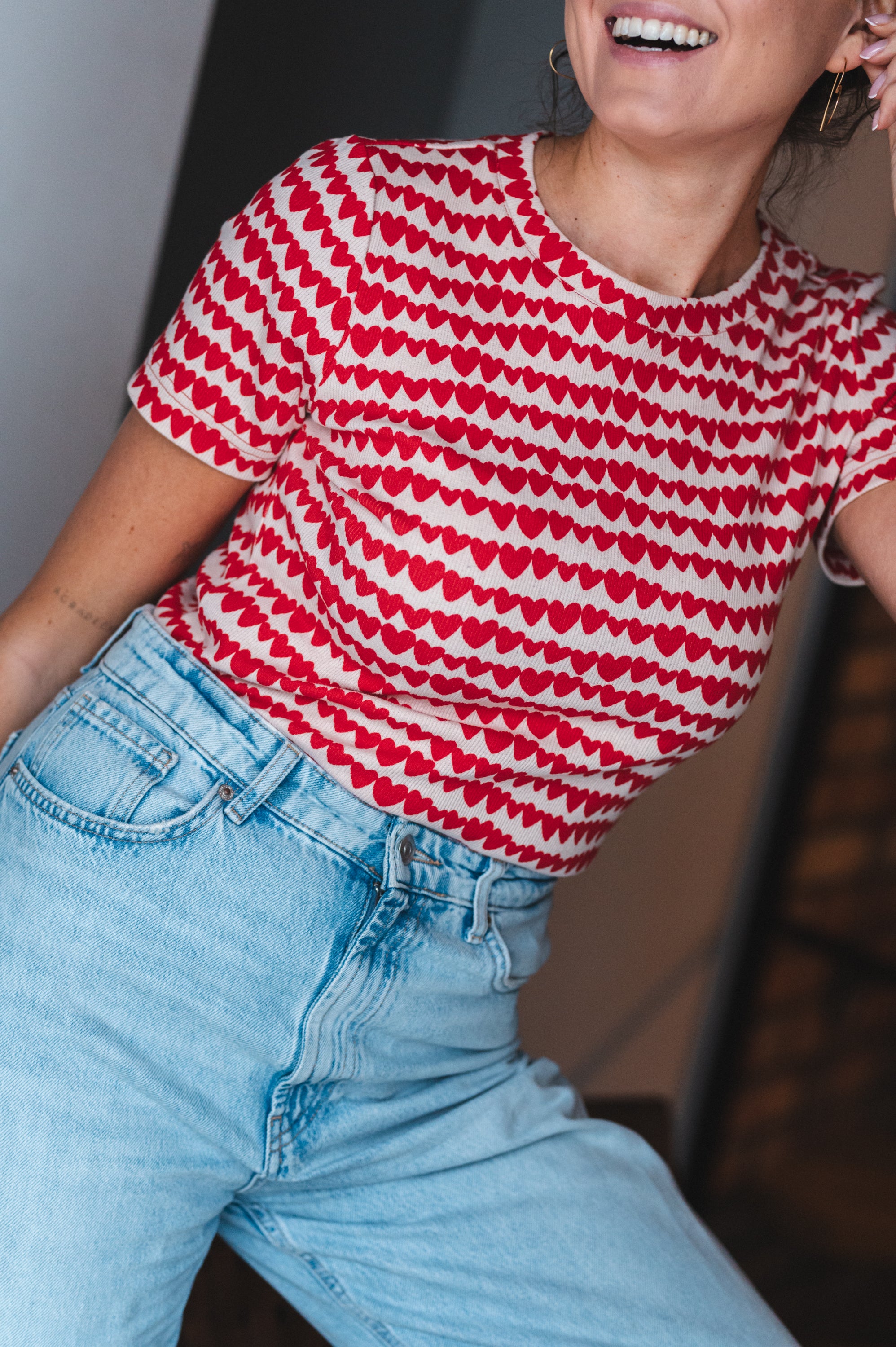 Miękki, prążkowany t-shirt, który subtelnie podkreśla sylwetkę i dodaje codziennej stylizacji lekkiego uroku. Delikatny, okrągły dekolt i krótkie rękawy nadają mu naturalnej swobody, a nieregularny nadruk w serduszka wprowadza romantyczny, dziewczęcy akcent, który sprawia, że zwykły dzień staje się odrobinę przyjemniejszy i bardziej kolorowy.