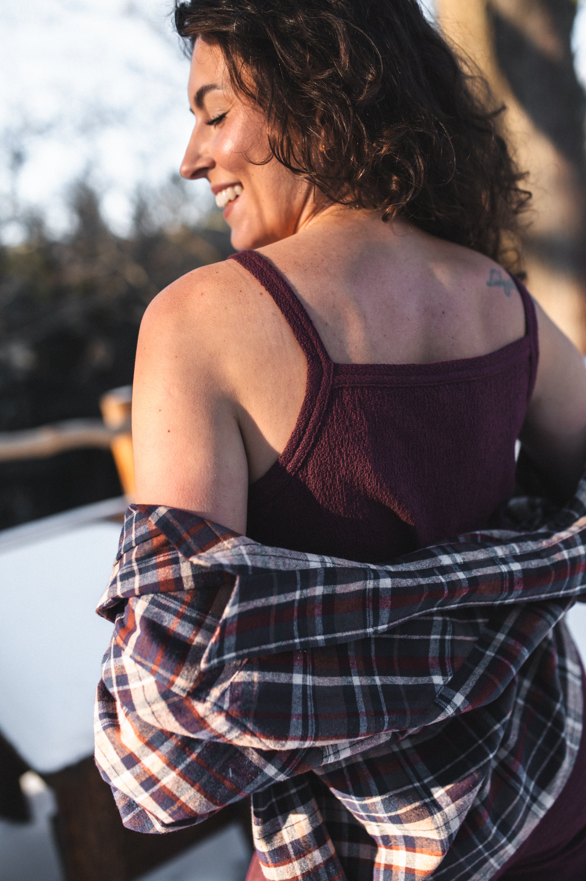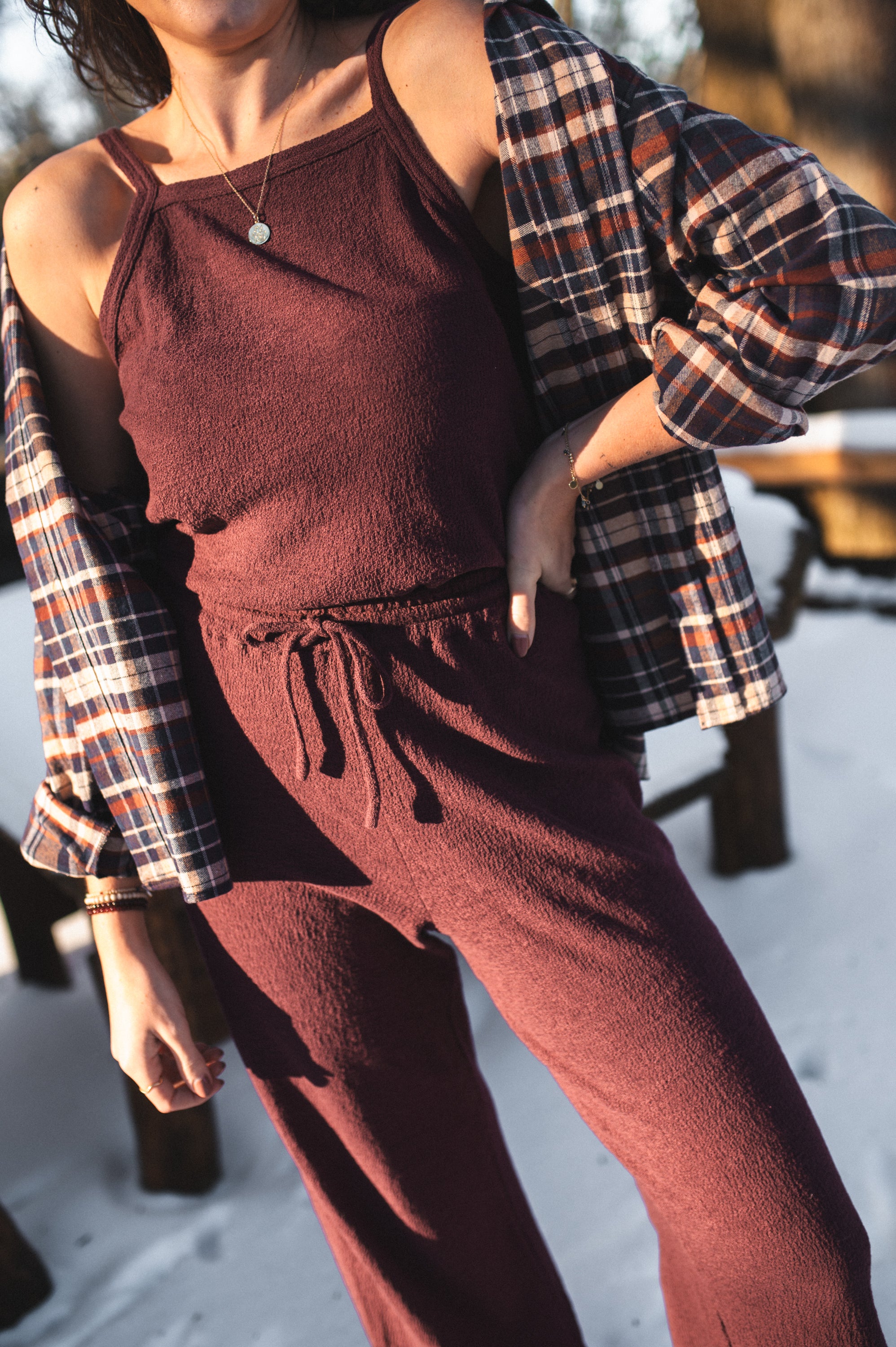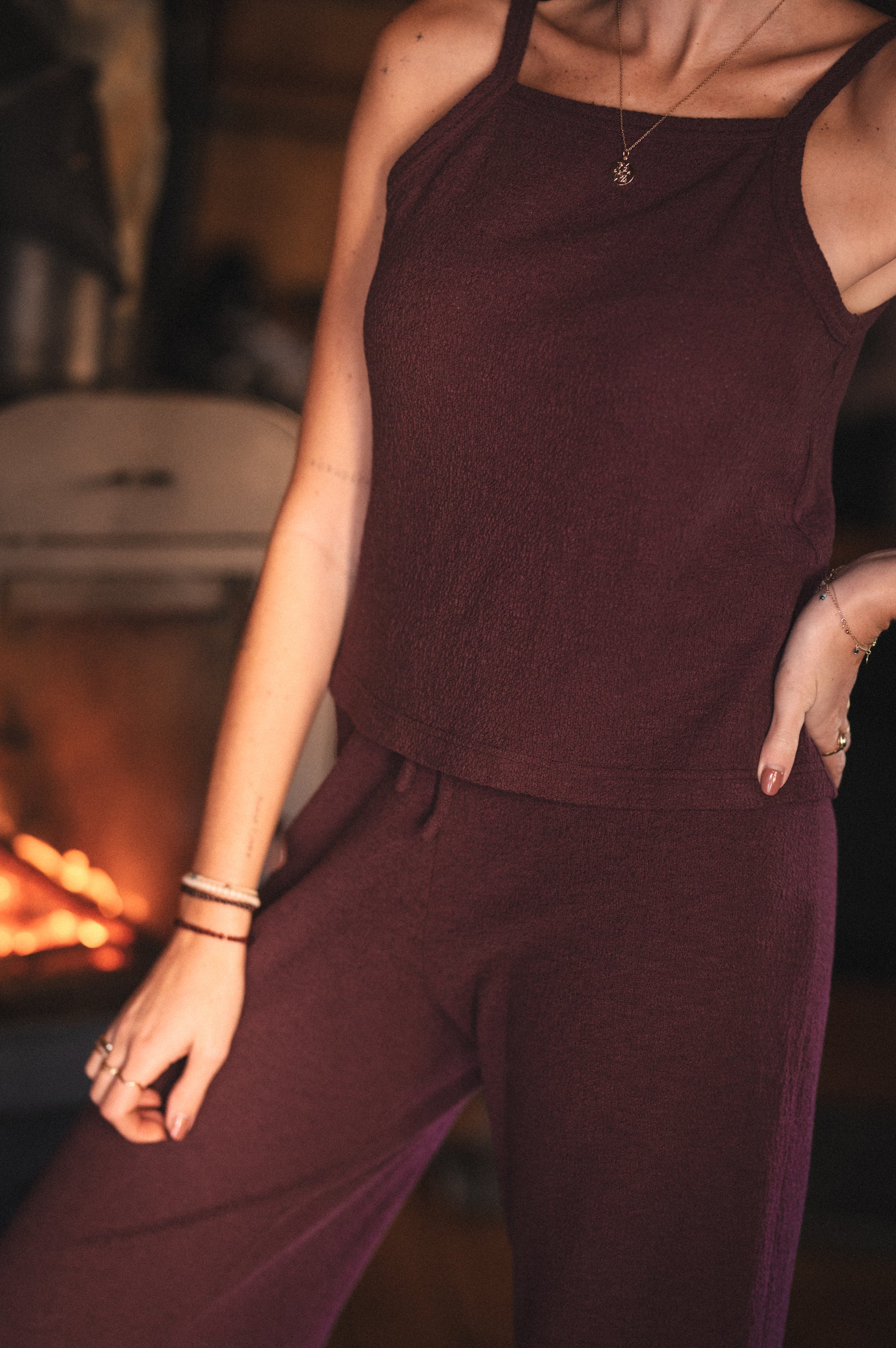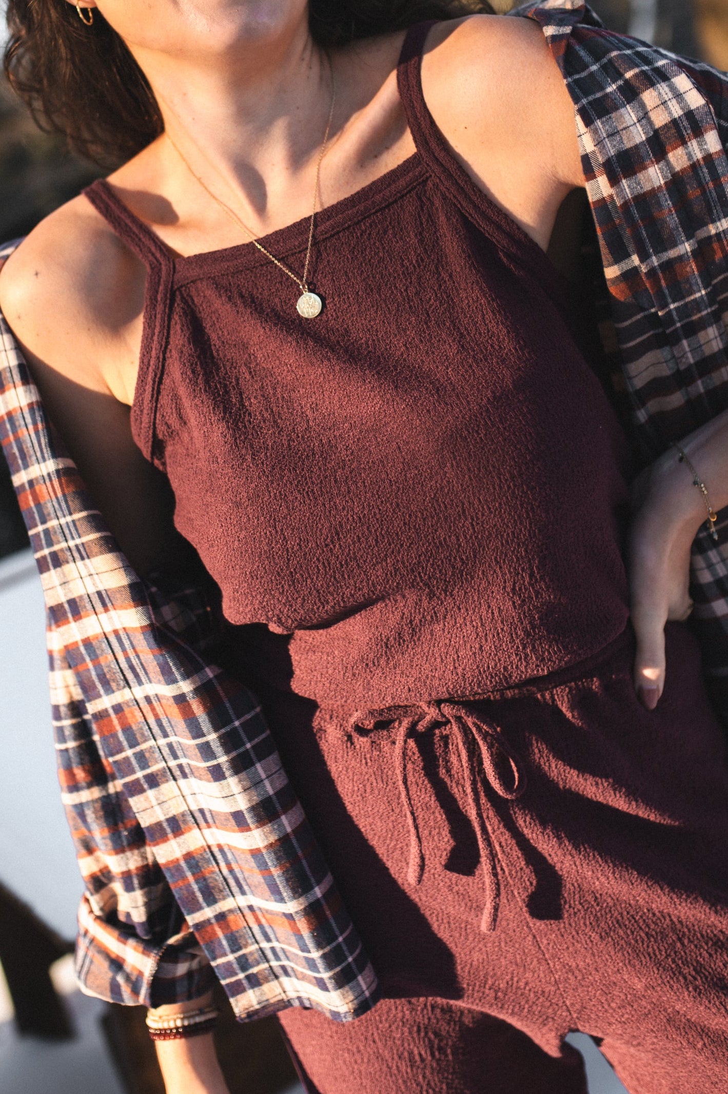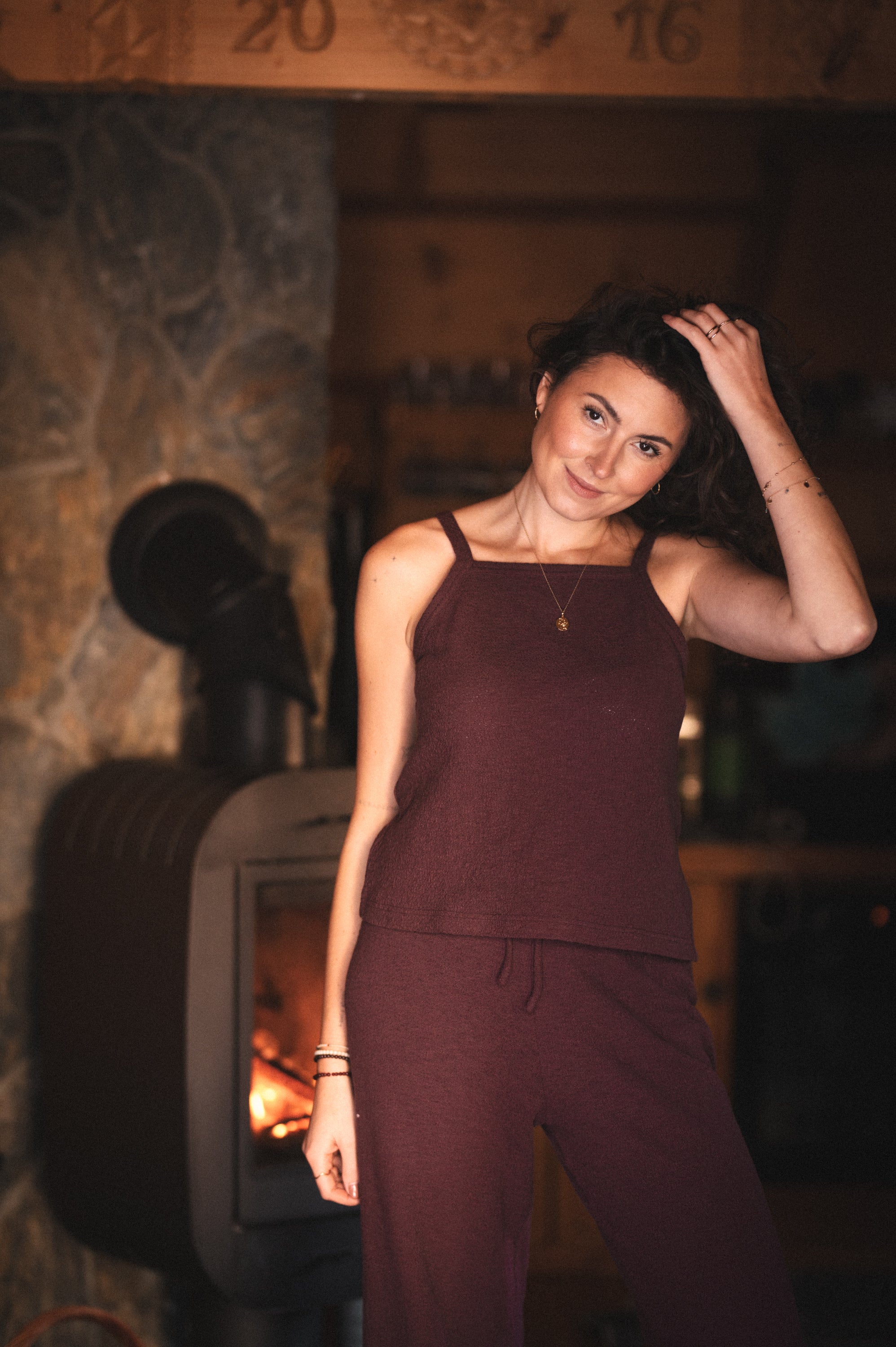 Top na cienkich ramiączkach o delikatnie halterowym kroju i prostym, klasycznym fasonie. Uszyty z miękkiej bawełnianej dzianiny, która zapewnia komfort noszenia i swobodę ruchów. Minimalistyczna forma sprawia, że top świetnie sprawdzi się zarówno samodzielnie, jak i jako baza do warstwowych stylizacji. Tworzy spójny, idealnie dobrany zestaw ze spodniami **Emilia** oraz sweterkiem **Amalia**.